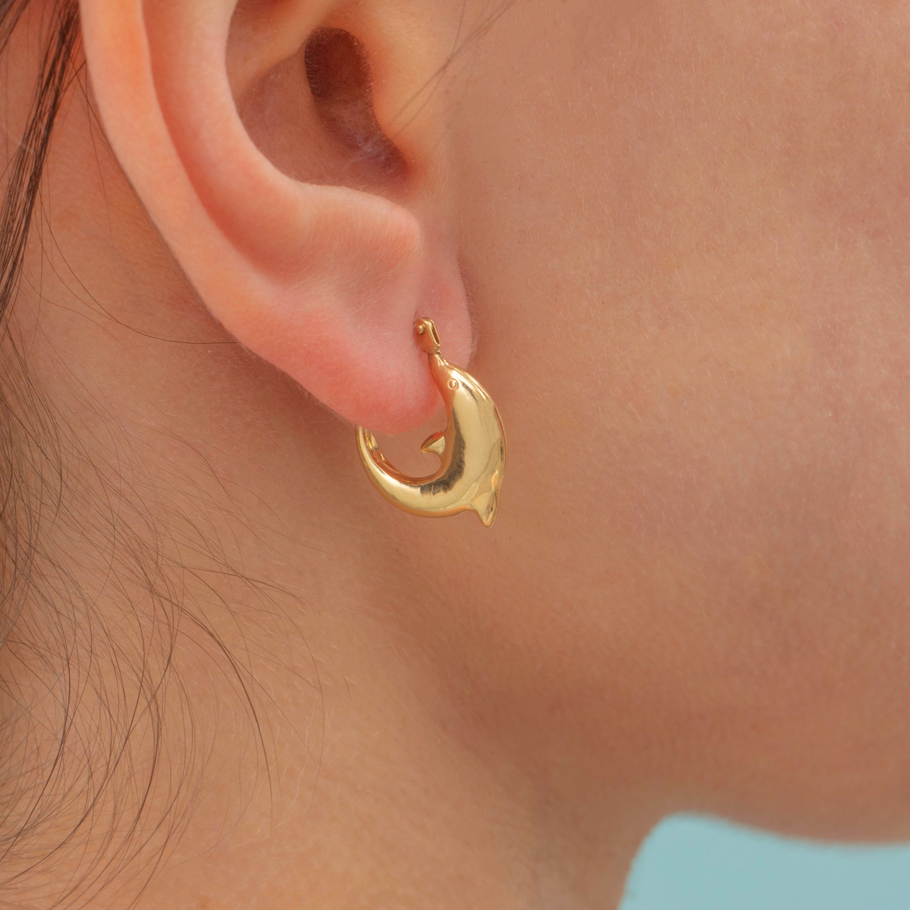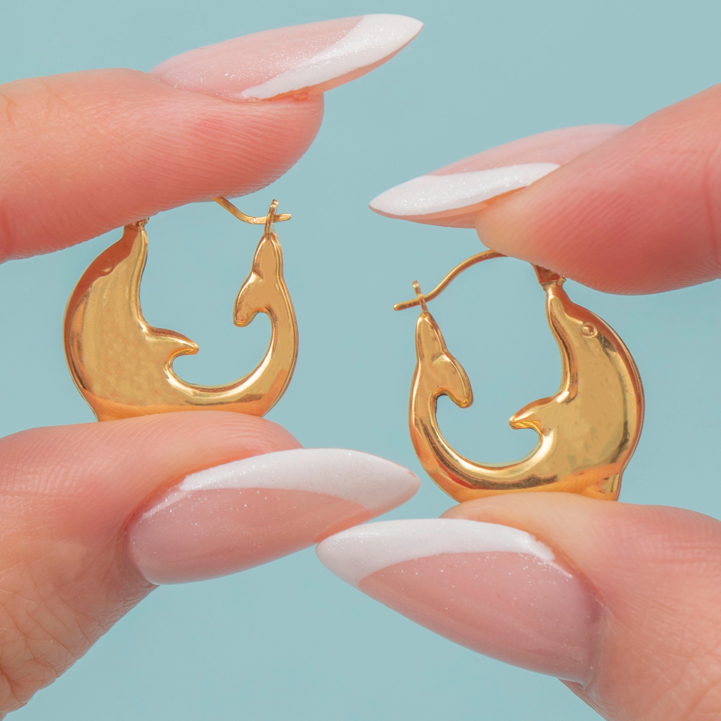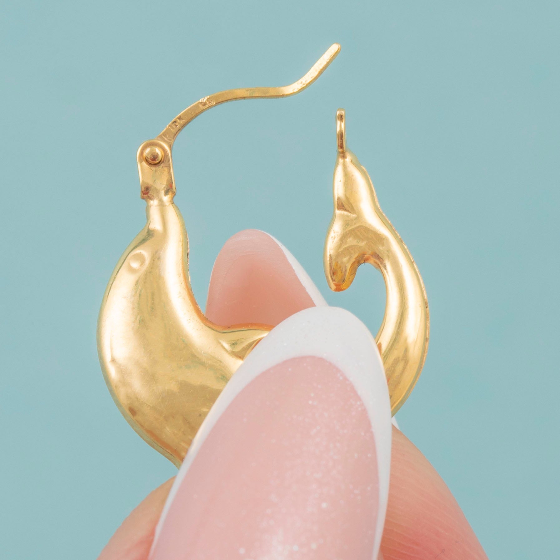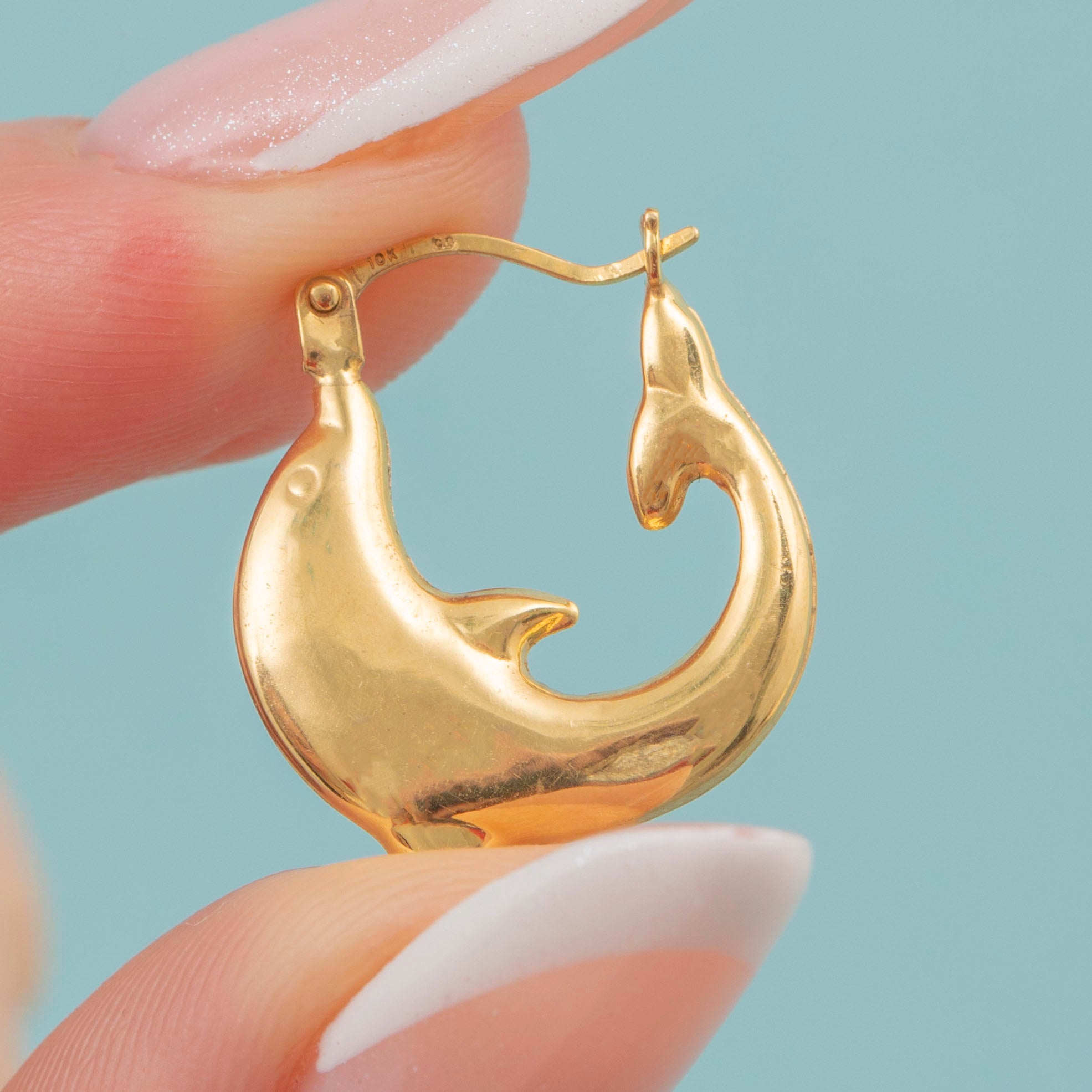 EXCELLENT: These 10ct Gold dolphin hoops are in excellent condition. The Gold is buttery and lustrous, with only very minor surface wear. With secure hooks, you can wear these earrings with confidence.