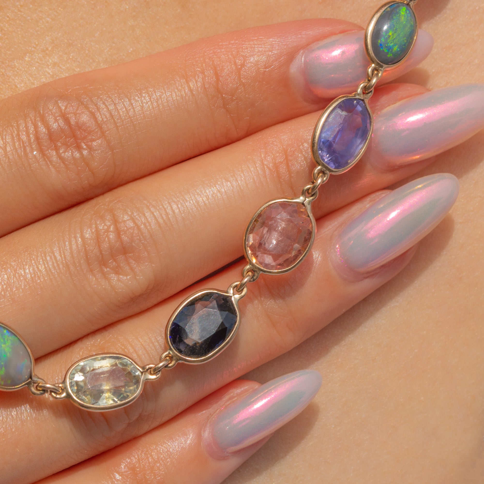 The Sapphires display a spectrum of soft hues—from lilac and lavender to yellow and blue—totalling 26.10 carats combined. Each gemstone is elegantly set within a polished 9ct Gold bezel and connected by a finely crafted links, complete with a large antique bolt ring.
