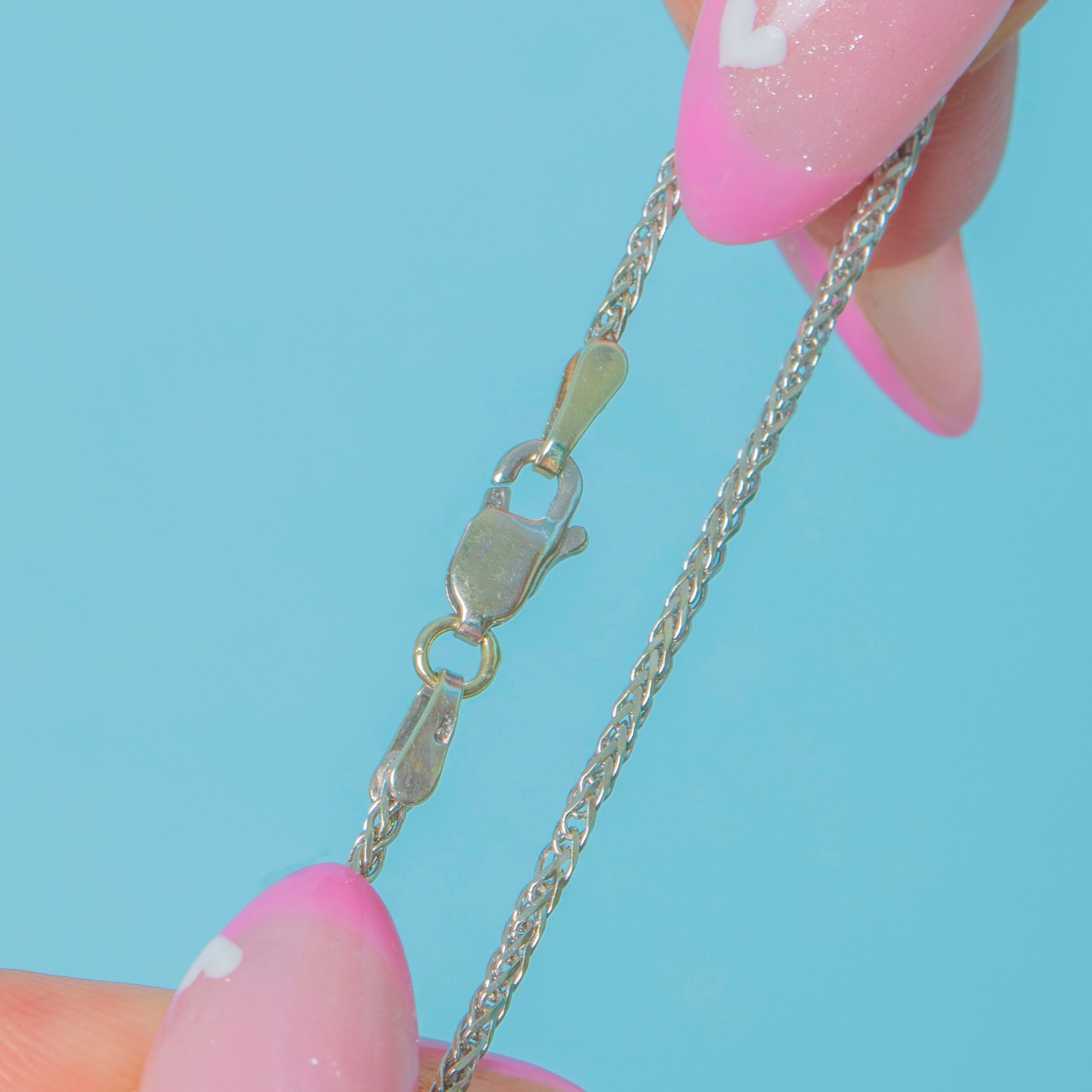 This Vintage 9ct White Gold spiga chain is sleek, refined and effortlessly wearable. Its elegant plaited design catches the light beautifully, giving a soft shimmer that complements both pendants and minimalist styling alike.
