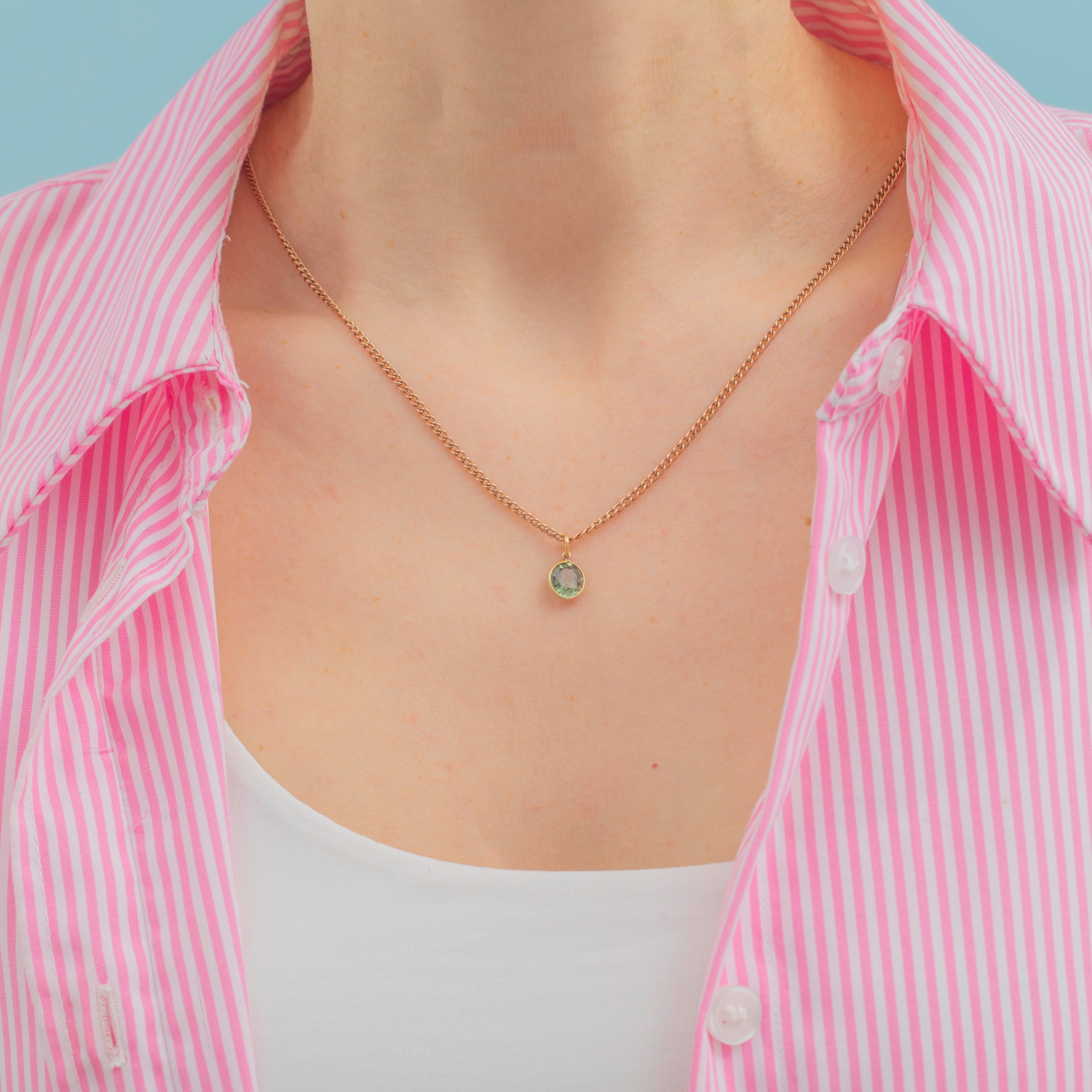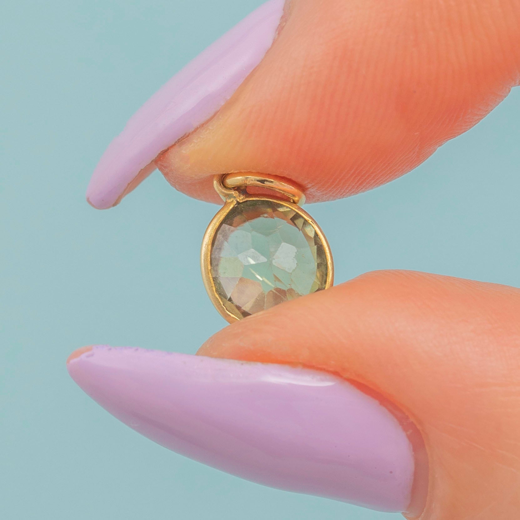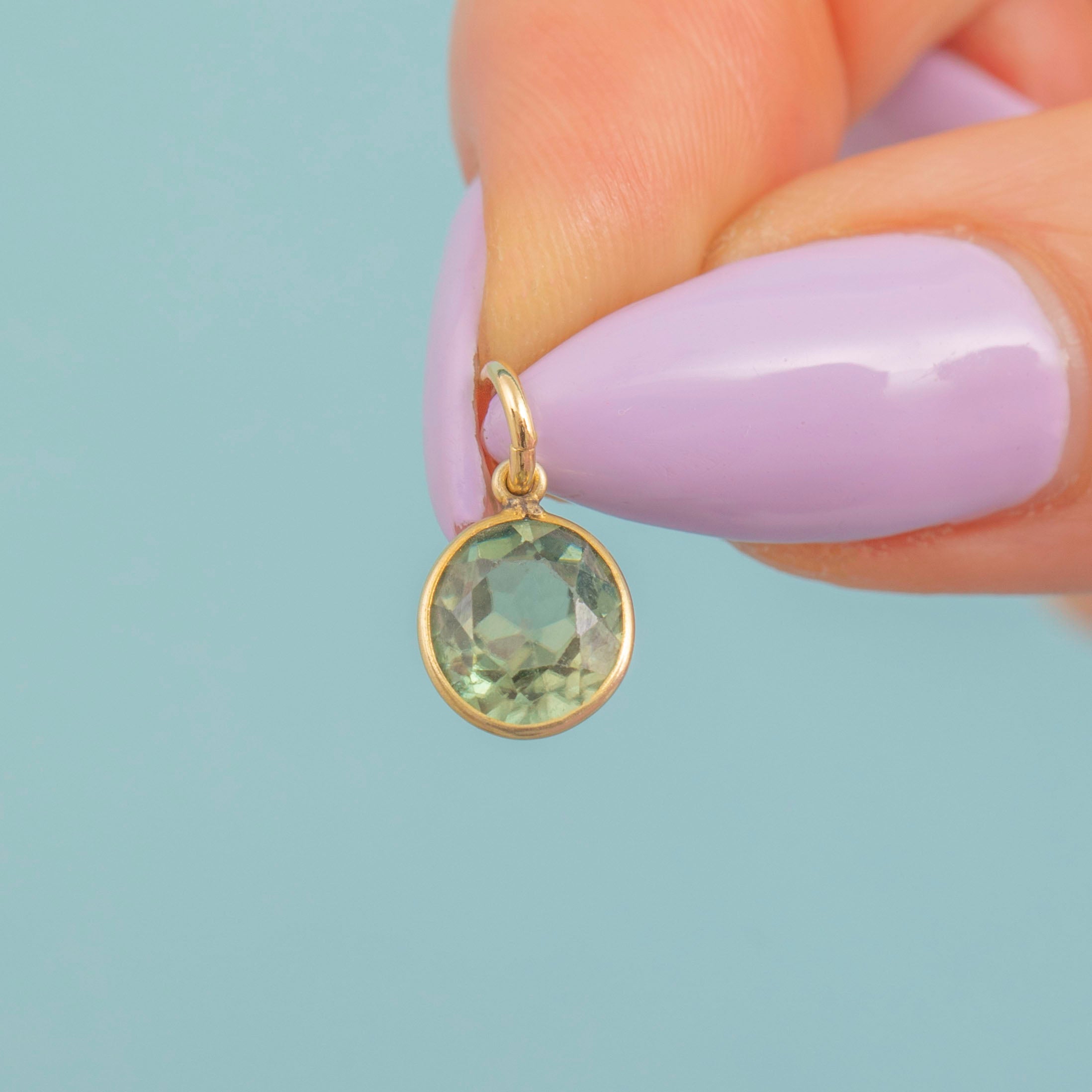 This 14ct Gold Green Zircon bezel-set charm belongs in a deep-sea mermaid's treasure trove. Her blue-green facets shimmer like sunlight glittering on the ocean -she's a breath of fresh air!