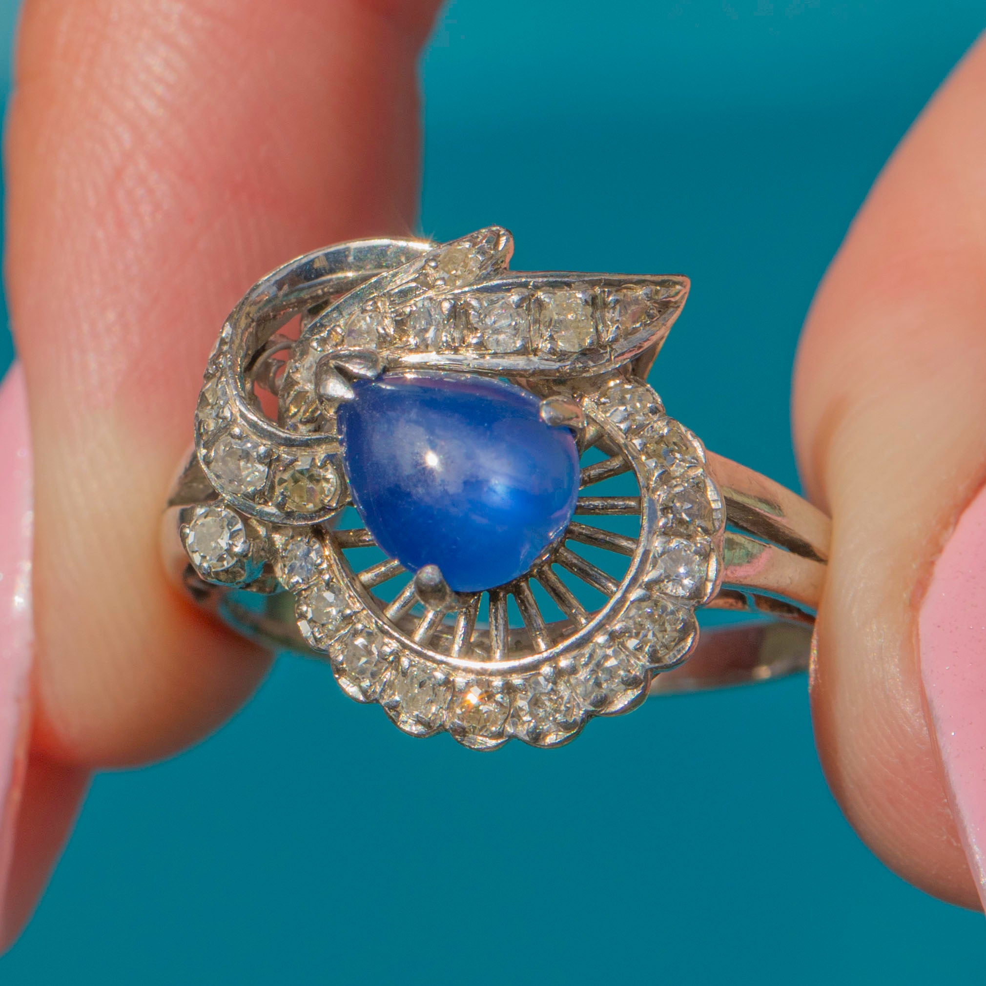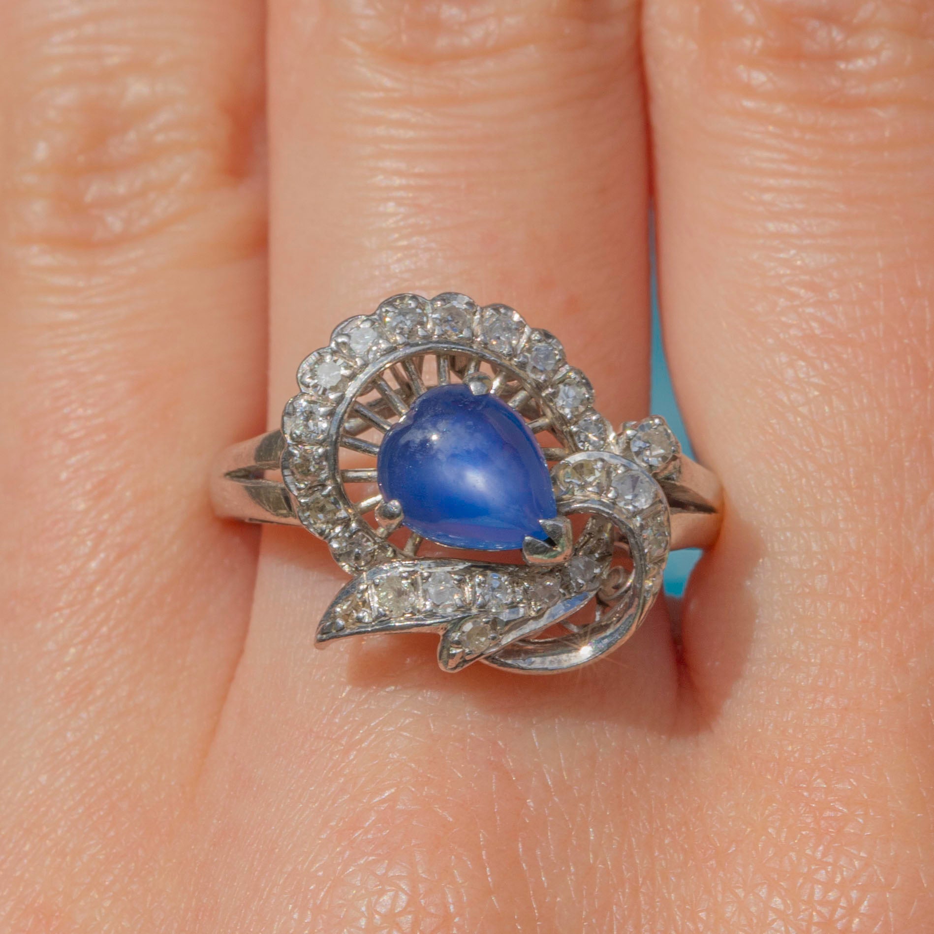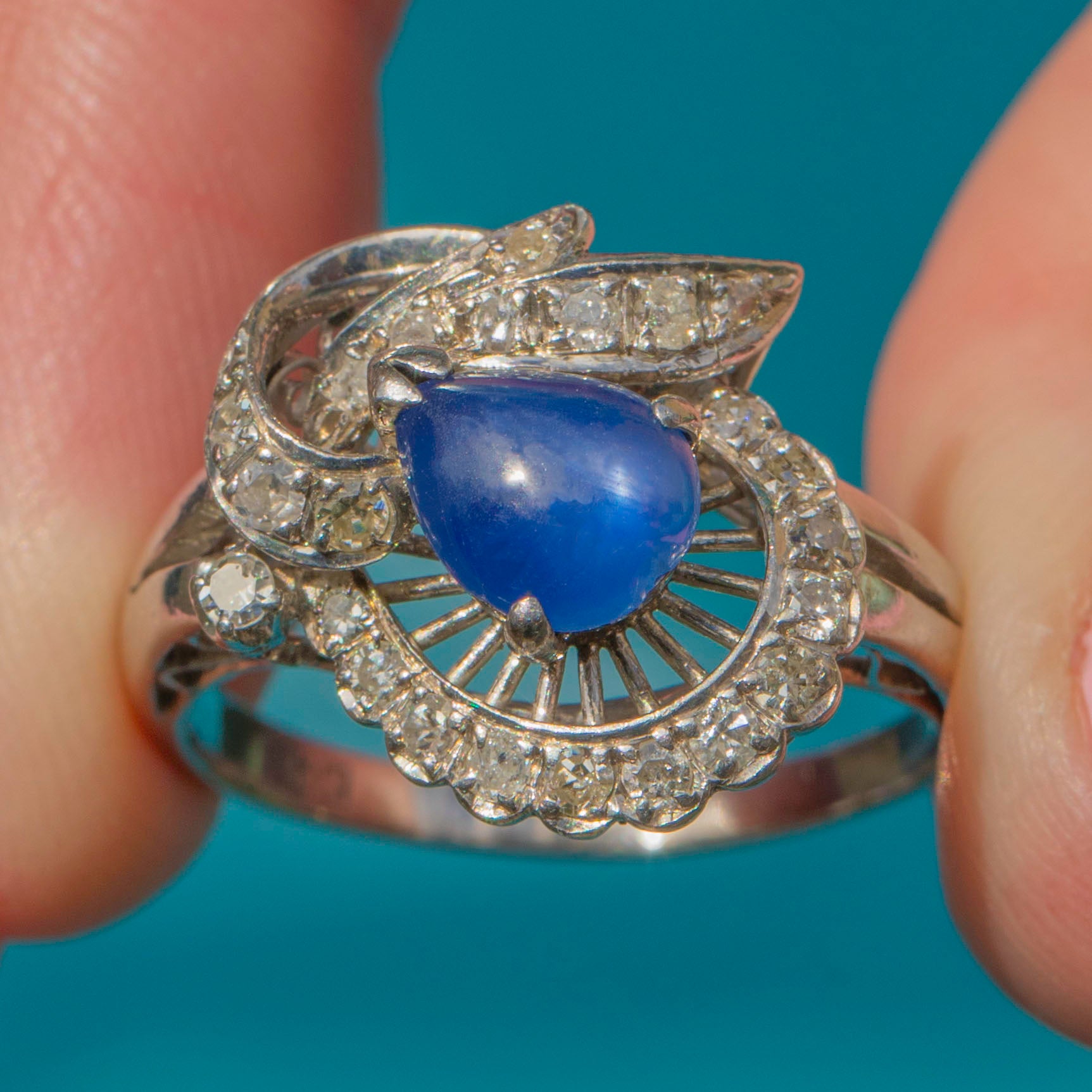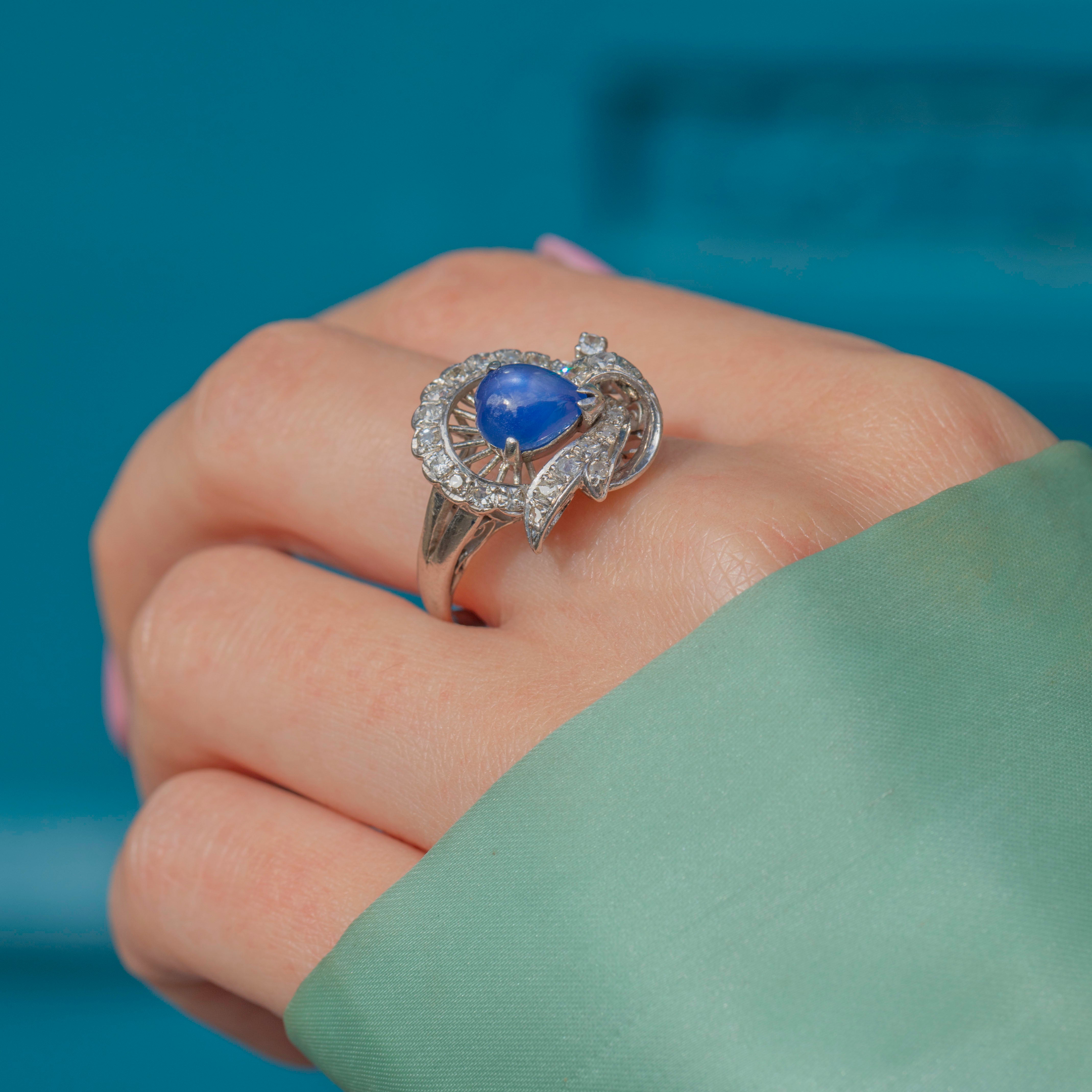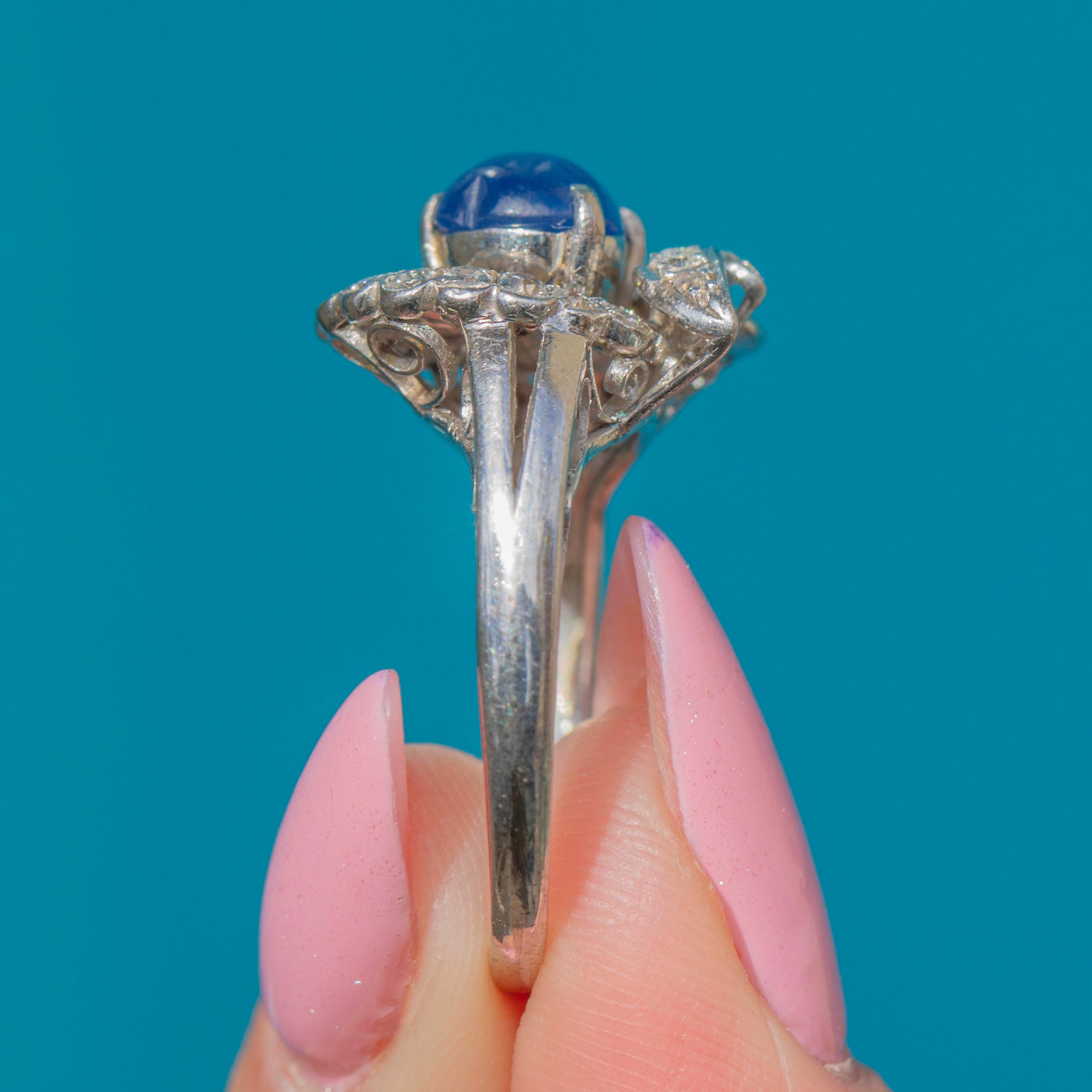 MATERIALS: Tests as 14ct White Gold, Natural bright Blue Star Sapphire (0.55ct), Diamonds (0.35ct).