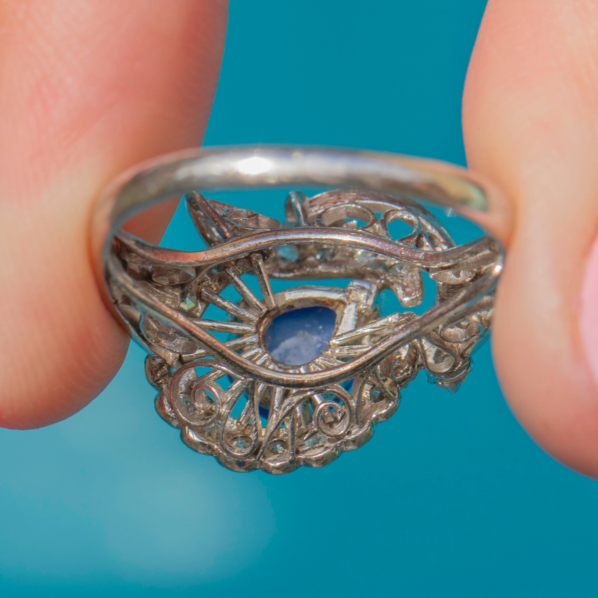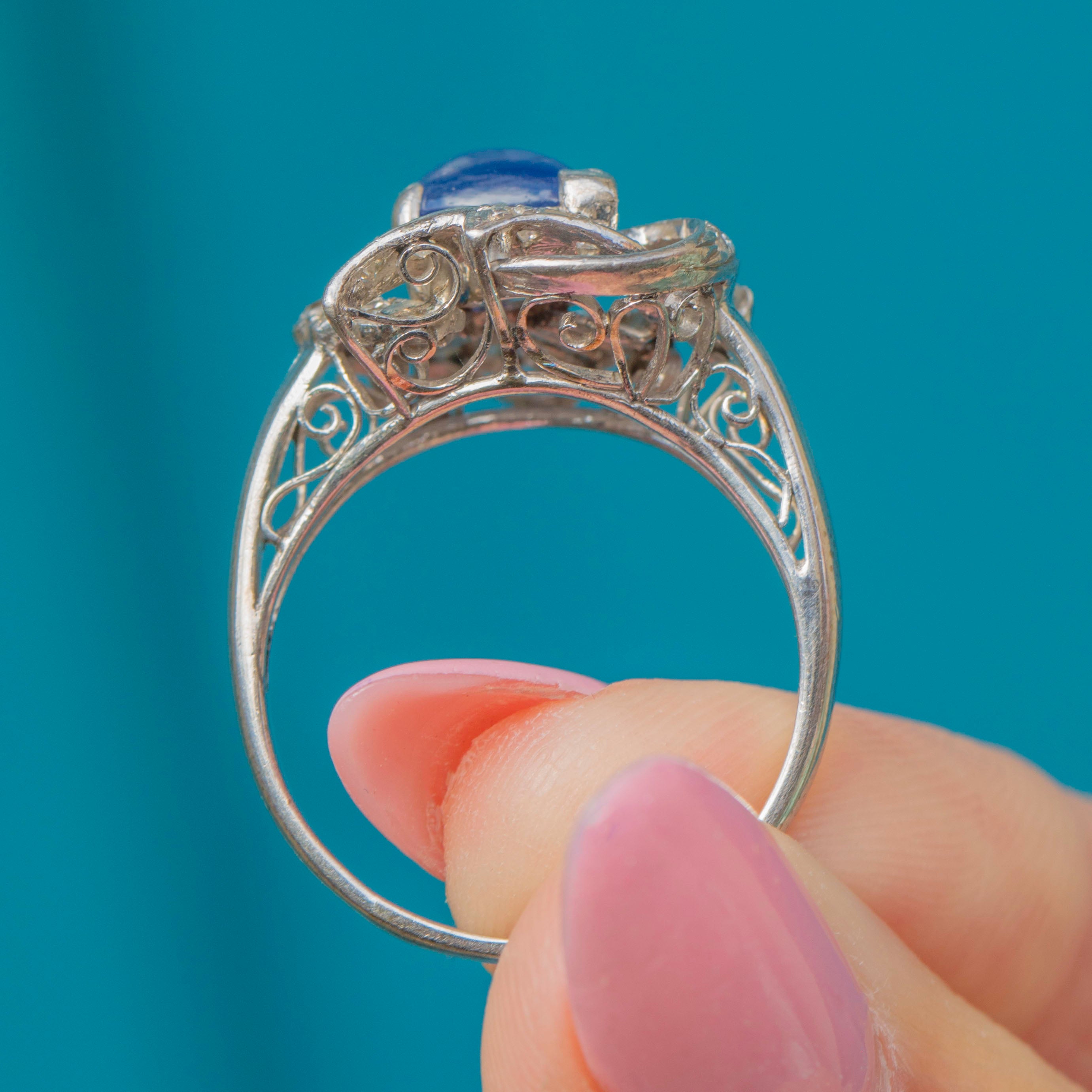 She is encircled by a myriad of scintillating Diamonds, each set within glossy 14ct White Gold, providing an elegant and sophisticated finish. With an intricate swirling gallery, this magnificent vintage ring dazzles from every angle and will make a standout addition to your collection!