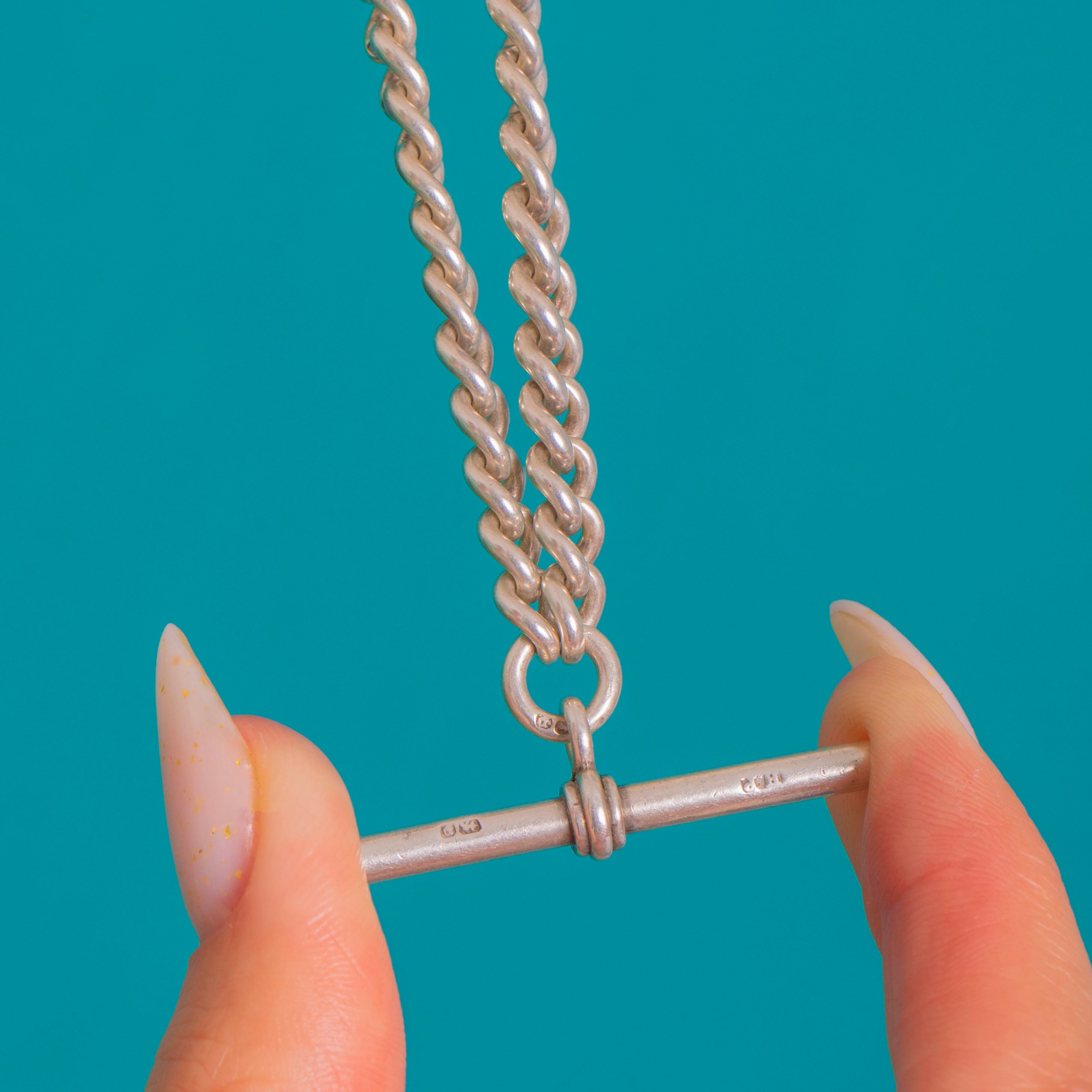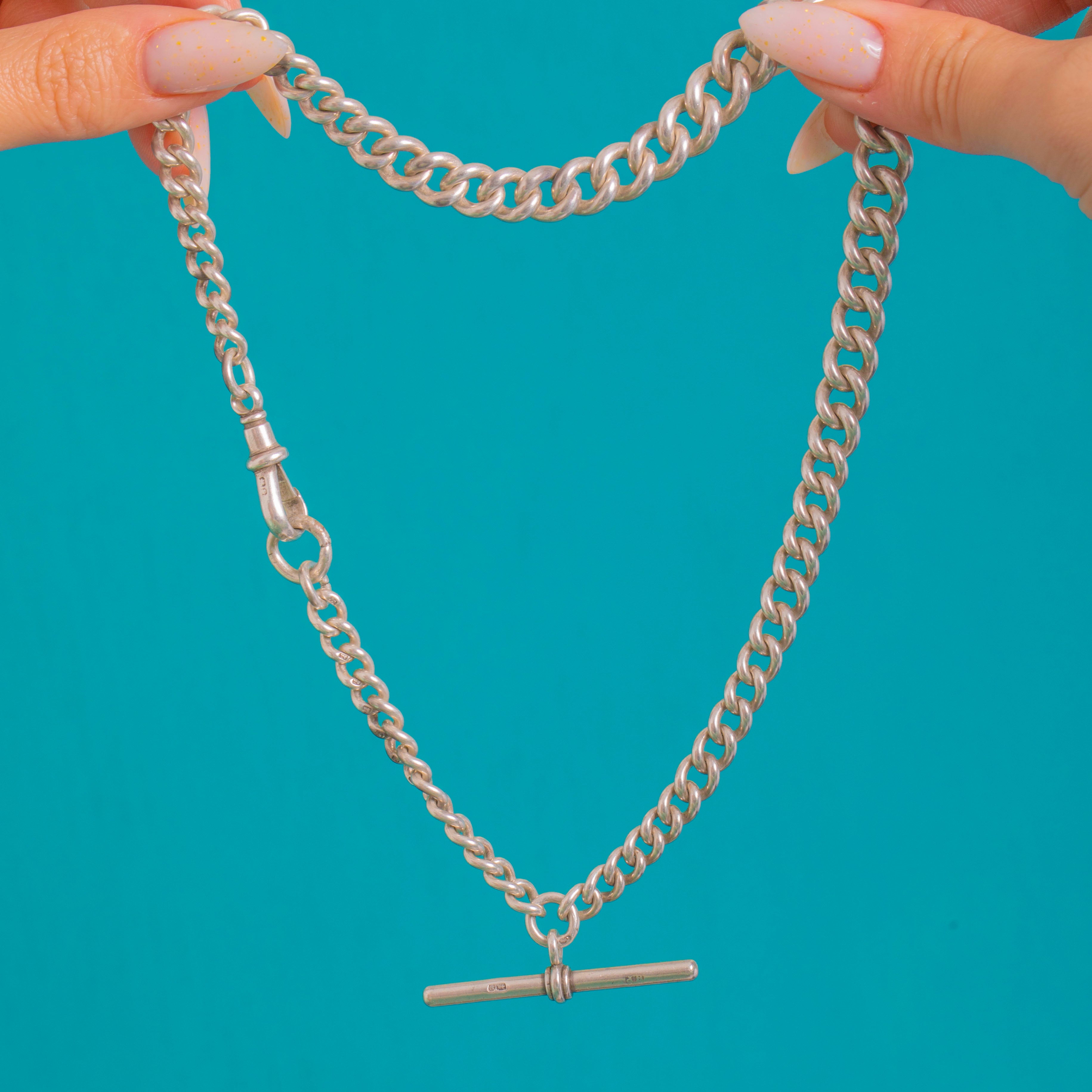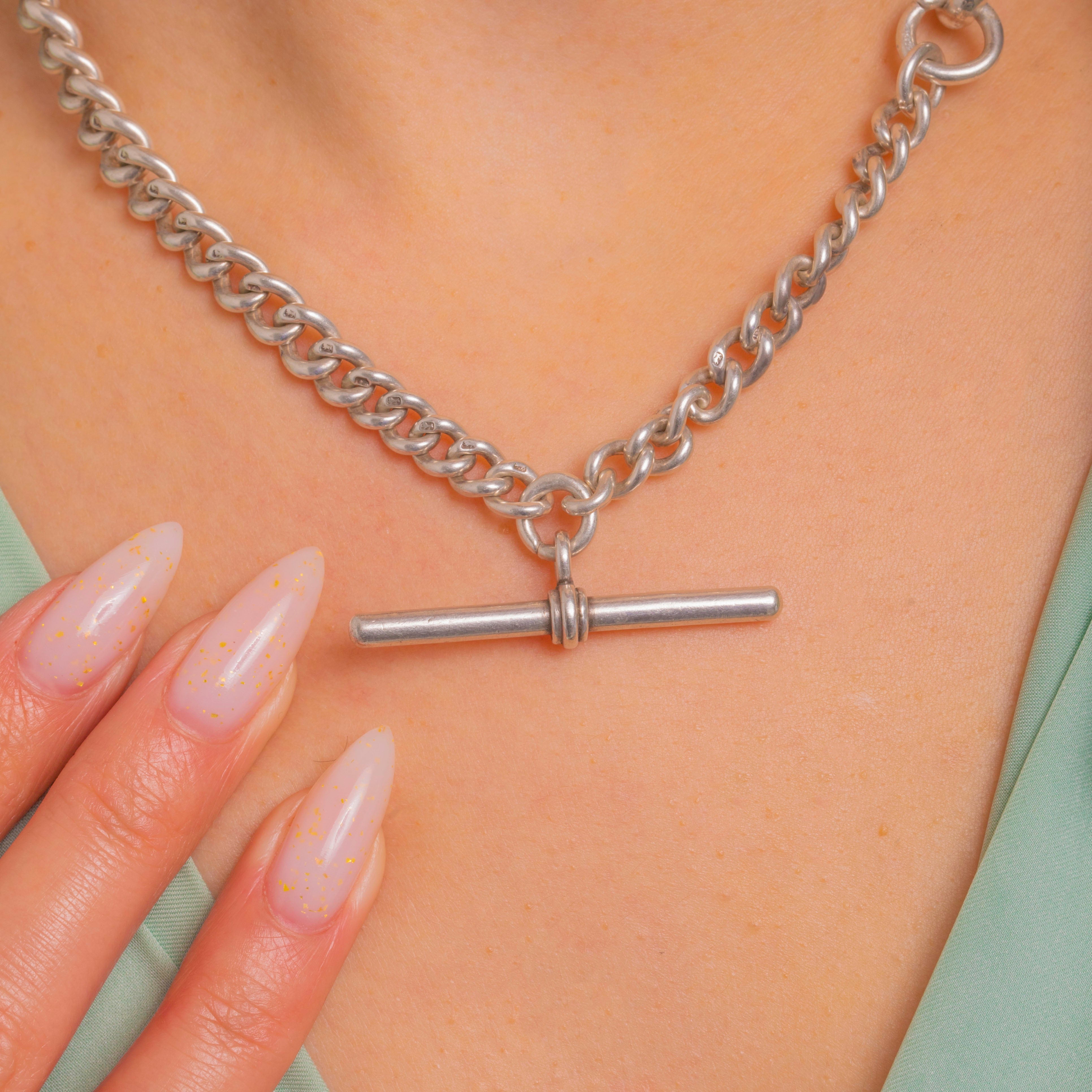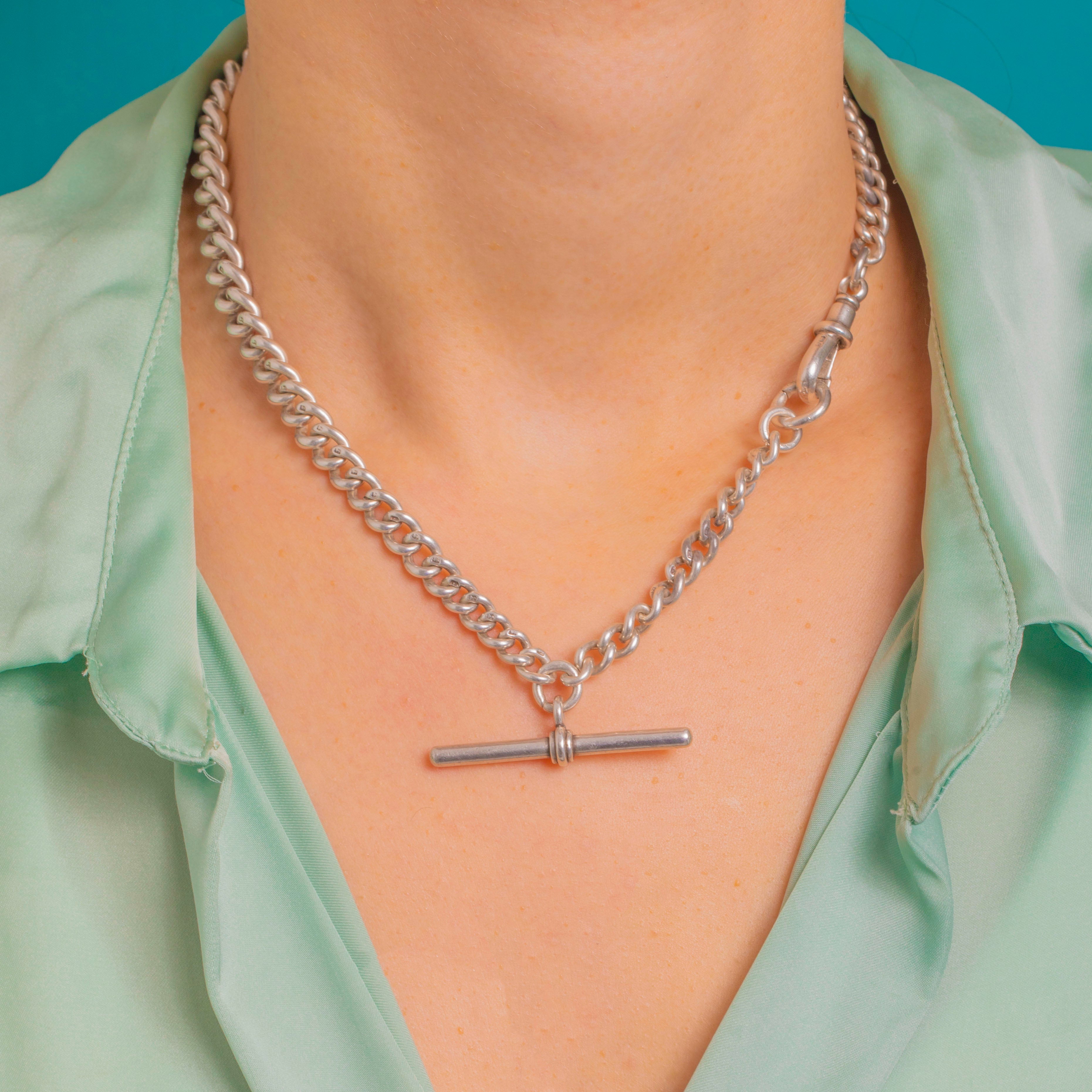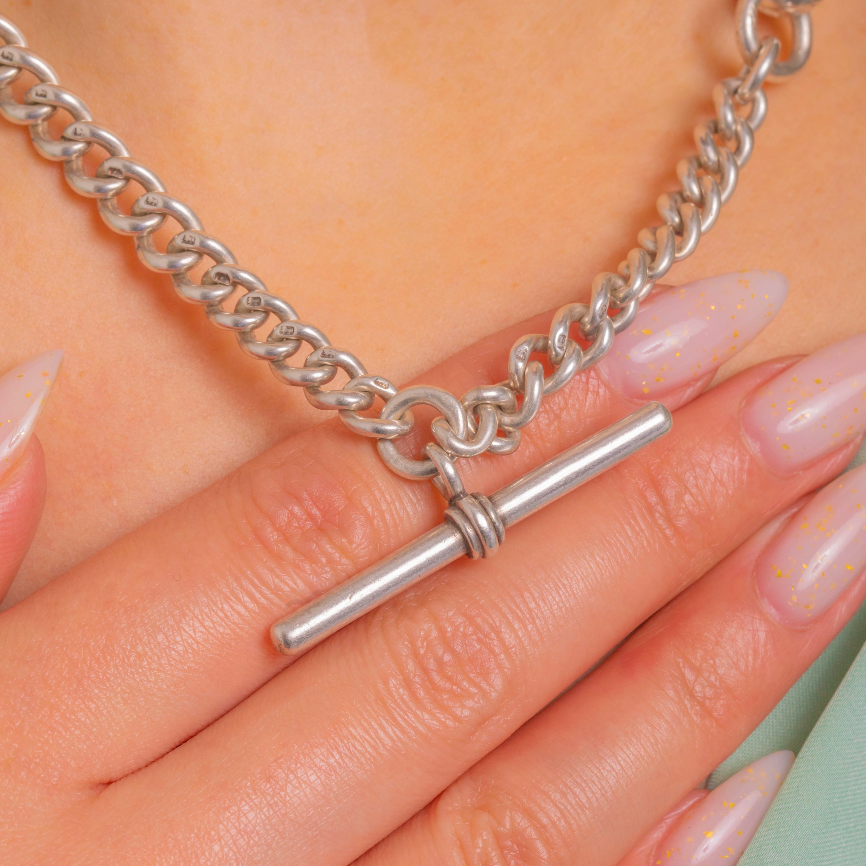 Beautifully made and satisfyingly substantial at 53.2g, this piece is hallmarked on every link and finished with a turned T-bar for that timeless watch-chain silhouette. A wardrobe staple that layers effortlessly and anchors any look with quiet luxury.