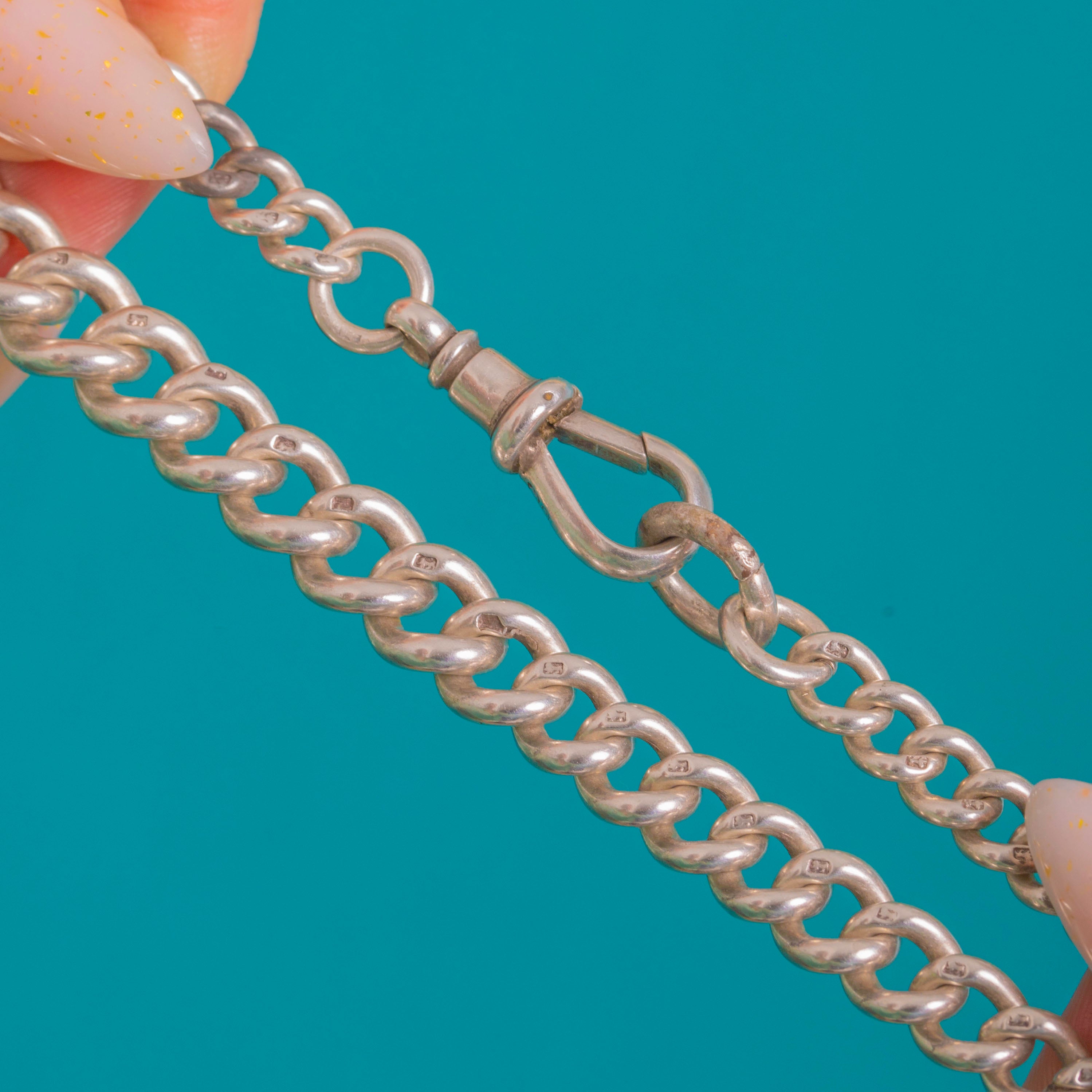 EXCELLENT: Light surface scratches and a soft, even patina commensurate with age; links are even, secure and articulate. Minor edge dings to the T-bar visible under close inspection. A visible solder seam/colour change to the large oval jump ring by the dog clip suggests past soldering; overall the chain presents beautifully and has been well cared for.