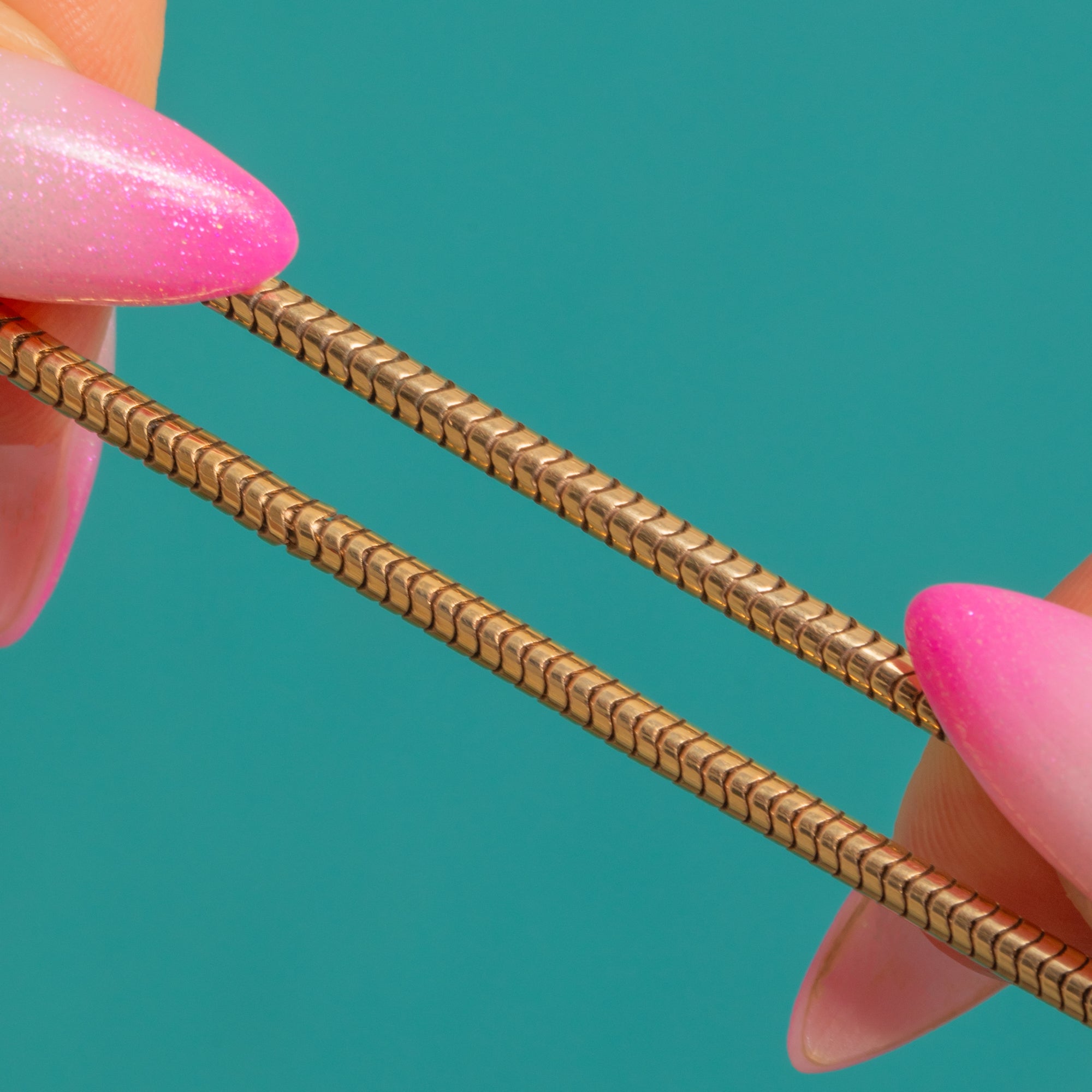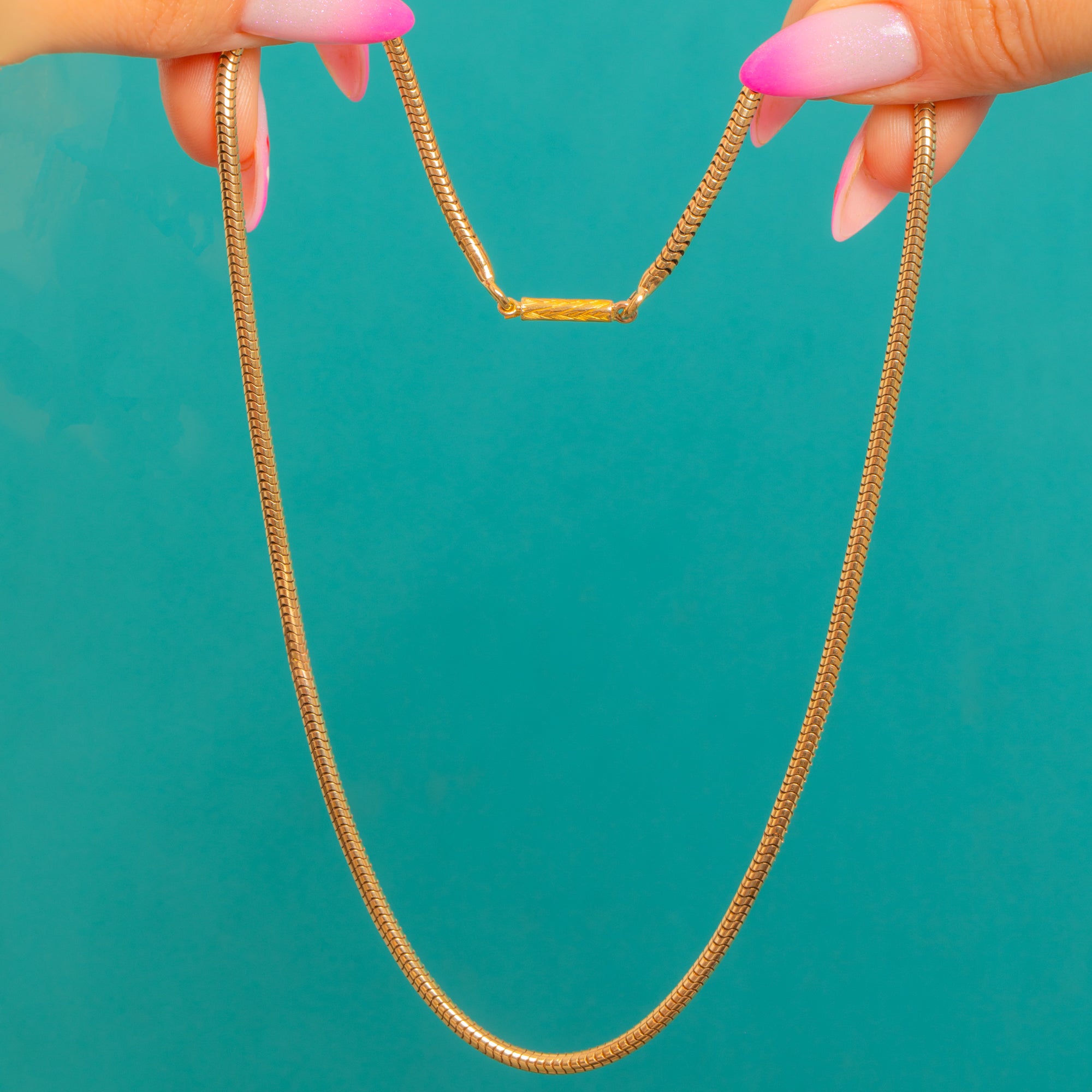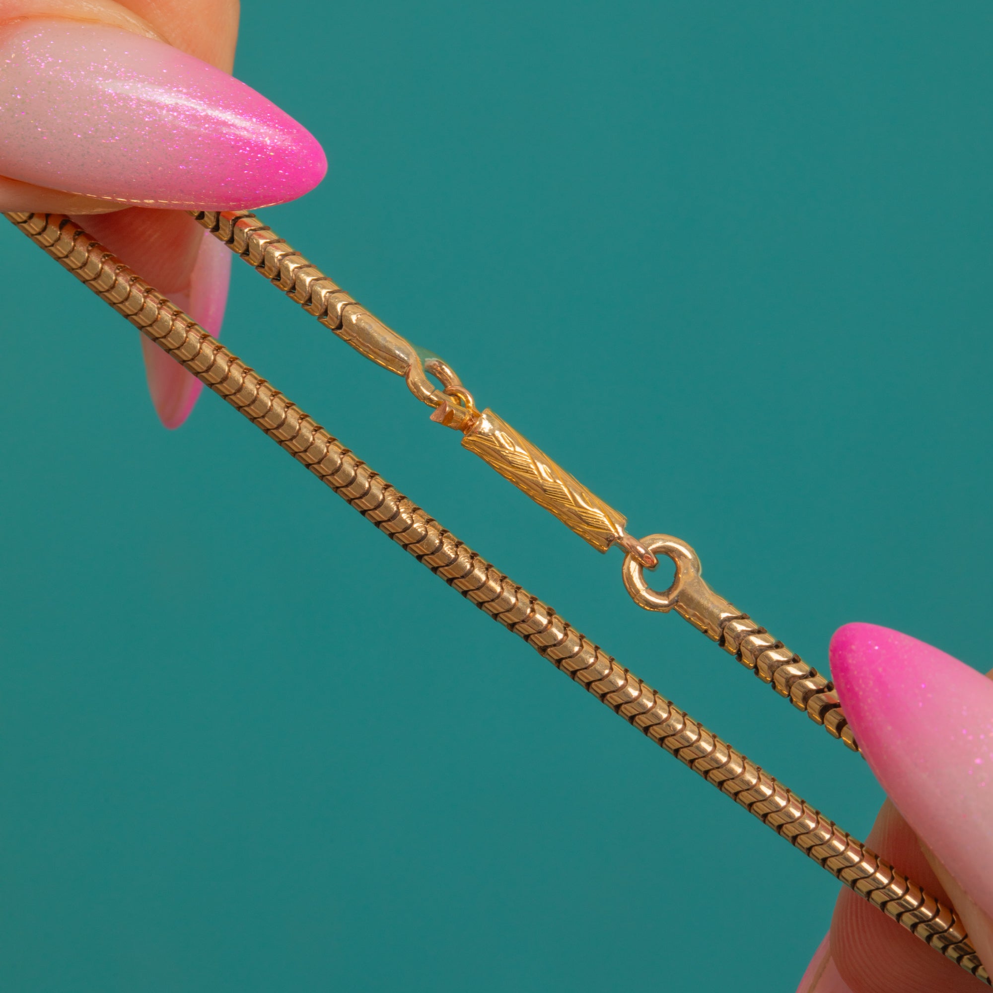A sleek Early 20th Century 9ct Gold snake chain, this elegant beauty flows like liquid light at the collar. Its closely articulated links create a smooth, mirror-like sheen that sits flush against the skin for a refined, streamlined look. Understated yet unmistakably luxurious, it’s stunning worn alone and perfectly poised for layering.