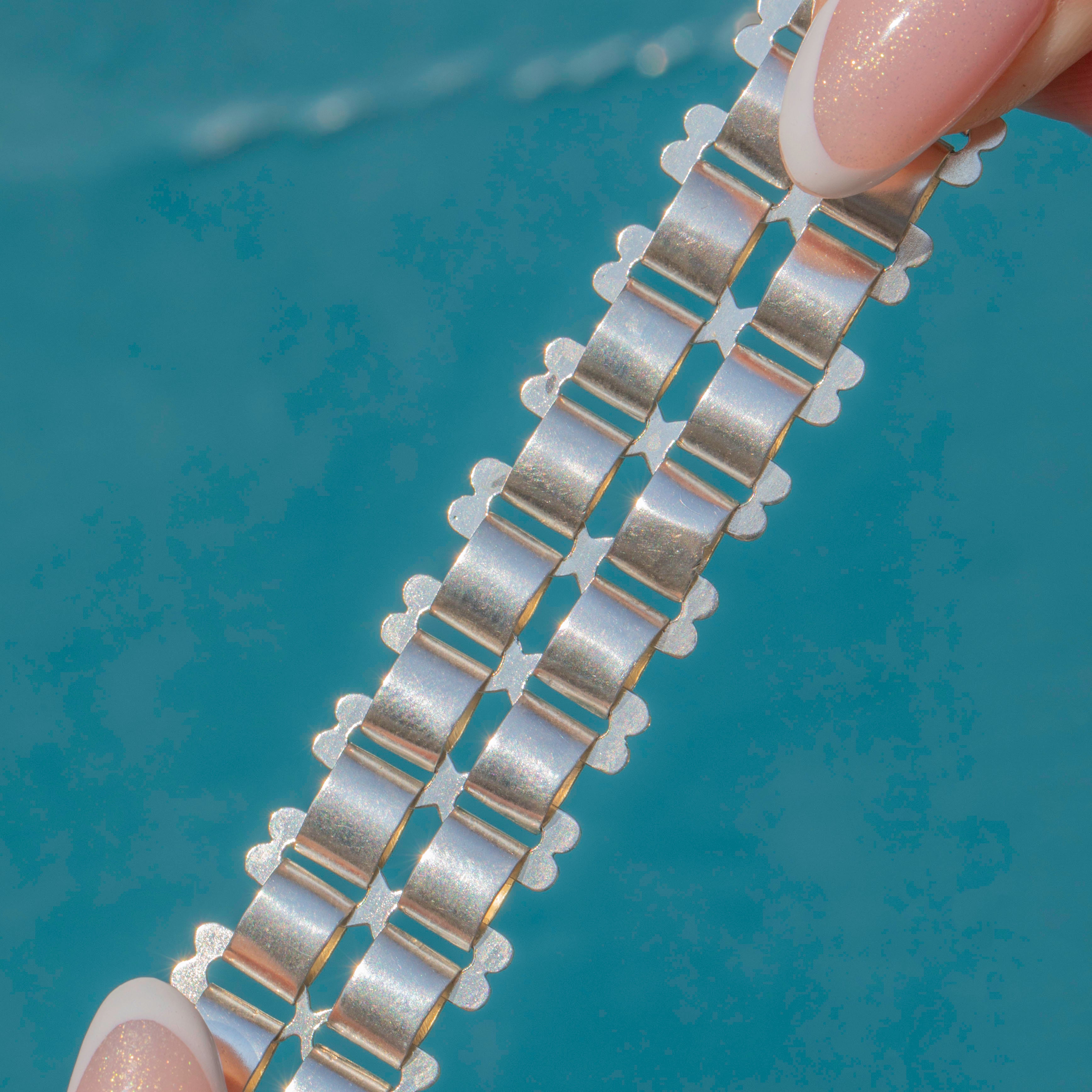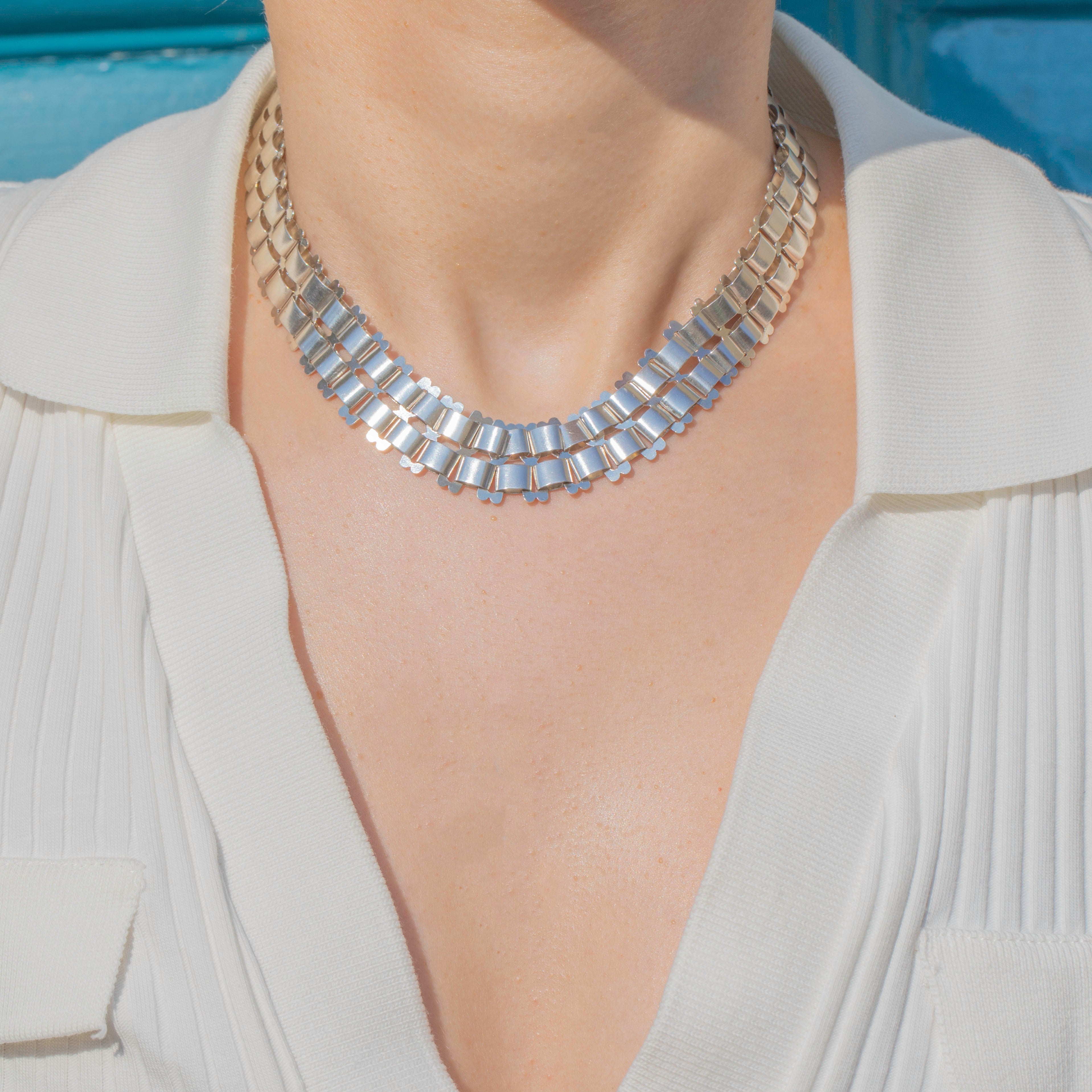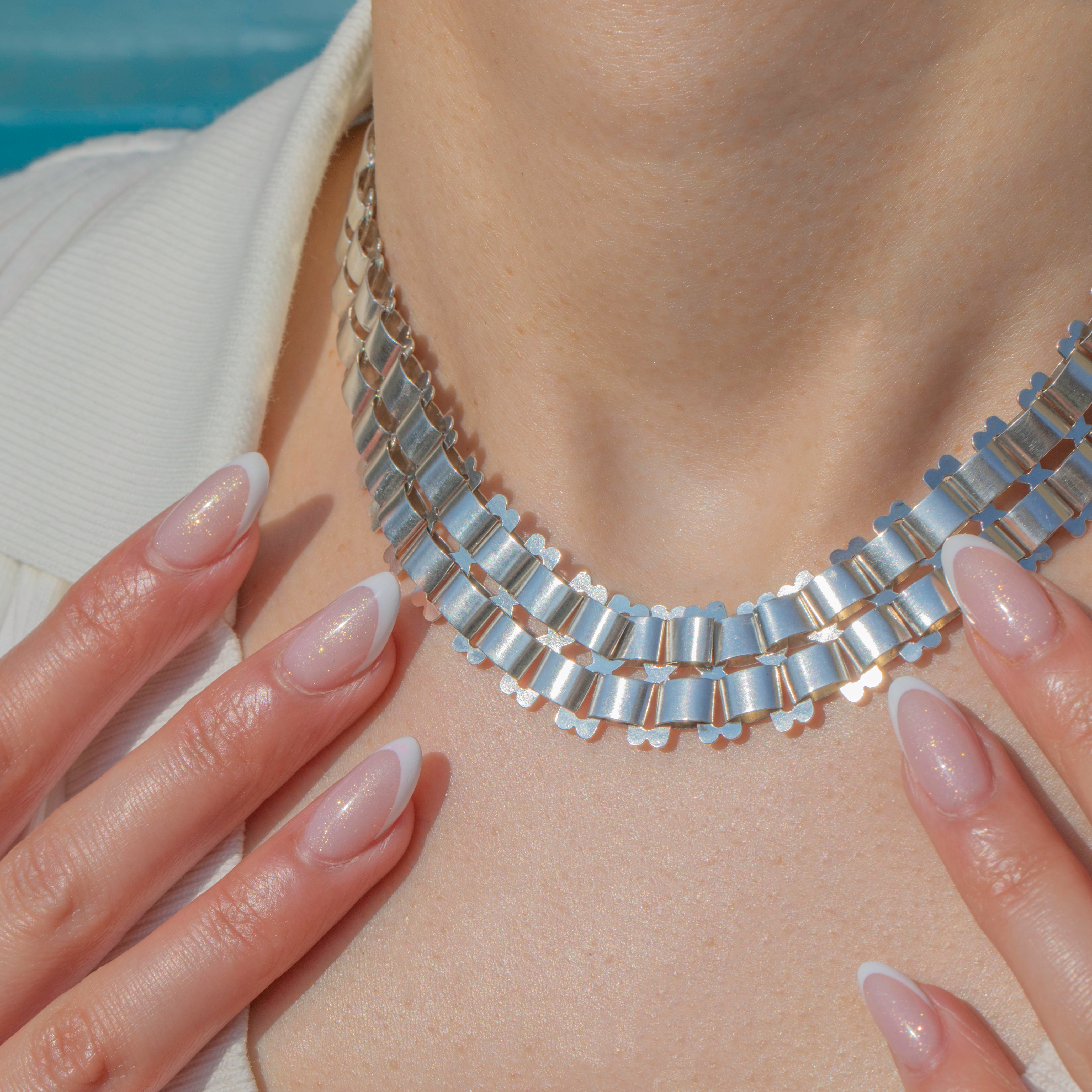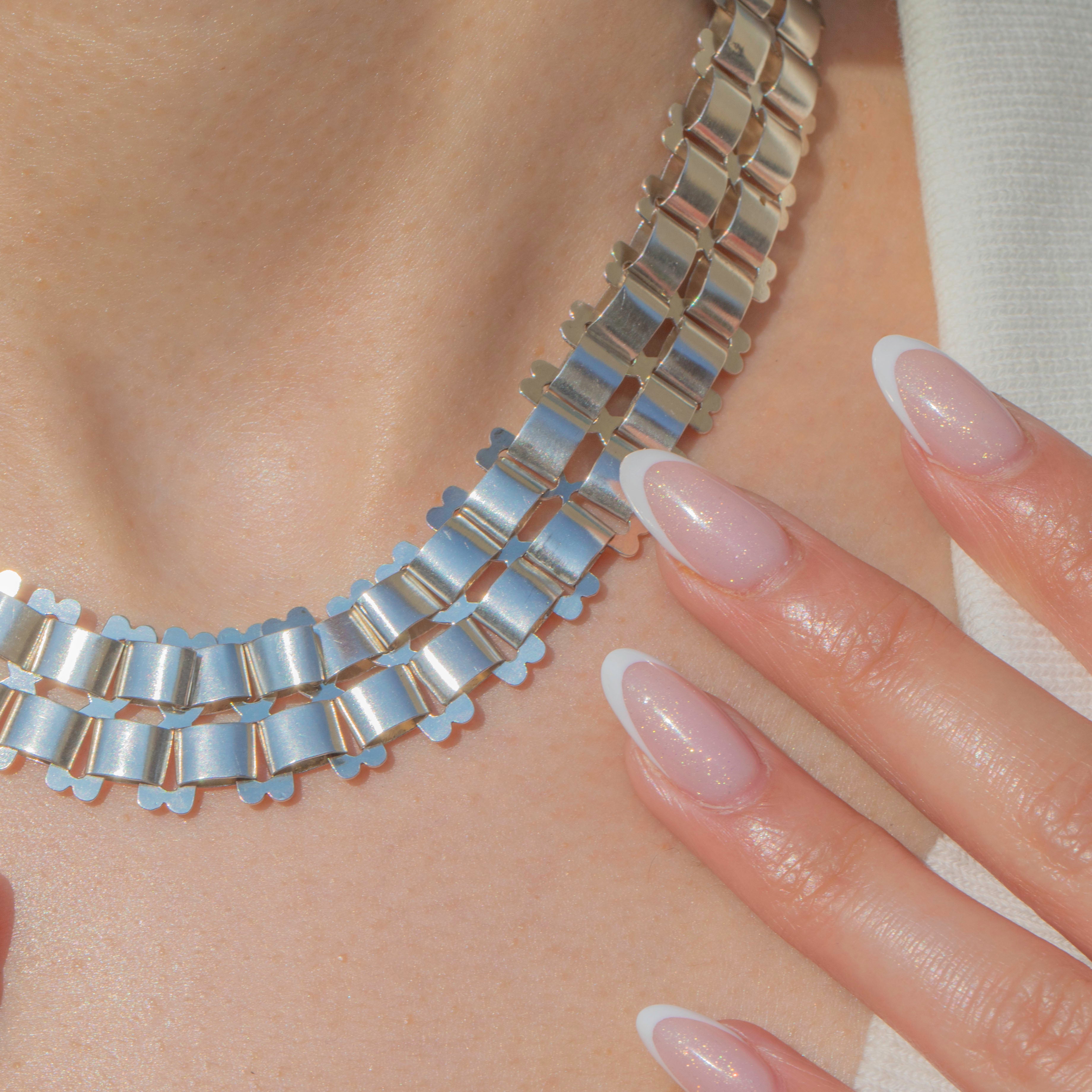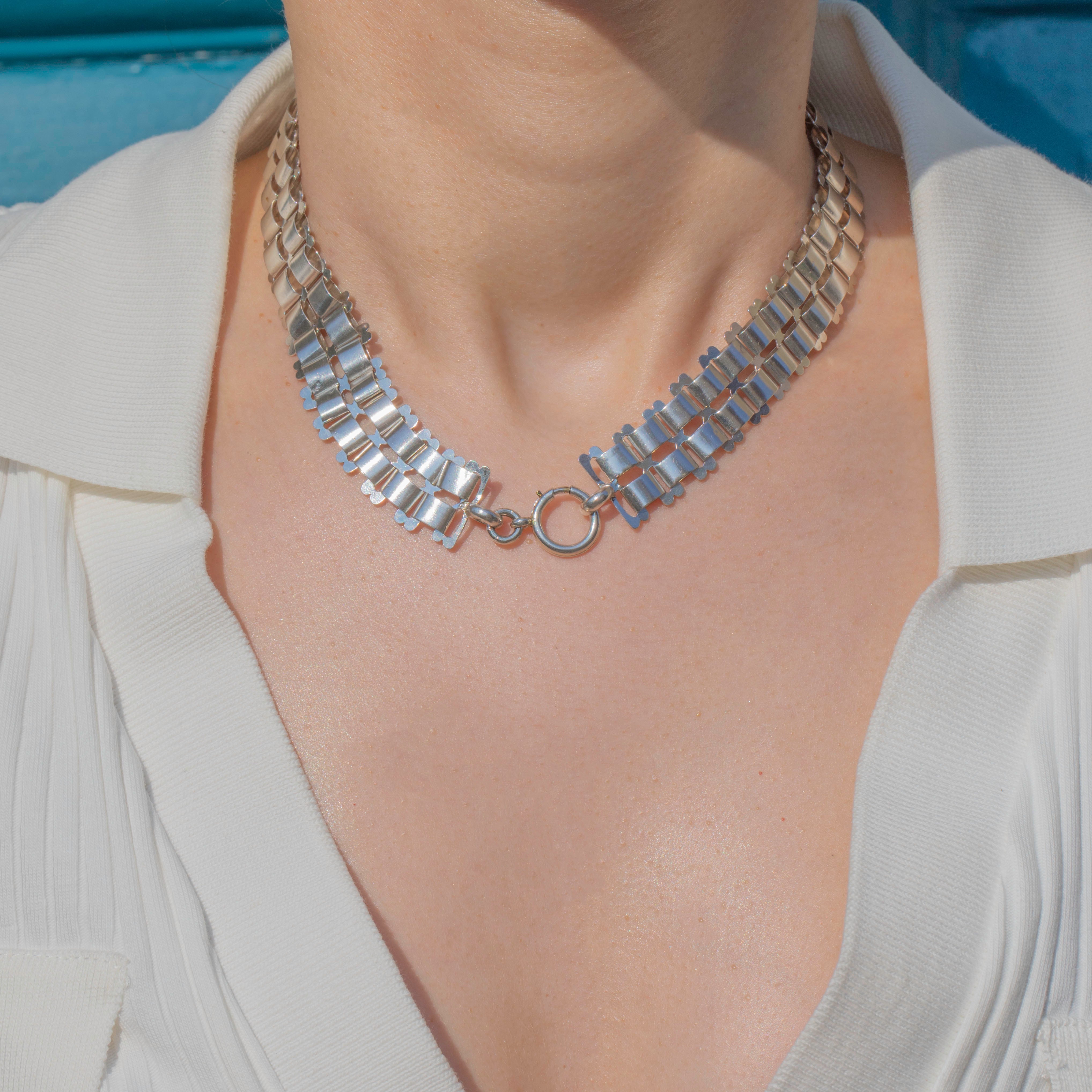 EXCELLENT:  This Victorian Sterling Silver book chain necklace is in excellent condition. The Silver is bright and the links are all securely connected. With no dings or dents to note, she is near perfect! The bolt ring is sturdy, so you can confidently wear this statement necklace all day long!