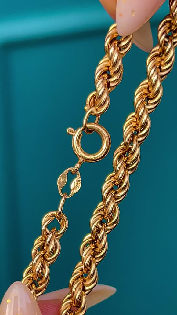 EXCELLENT: Bright high-polish finish with only the lightest surface wear seen under close inspection. The rope links are even, intact and securely soldered throughout, and the bolt-ring clasp is in good working order. Well cared for with no visible repairs or distortions.