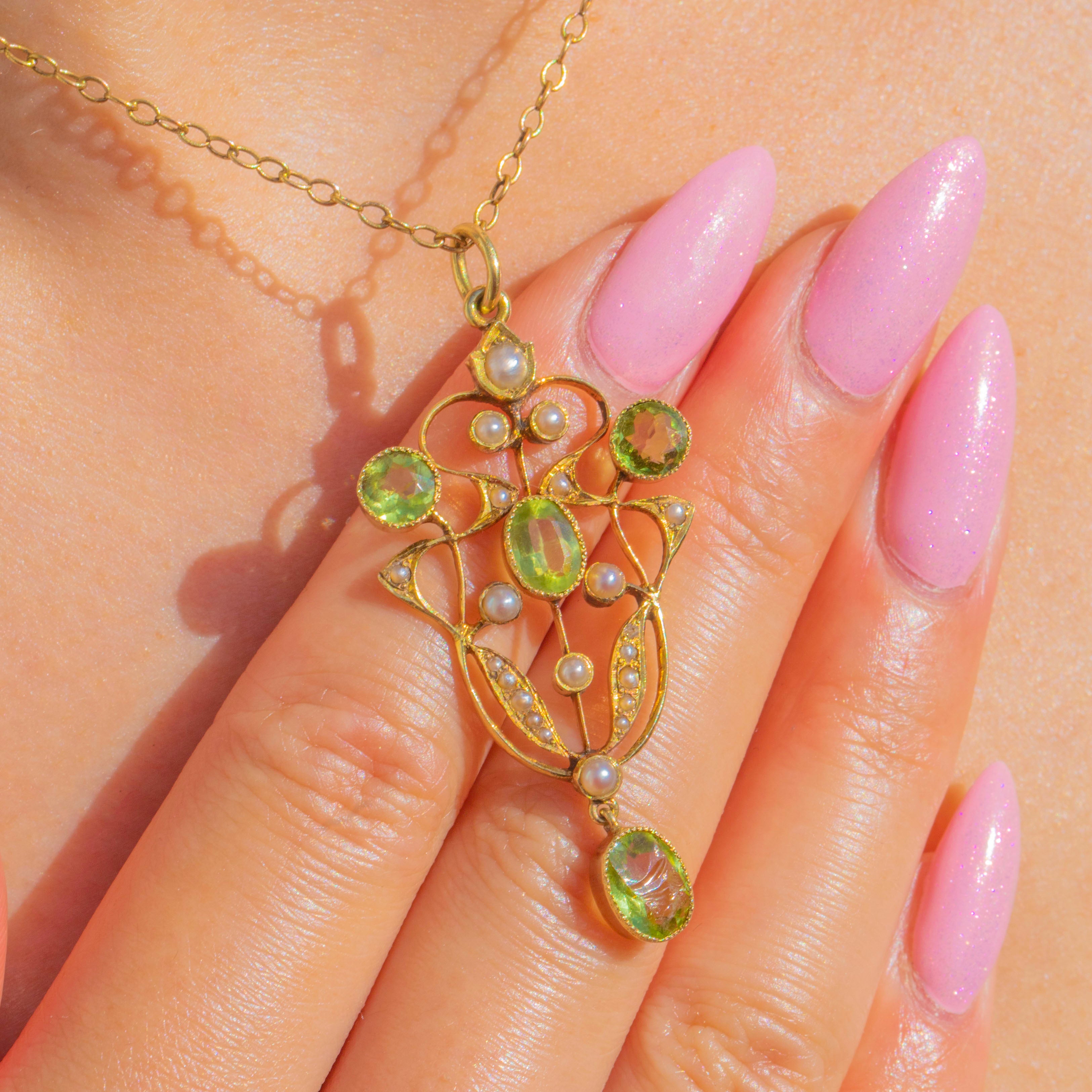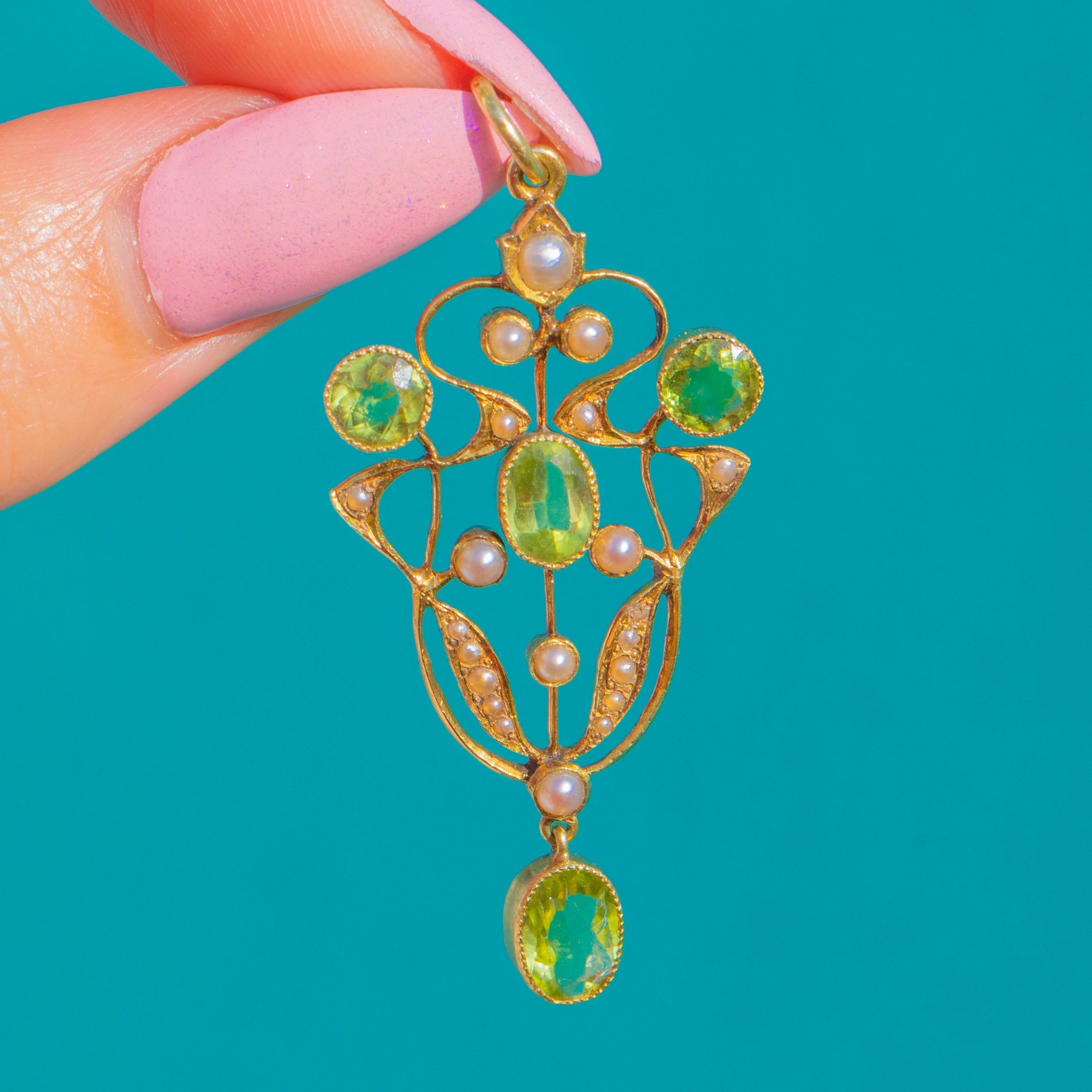 A luminous Art Nouveau pendant in 15ct Gold, alive with fresh apple-green Peridots and a halo of creamy Seed Pearls. The sinuous openwork of foliate scrolls flows into a graceful girandole silhouette, culminating in a delicate articulated drop that catches the light with every movement.