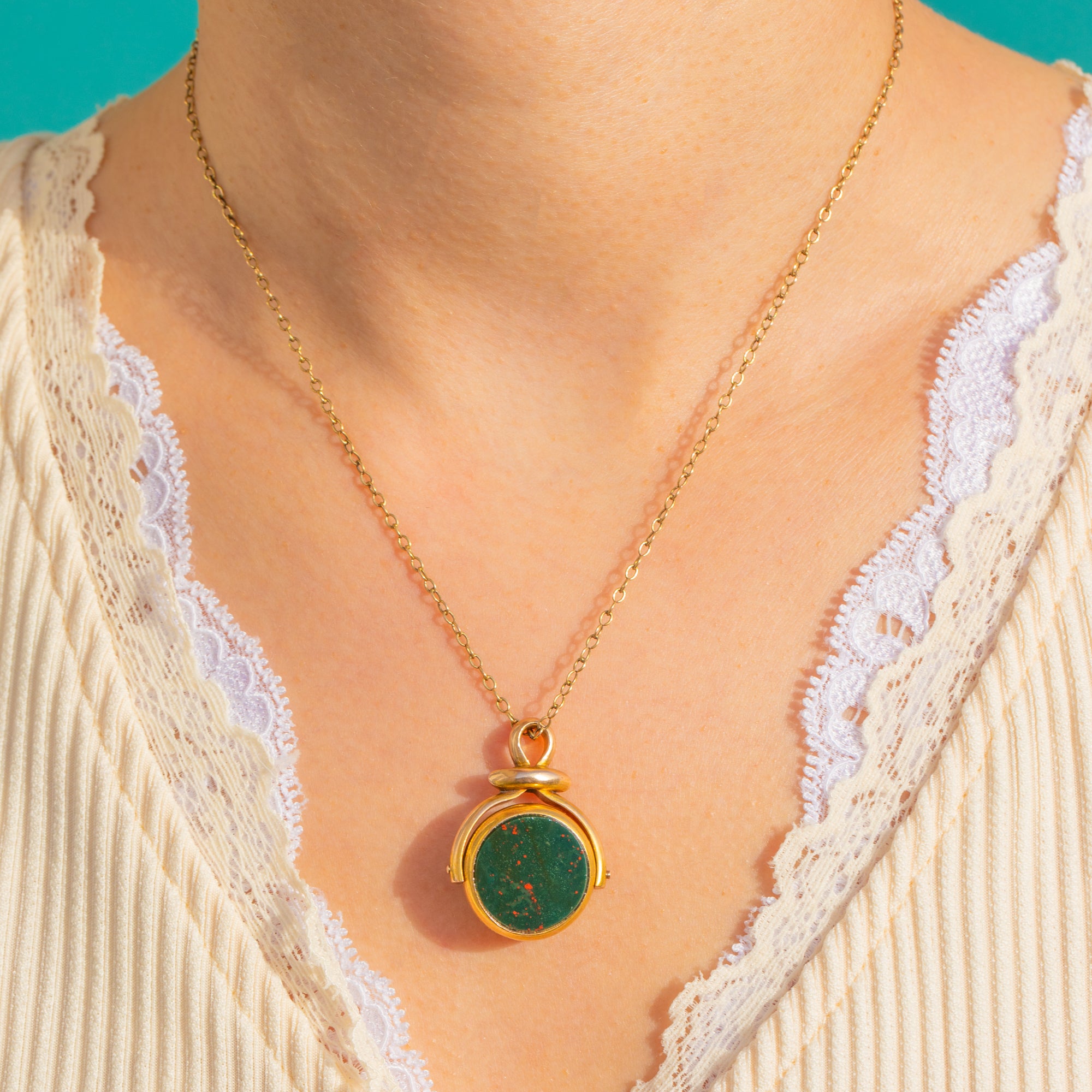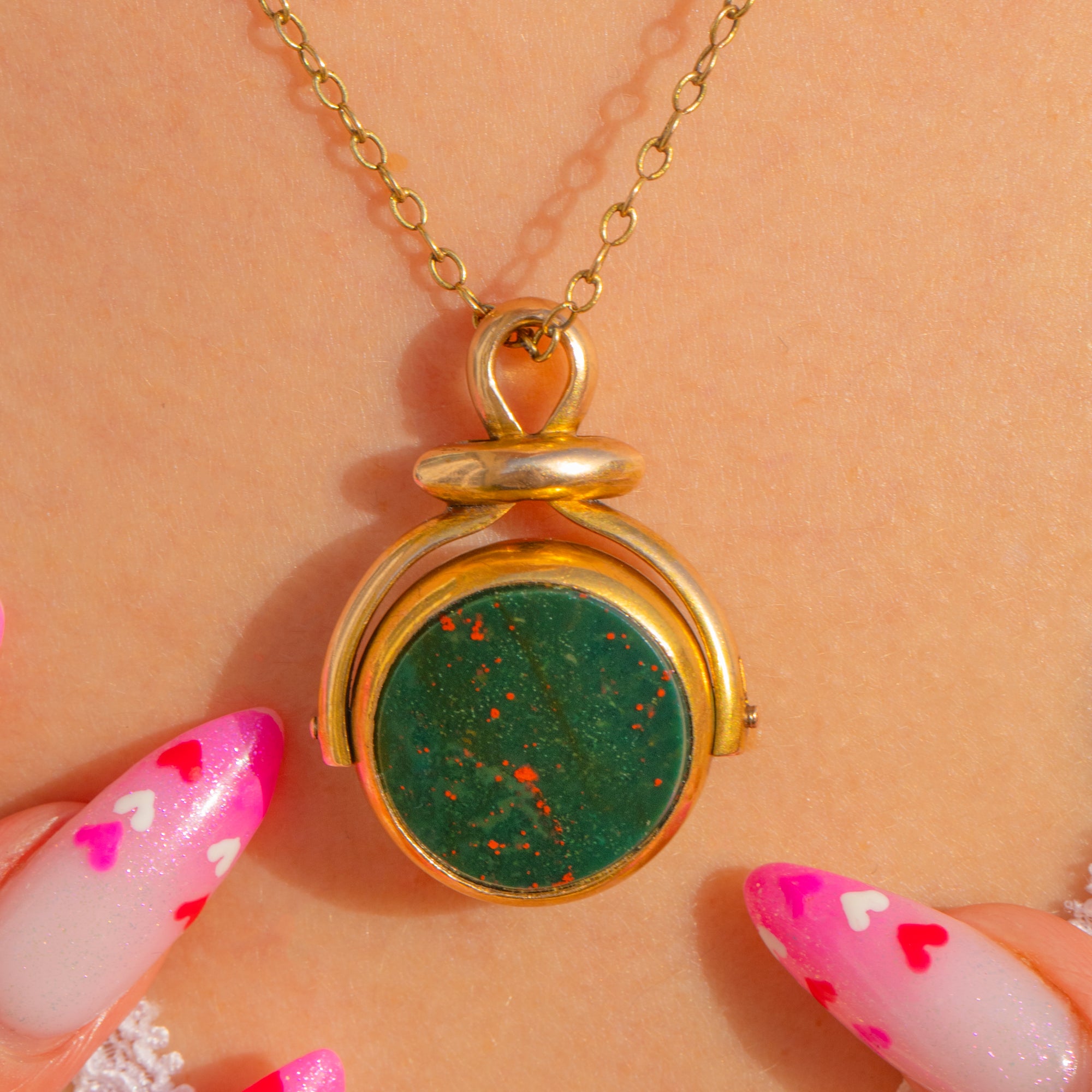 Rotate to suit your mood: the deep forest‑green Bloodstone shows classic red flecks, while the smooth Carnelian offers a warm, sunset glow. Framed in rich 15ct Gold with clean closed bezels, this elegant fob makes a gorgeous pendant or watch chain accent, bringing heritage charm to any neckline.