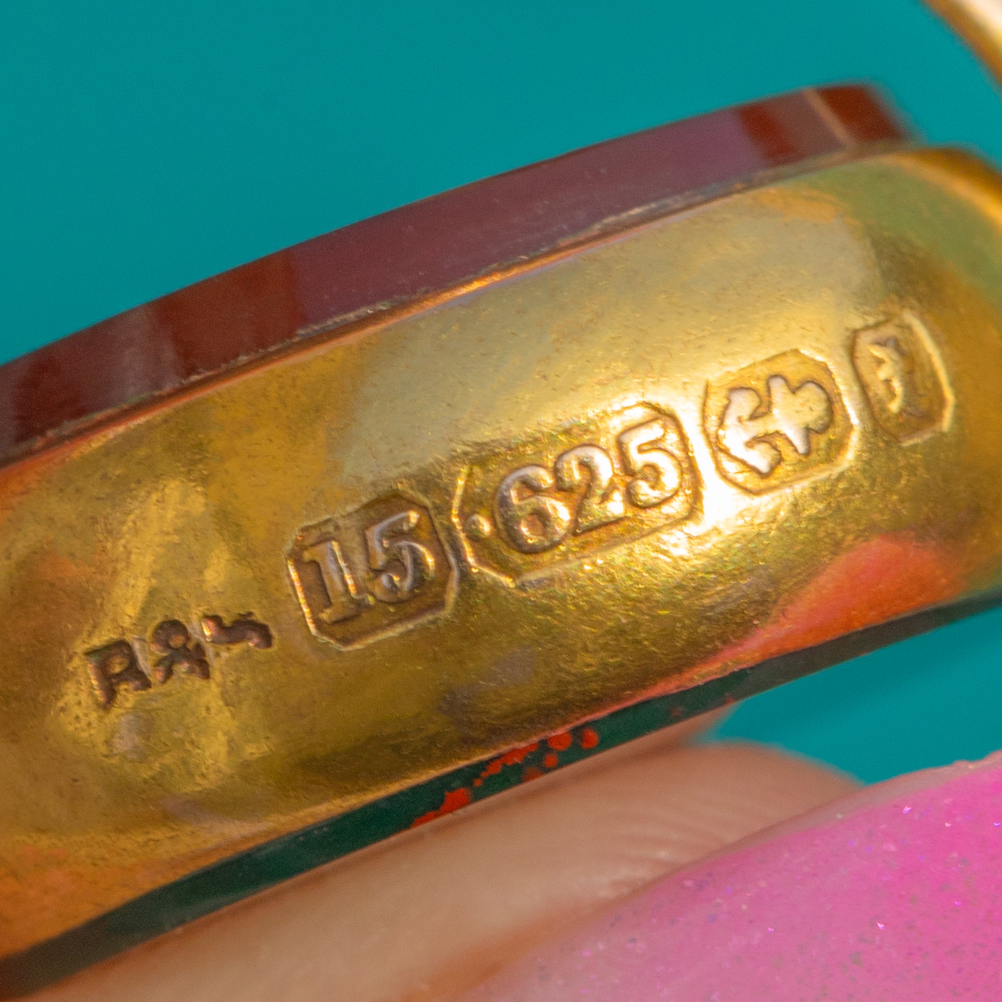 MATERIALS: Tests as 15ct Gold, Bloodstone, Carnelian.