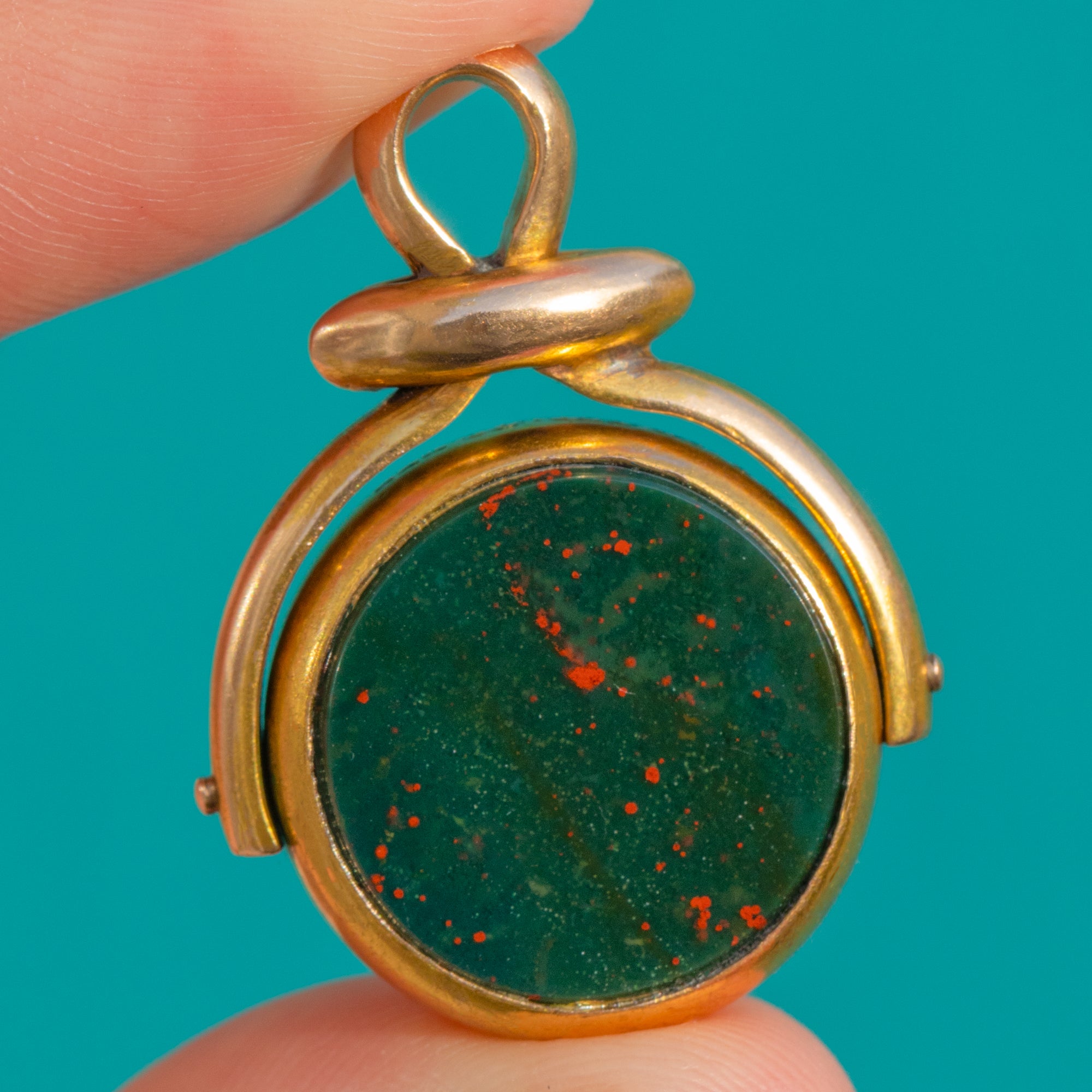 EXCELLENT: The Bloodstone and Carnelian are in excellent condition with a bright polish and only minimal surface wear visible under magnification. The 15ct Gold frame is crisp with light age-related surface marks and a well-shaped jump ring. No evidence of repair or restoration noted, and overall care and preservation are superb for the age.