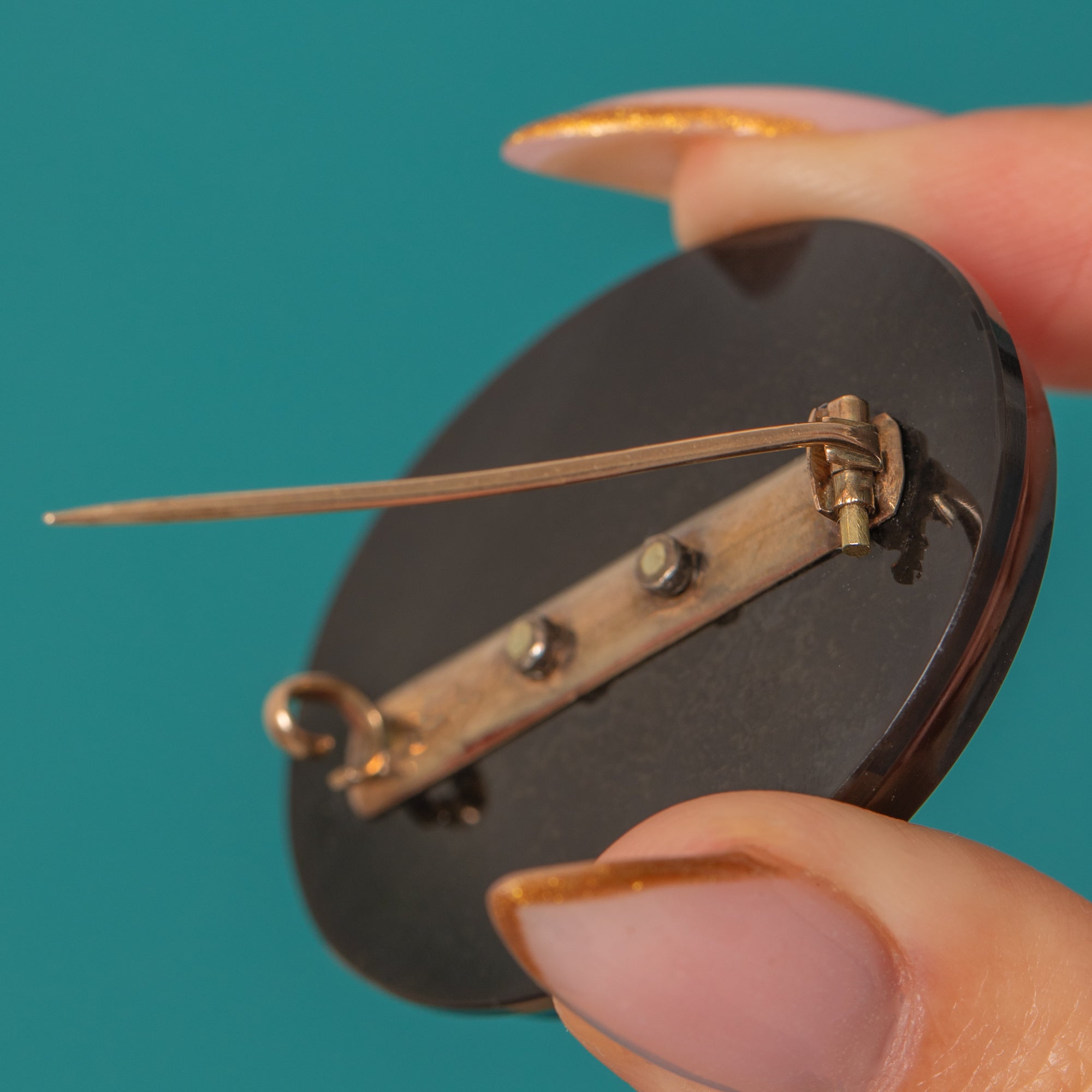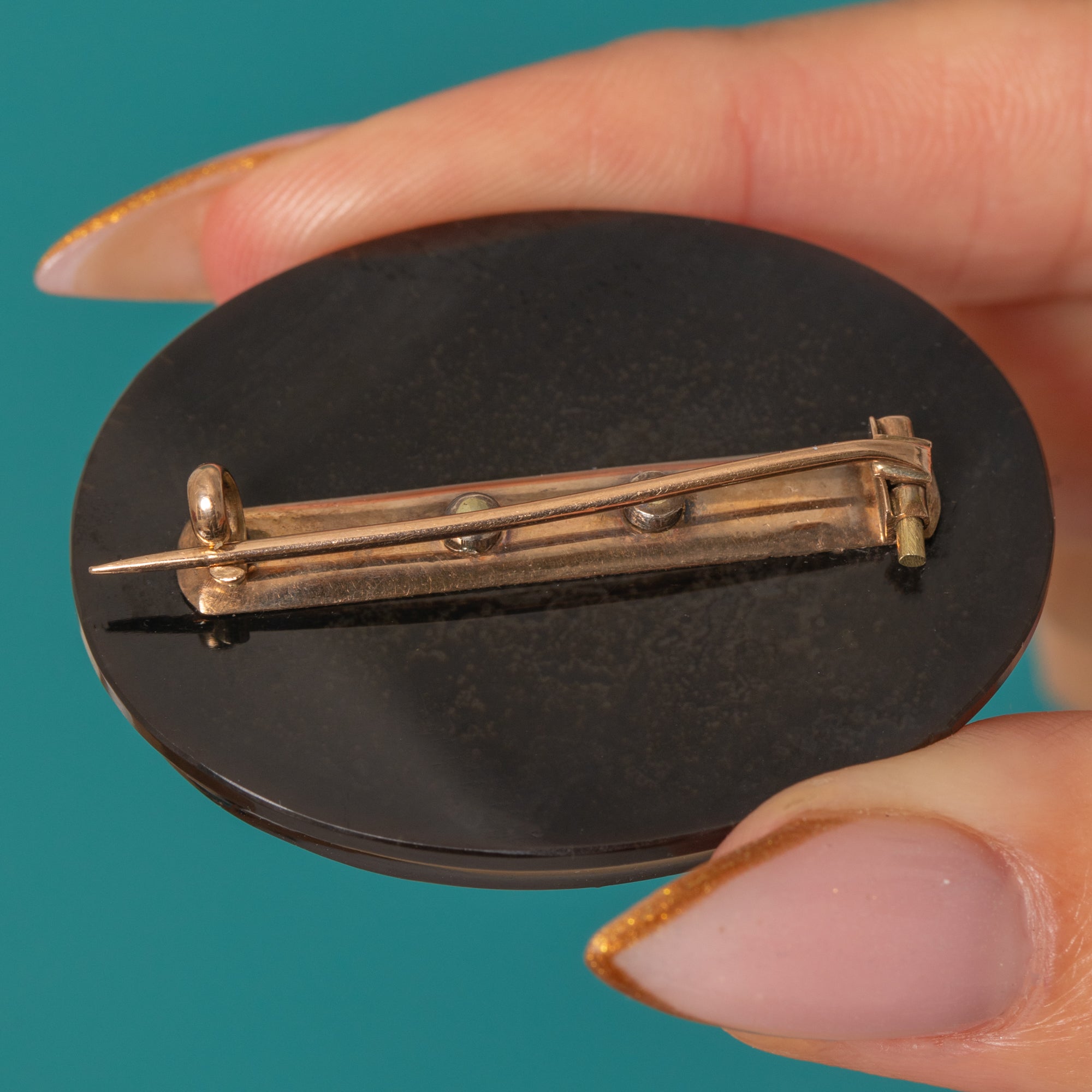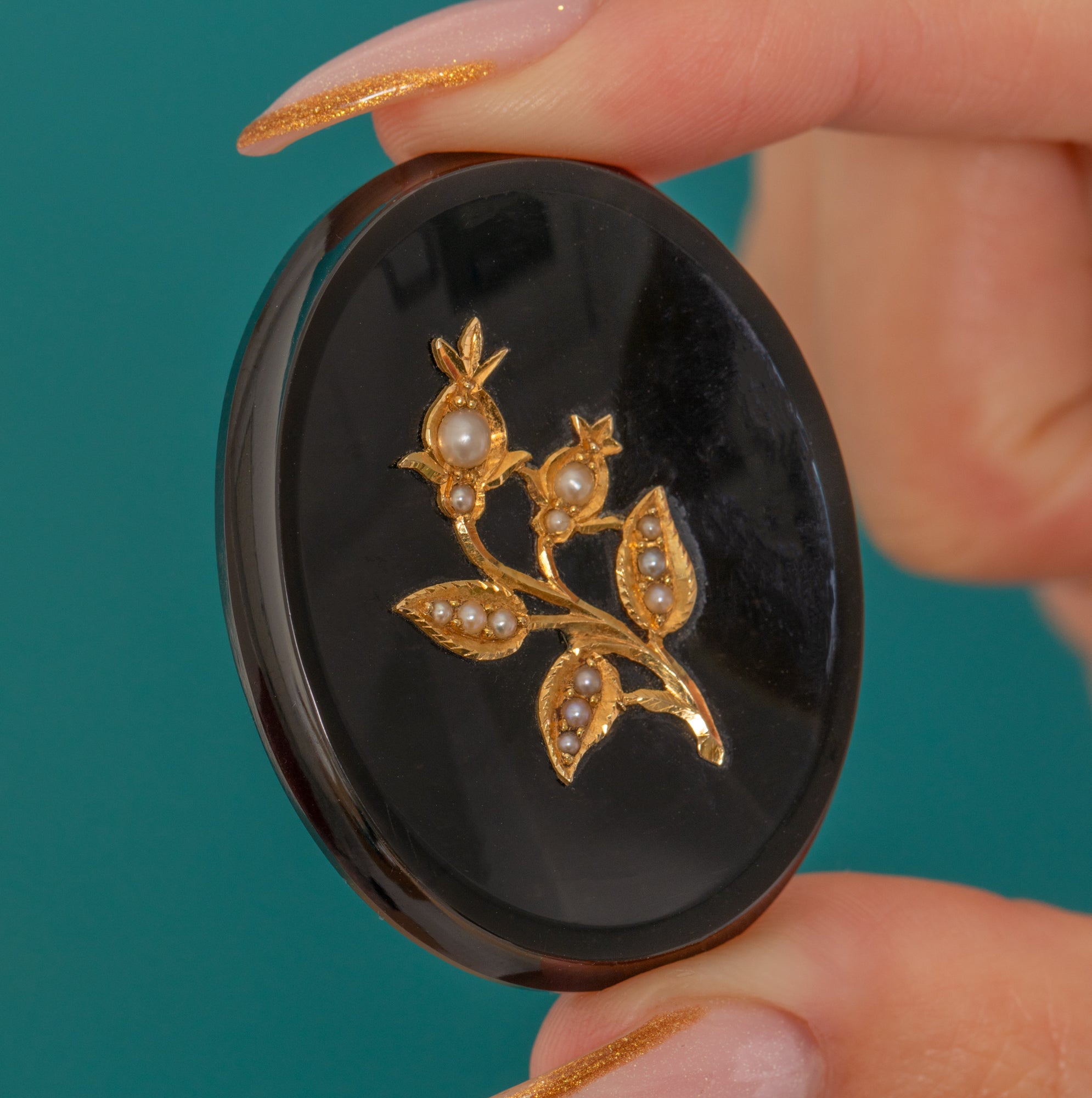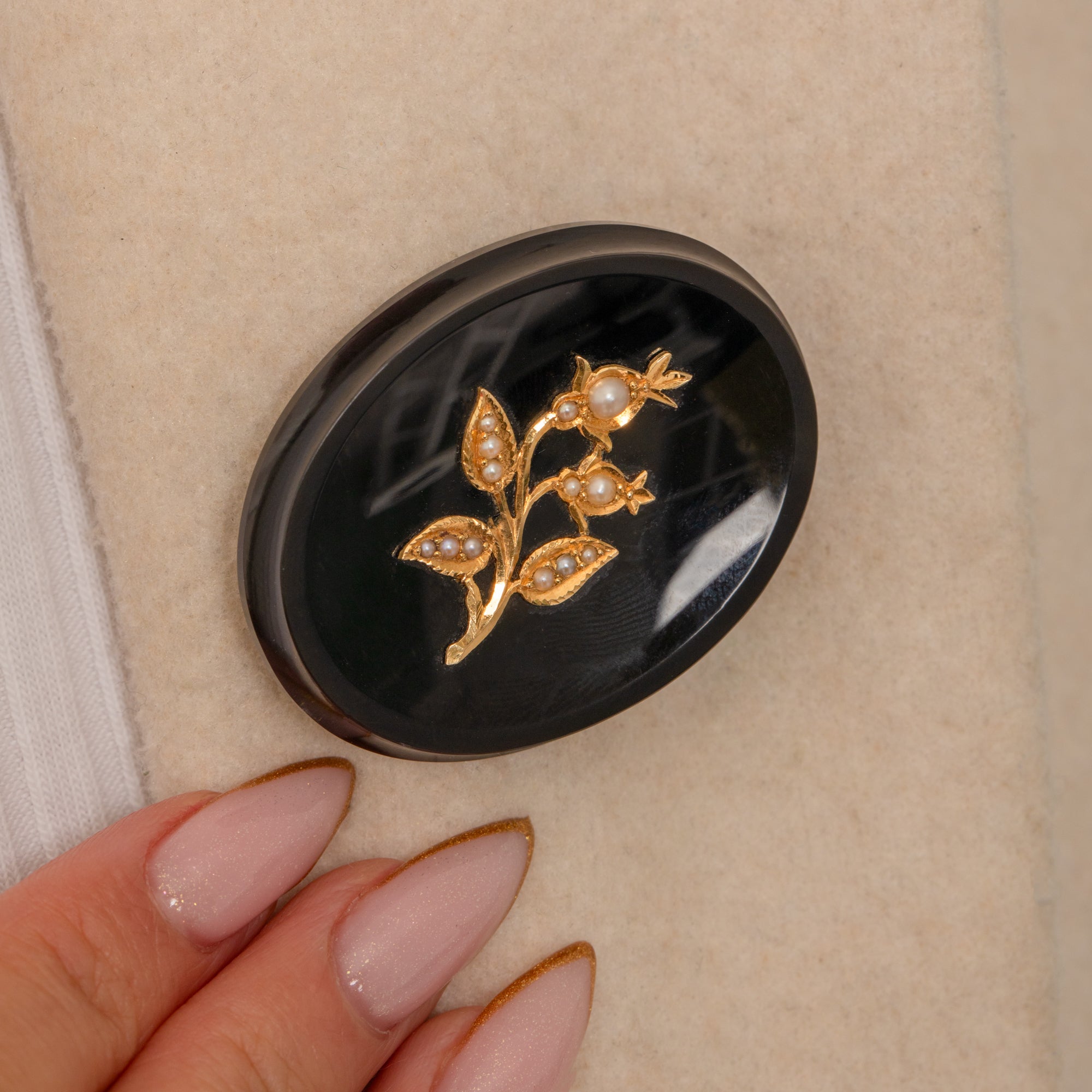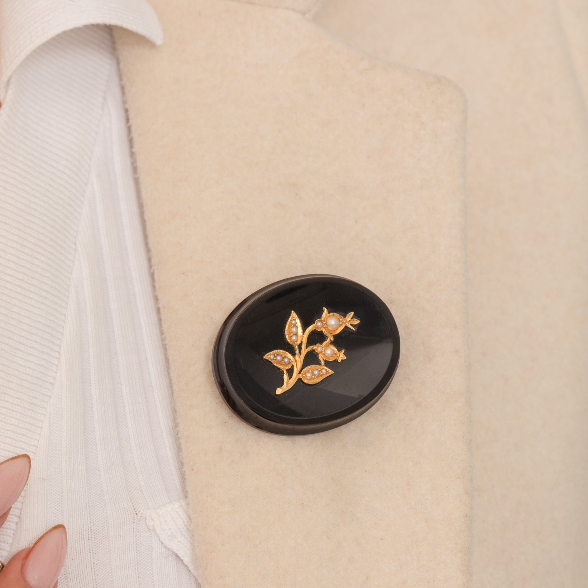 A striking Victorian Onyx brooch set with a delicate Pearl flower, all framed in richly hued 15ct Gold.