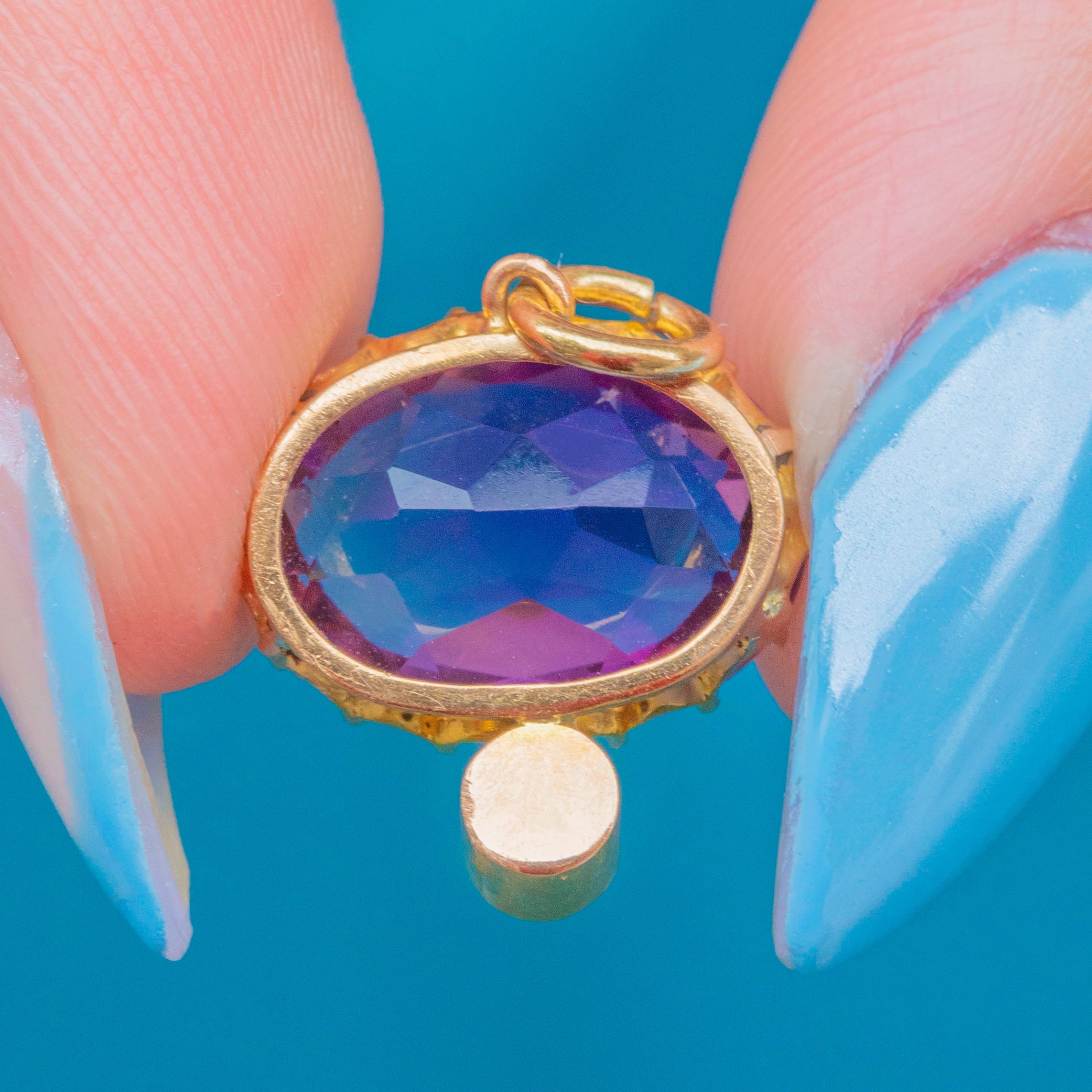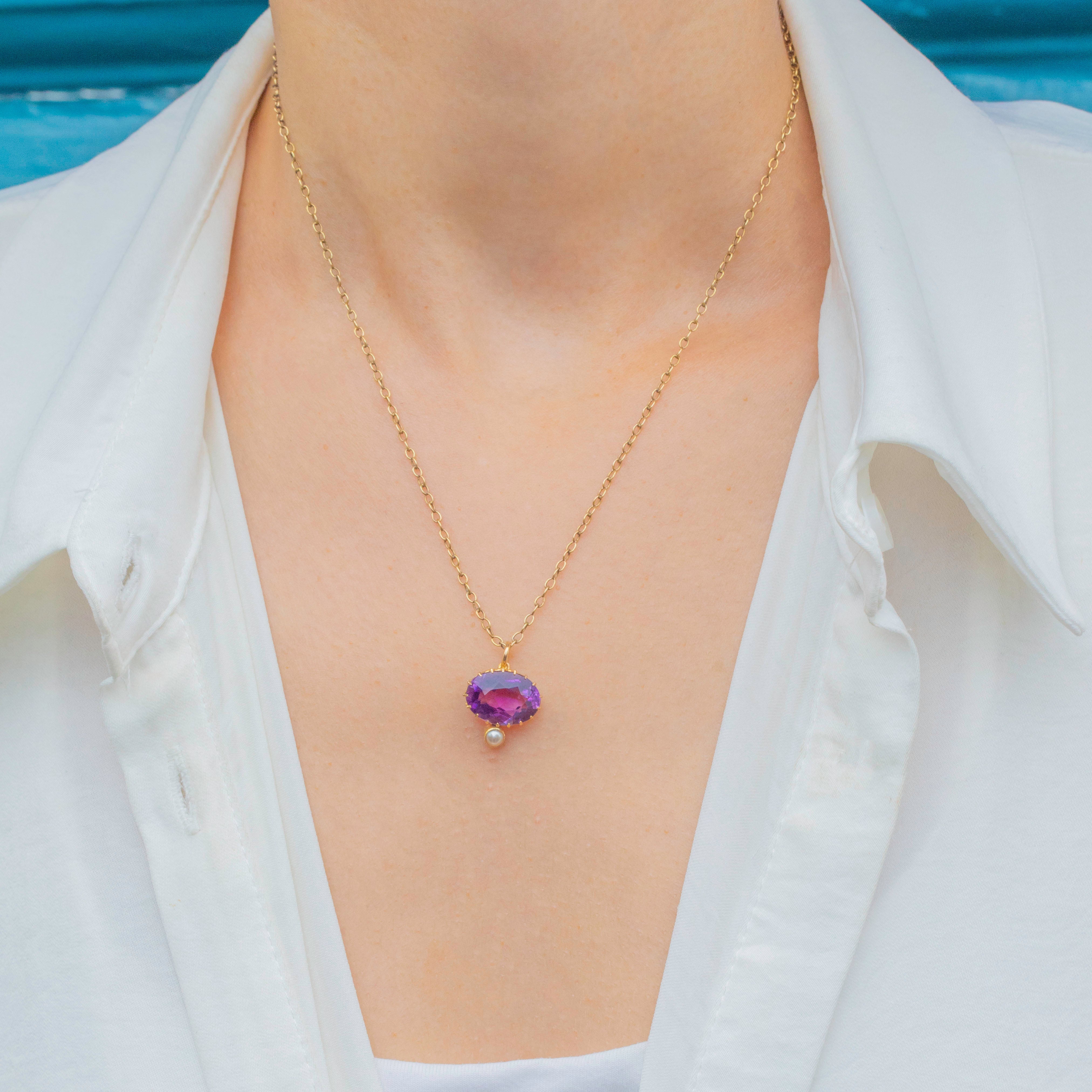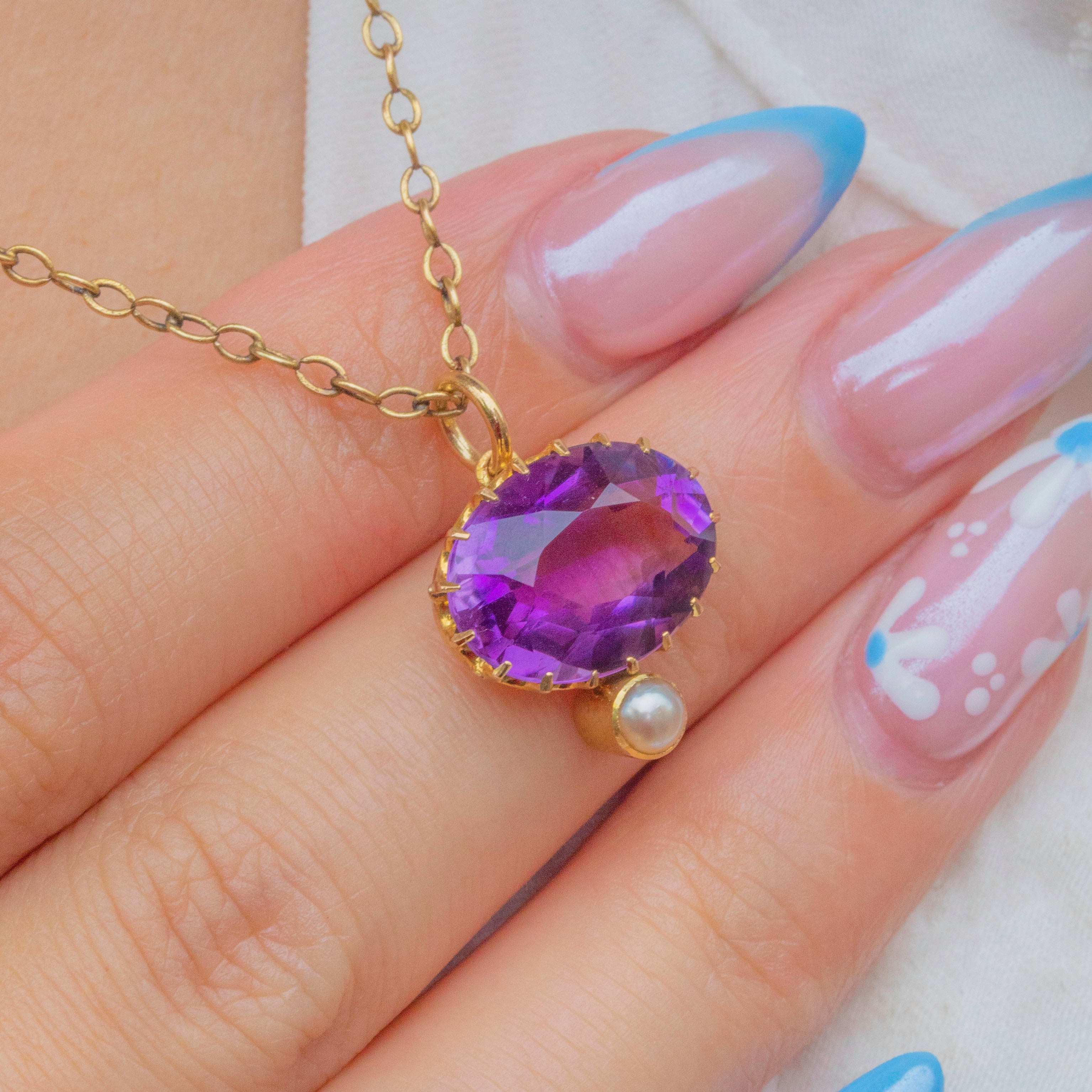 This Victorian pendant exudes regal charm, boasting a royal purple Amethyst accented by an iridescent Pearl at its base. The 4.03ct Amethyst has been exquisitely faceted, creating a spectacular display as it catches the light.