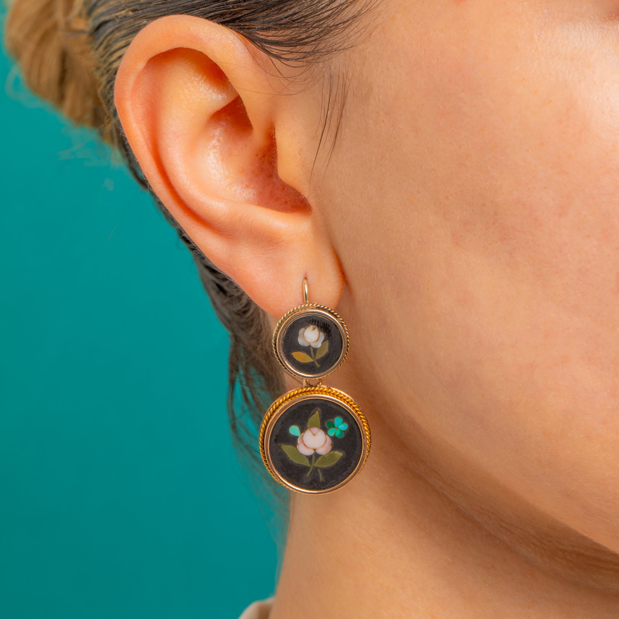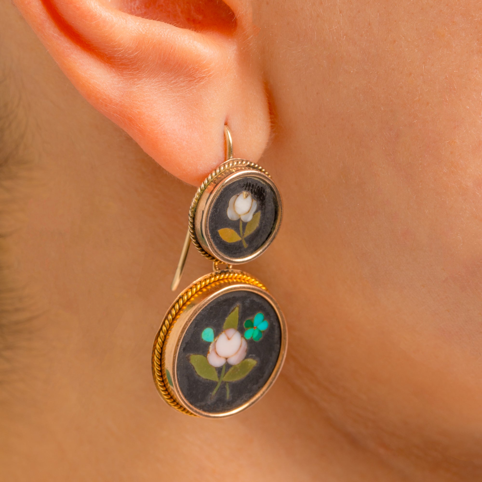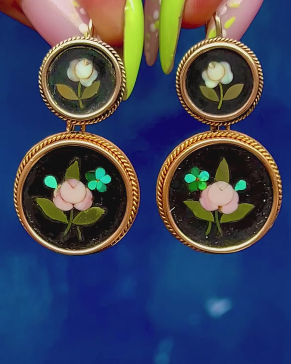 Romance and refinement abound in these Victorian 15ct Gold pietra dura double-drop earrings. Each articulated tier showcases a velvety black roundel inlaid with a delicate floral—soft blush-white petals, olive-green leaves and a tiny turquoise accent—framed by ornate twisted-rope bezels for a beautifully finished silhouette.