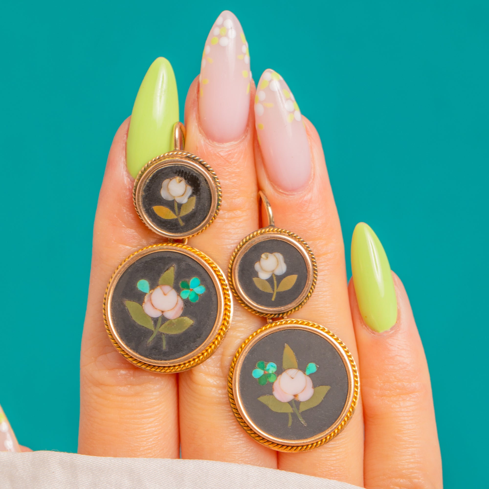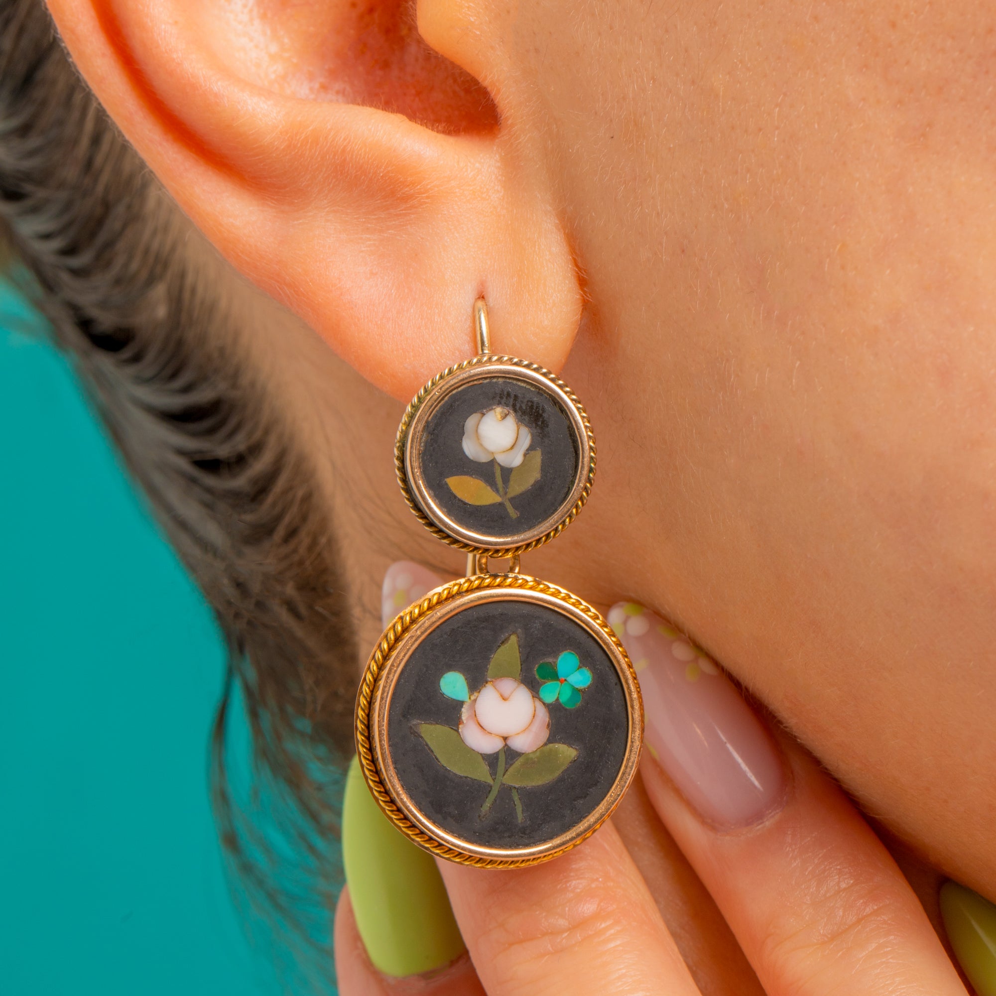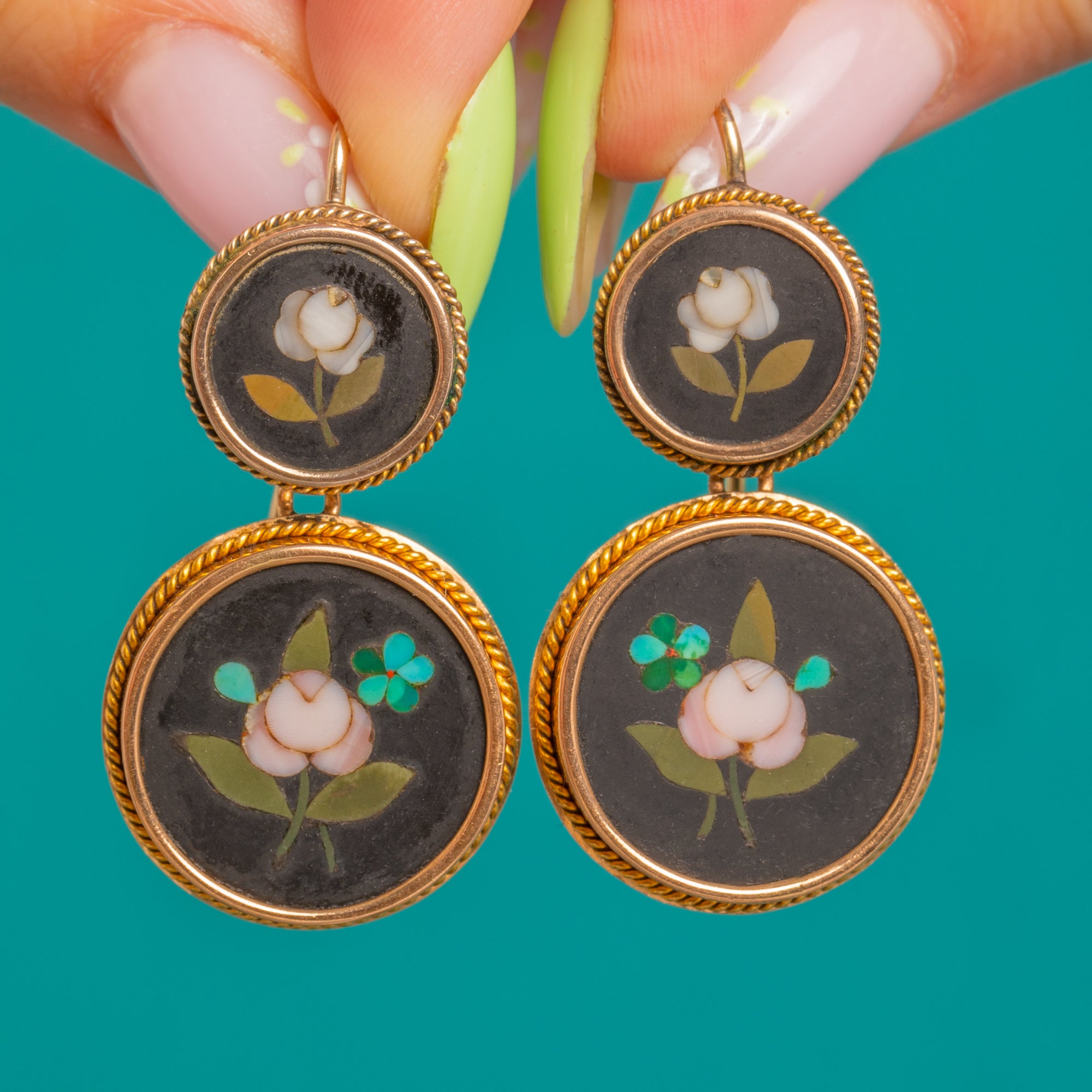 Romance and refinement abound in these Victorian 15ct Gold pietra dura double-drop earrings. Each articulated tier showcases a velvety black roundel inlaid with a delicate floral—soft blush-white petals, olive-green leaves and a tiny turquoise accent—framed by ornate twisted-rope bezels for a beautifully finished silhouette.