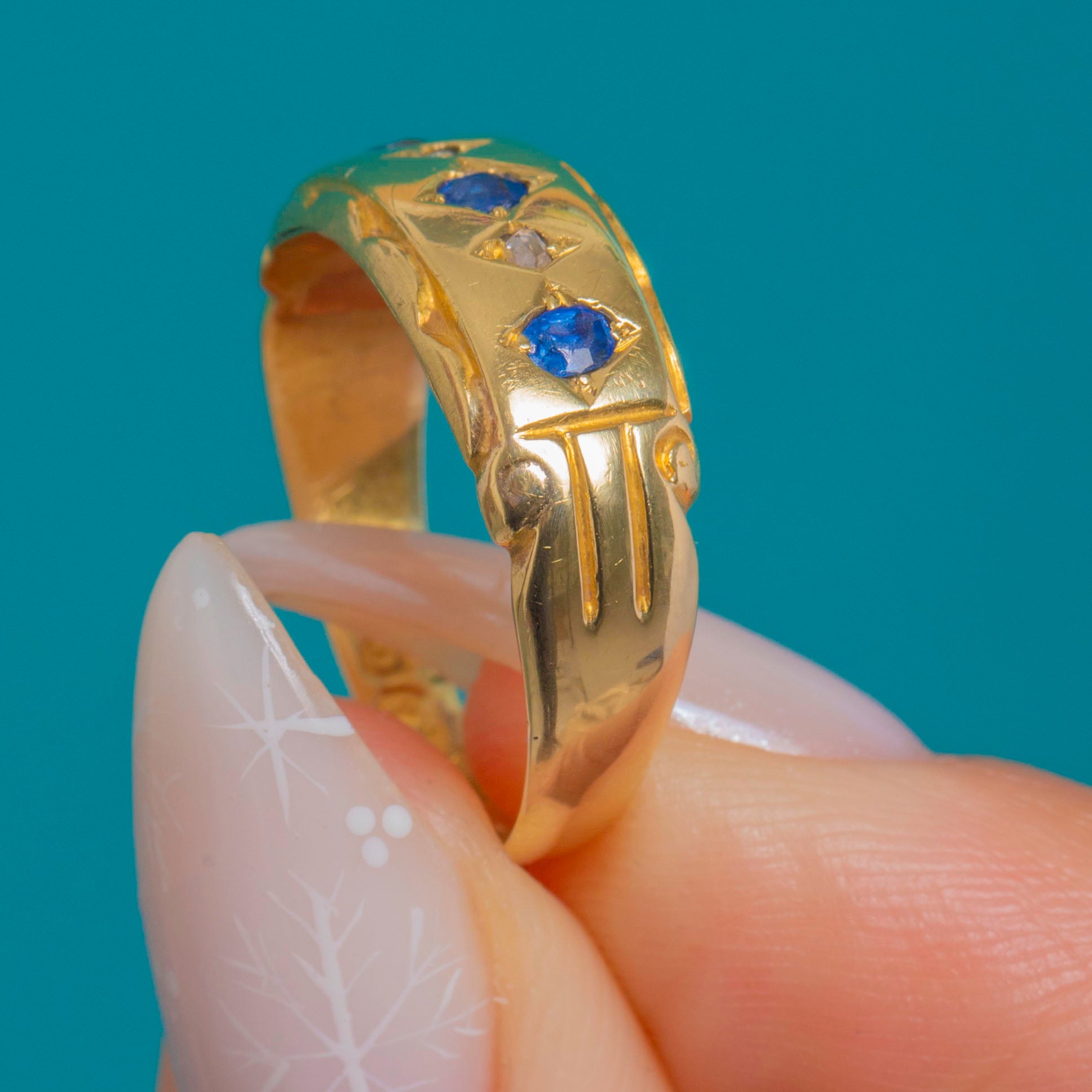 A richly hued 15ct Gold gypsy ring set with Sapphires and Diamonds, bearing the Chester assay and dating to 1899. The gemstones are nestled in bright-cut star and lozenge-shaped panels across a domed band, framed by hand-engraved borders and subtly detailed shoulders.