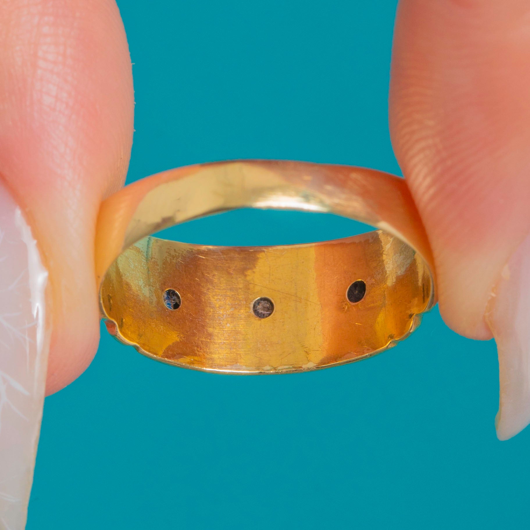 EXCELLENT: Gemstones show light facet wear and minor abrasions visible under magnification, with settings secure. The band has light surface scratches and softened engraving from wear, and the hallmarks are partly worn. A possible old resize seam is visible inside the shank; overall well cared for and ready to wear.