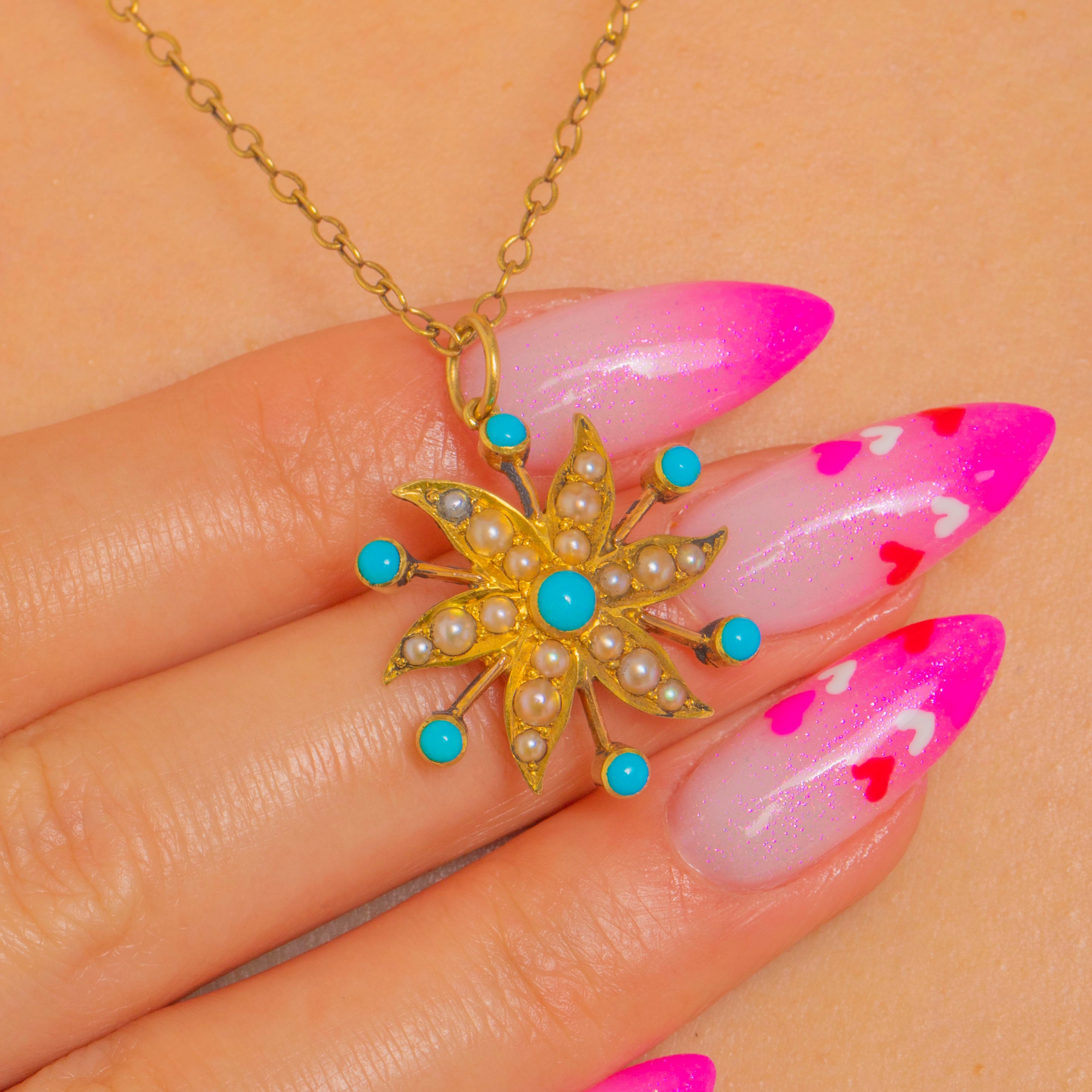 A luminous Victorian flower pendant crafted in rich 15ct Gold, centred on a vivid round Turquoise cabochon. From the heart of the piece, delicate petal-like rays unfold, each softly cupped and set with natural Seed Pearls to create a romantic, starburst bloom.