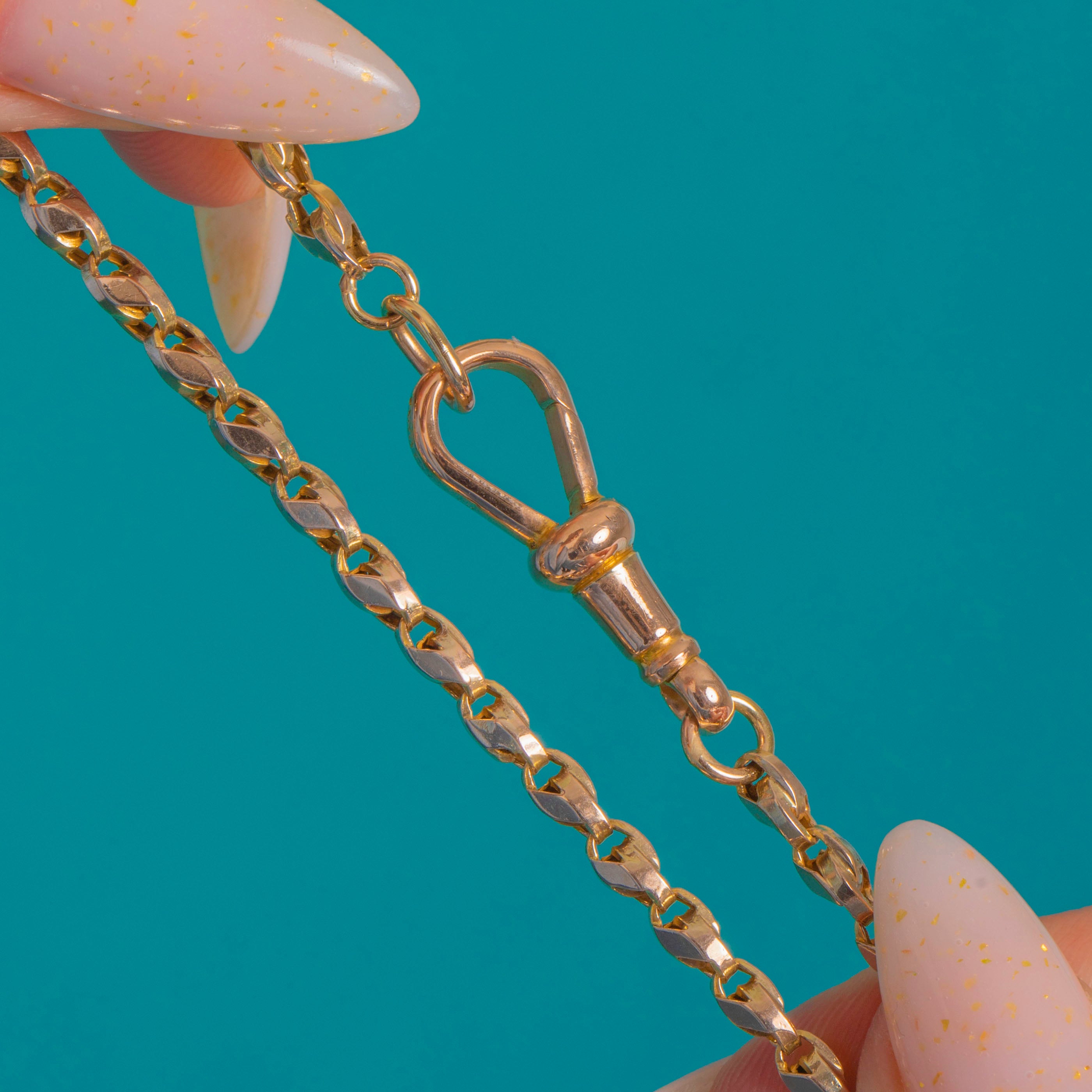 A luminous Victorian 9ct Gold Tulip chain, finished with a classic dog clip for that timeless watch-chain allure. The refined tulip links offer subtle faceting that catches the light beautifully, delivering a sleek, minimalist sparkle in a warm Yellow Gold hue.