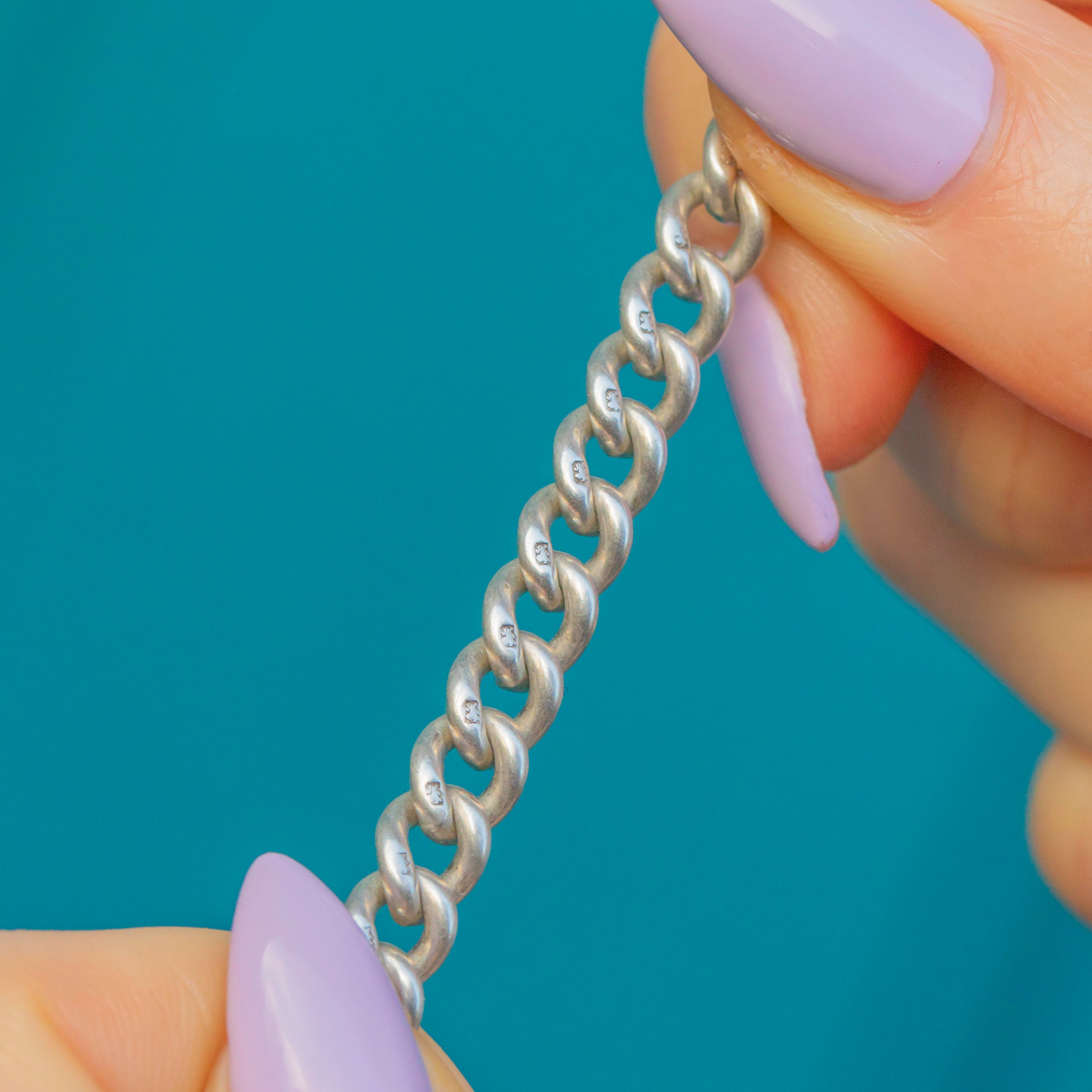 VERY GOOD. This  antique Sterling Silver Albert chain is in very good condition. The links are uniform and secure, with a Lion Passant stamp on each one, allowing for confident wear. There are some marks to the dog-clips expected with age, however this does not affect their functionality. With little else to note, she is a must-have!