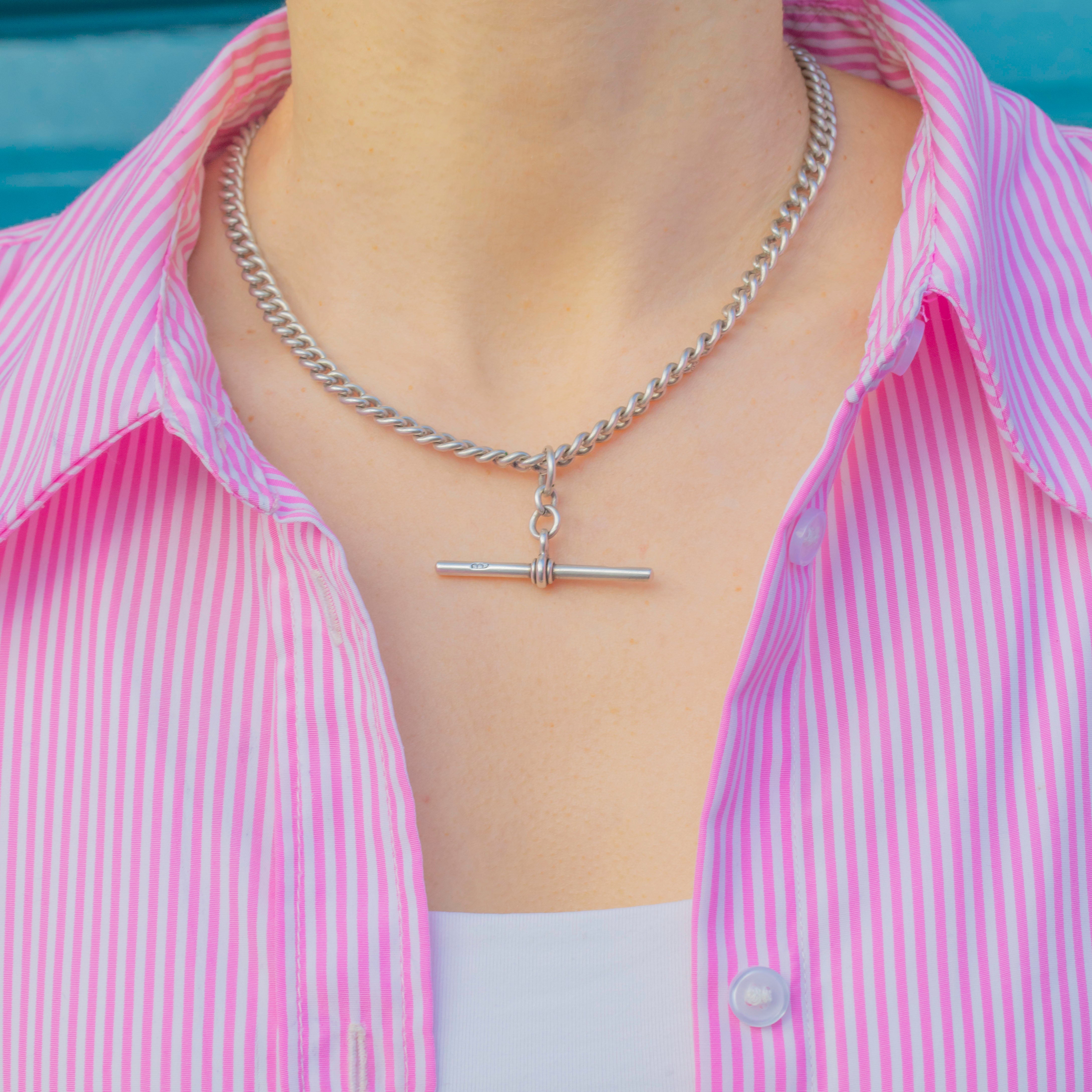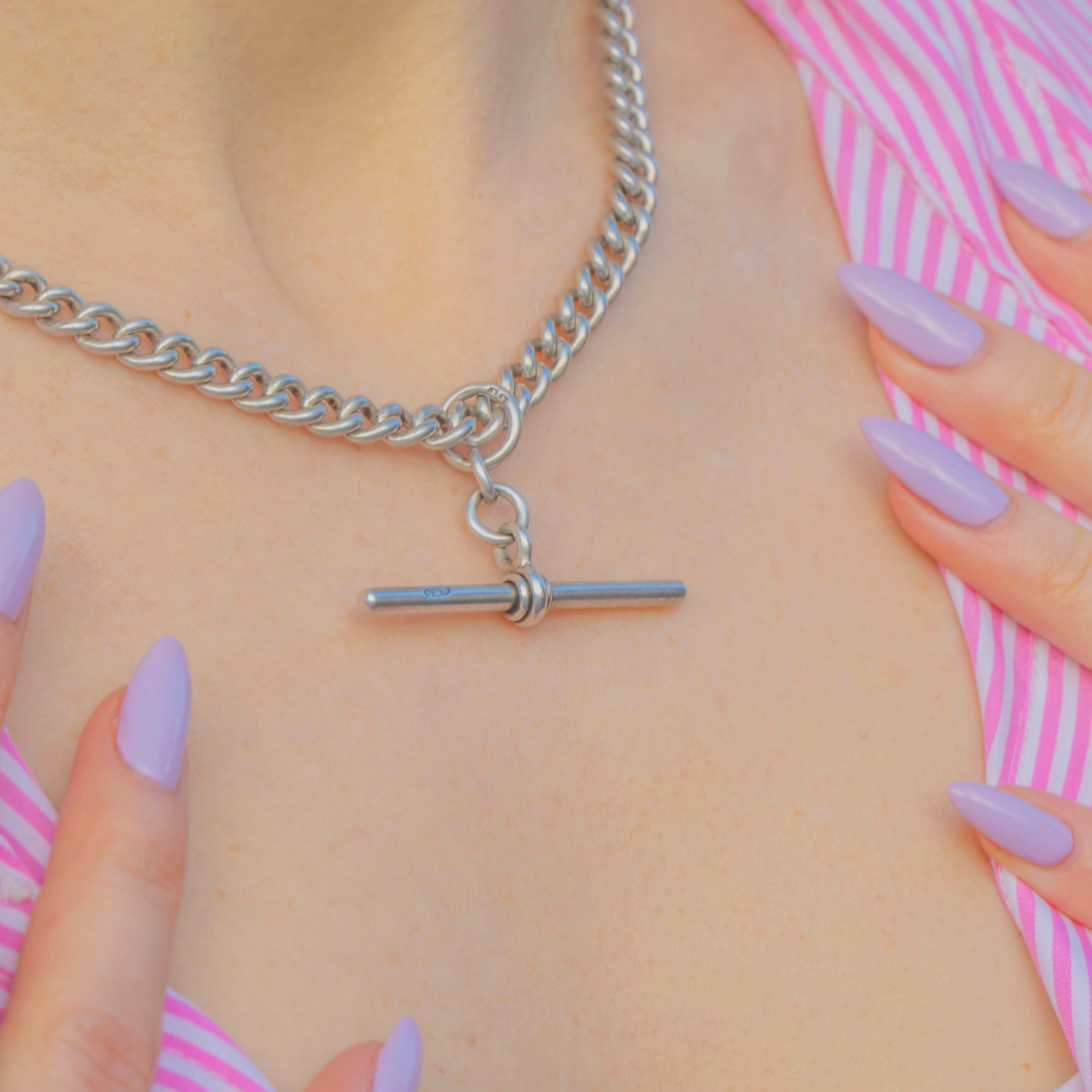 Crafted from over 40 grams of lustrous Sterling Silver, this chunky Edwardian chain features a large T-bar and two dog-clips, each adding a touch of unique charm. Dated to 1910 and with a desirable length of 16.5", this antique Silver Albert chain will make a wonderful addition to your collection.