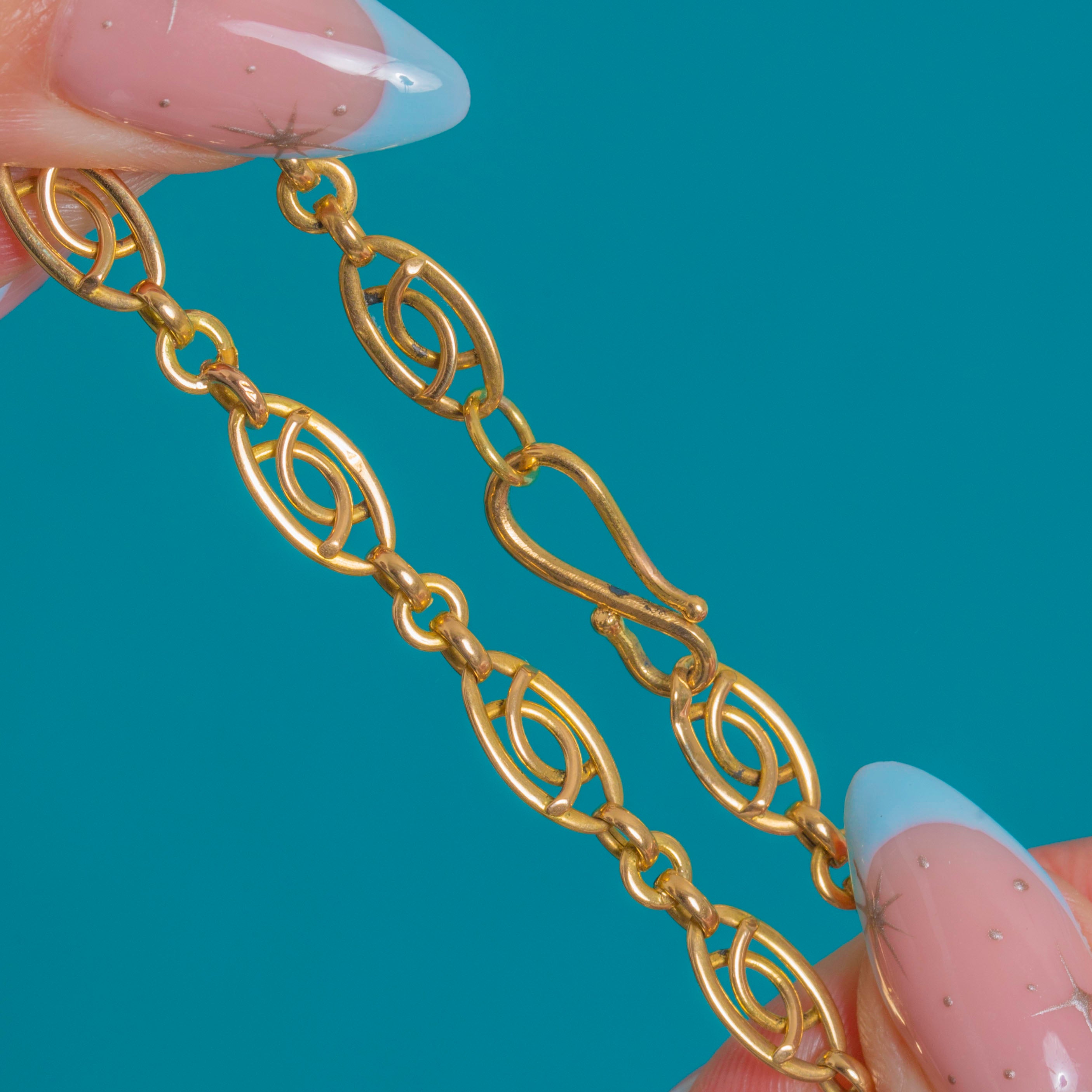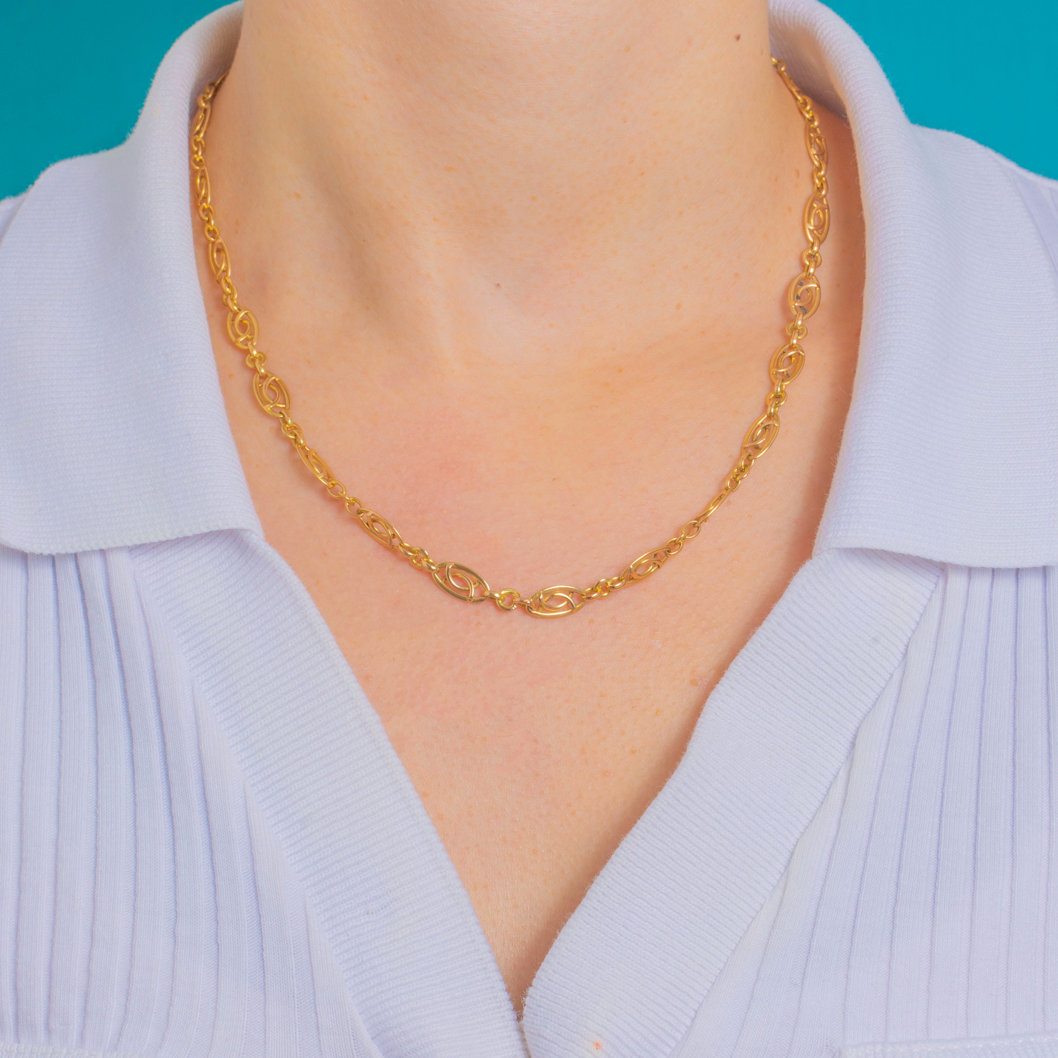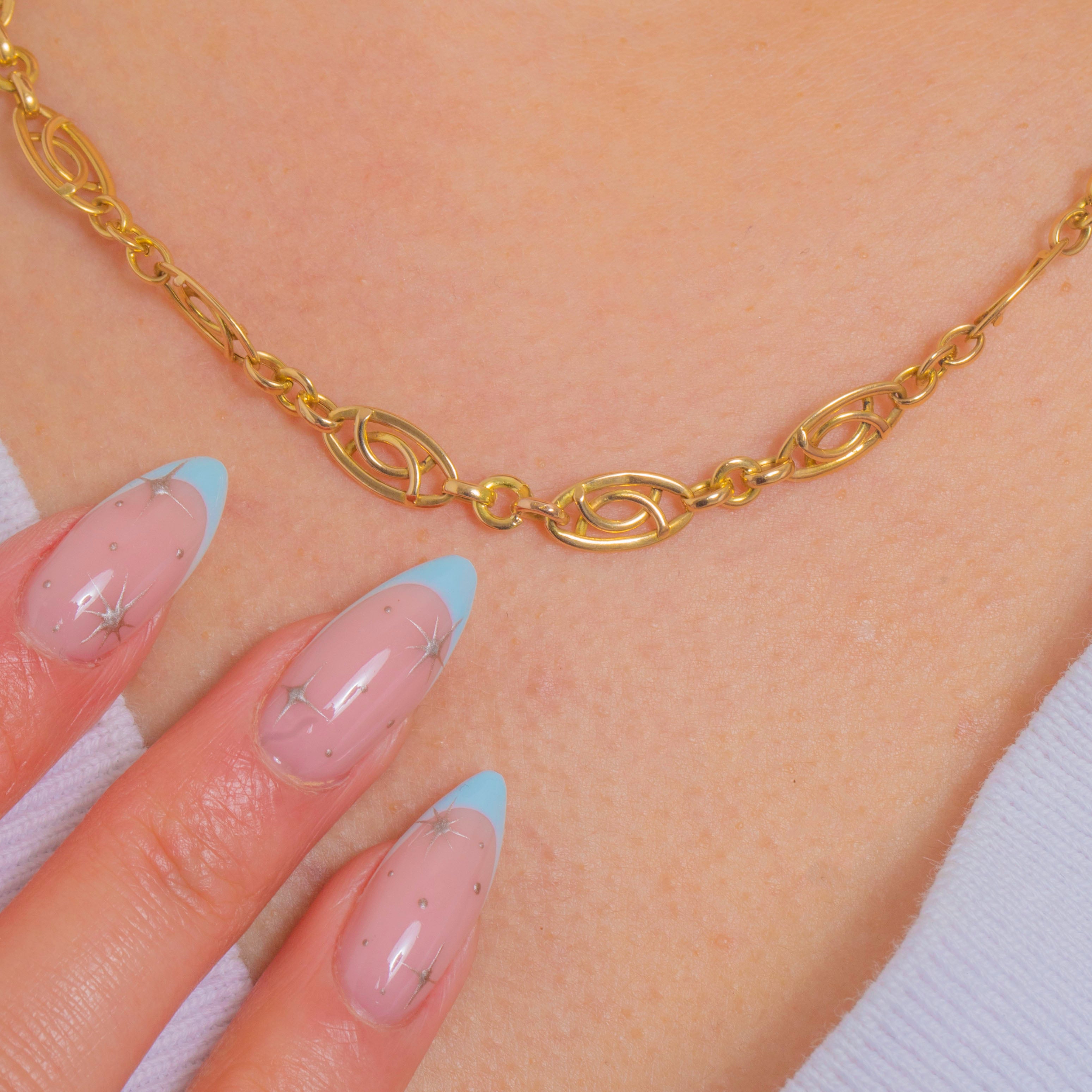 Elegant and refined, this Late Victorian French 18ct Gold fancy-link chain showcases a beautiful rhythm of openwork navette “eye” links that read as a subtle infinity motif. The warm glow of antique Gold and the clean geometry give this necklace a quietly luxurious presence that sits beautifully at the collarbone.
