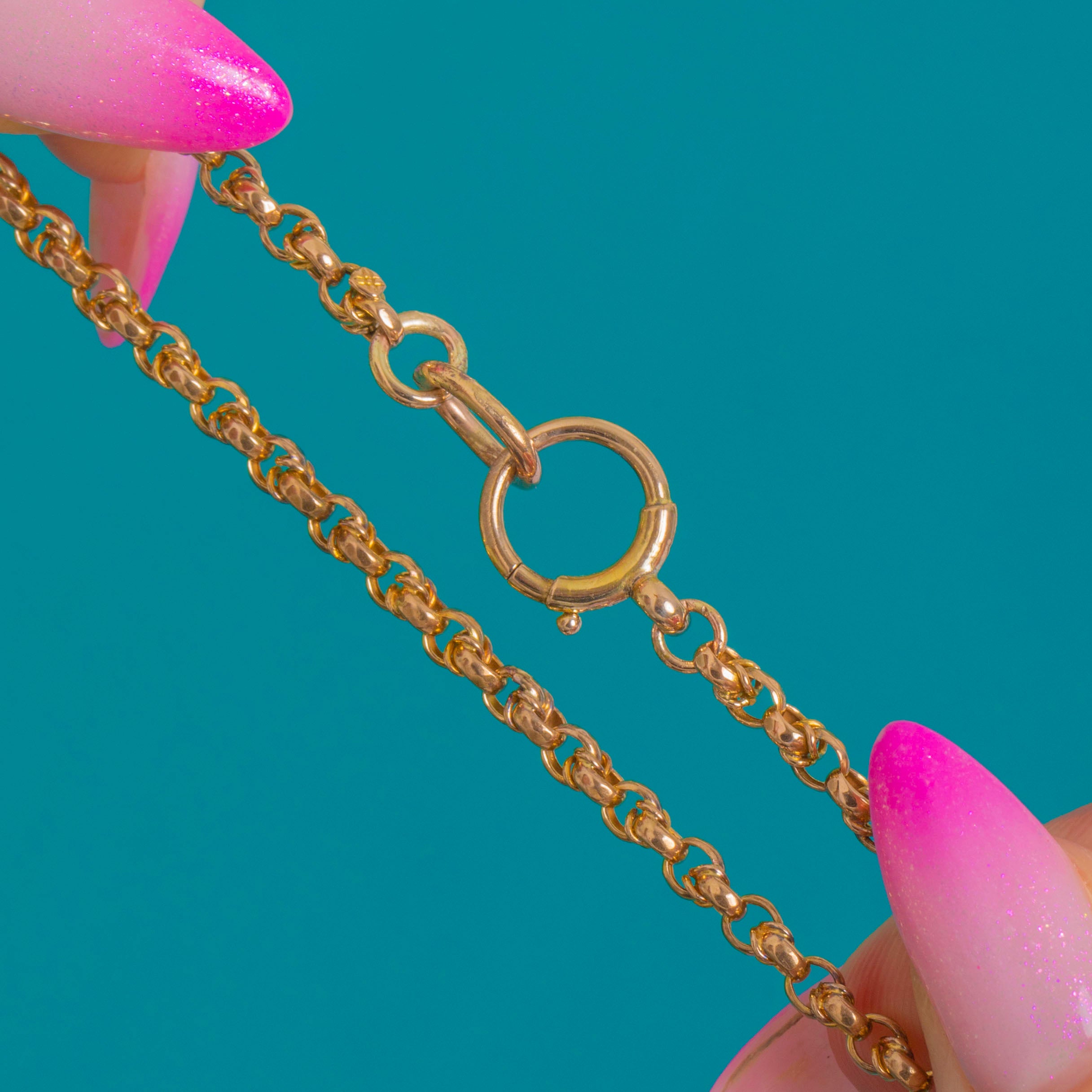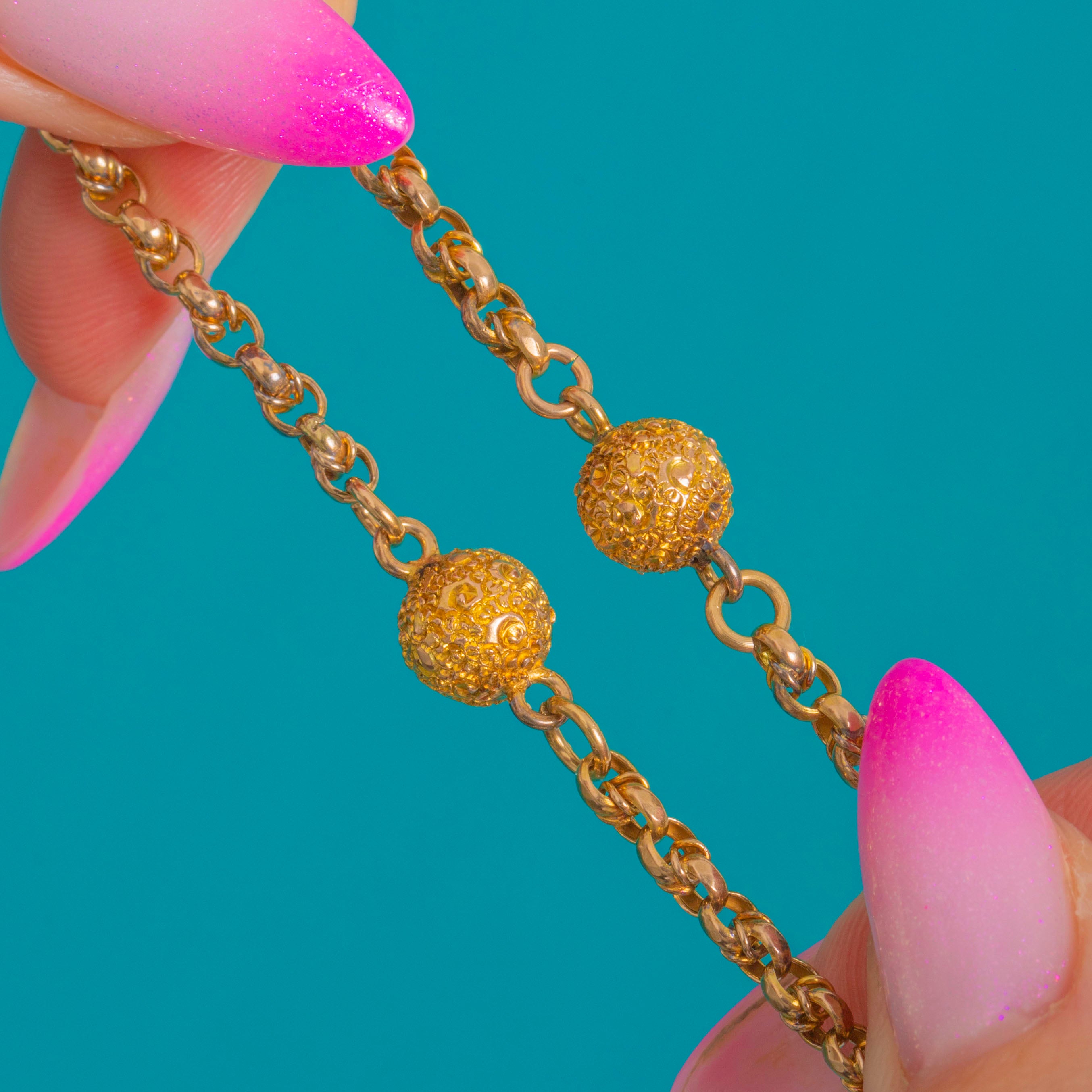 EXCELLENT: The Gold presents beautifully with minimal surface wear, and the textured ball detail remains crisp and well-defined. The links are in superb order and the bolt ring clasp closes securely. No evidence of repairs or alterations.