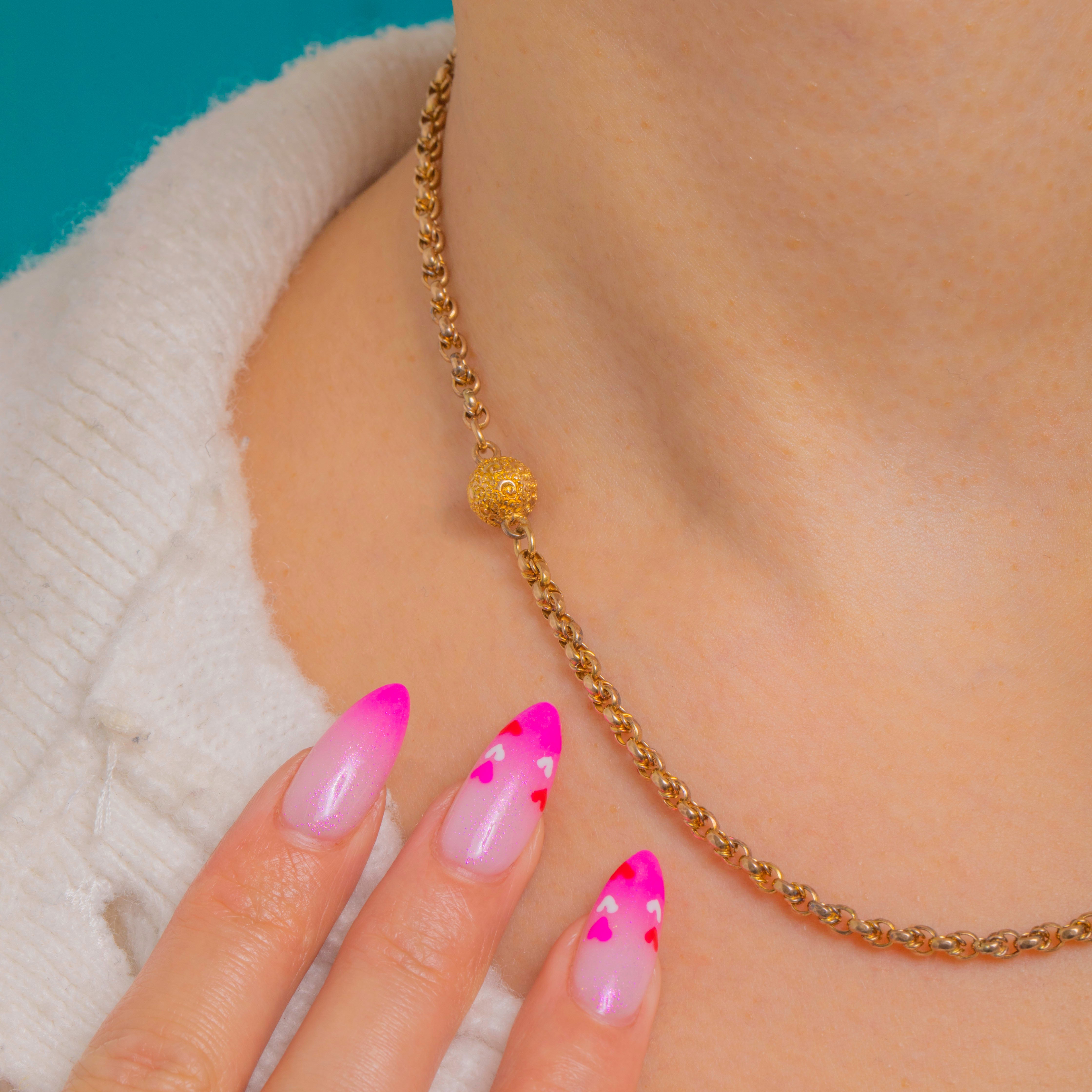 An elegant 9ct Gold fancy chain with a tactile ball-link accent, this necklace sits beautifully at the collarbone for effortless everyday luxury. The spherical bead is finely textured, lending a subtle sparkle and soft, granulated sheen against the warm Yellow Gold.