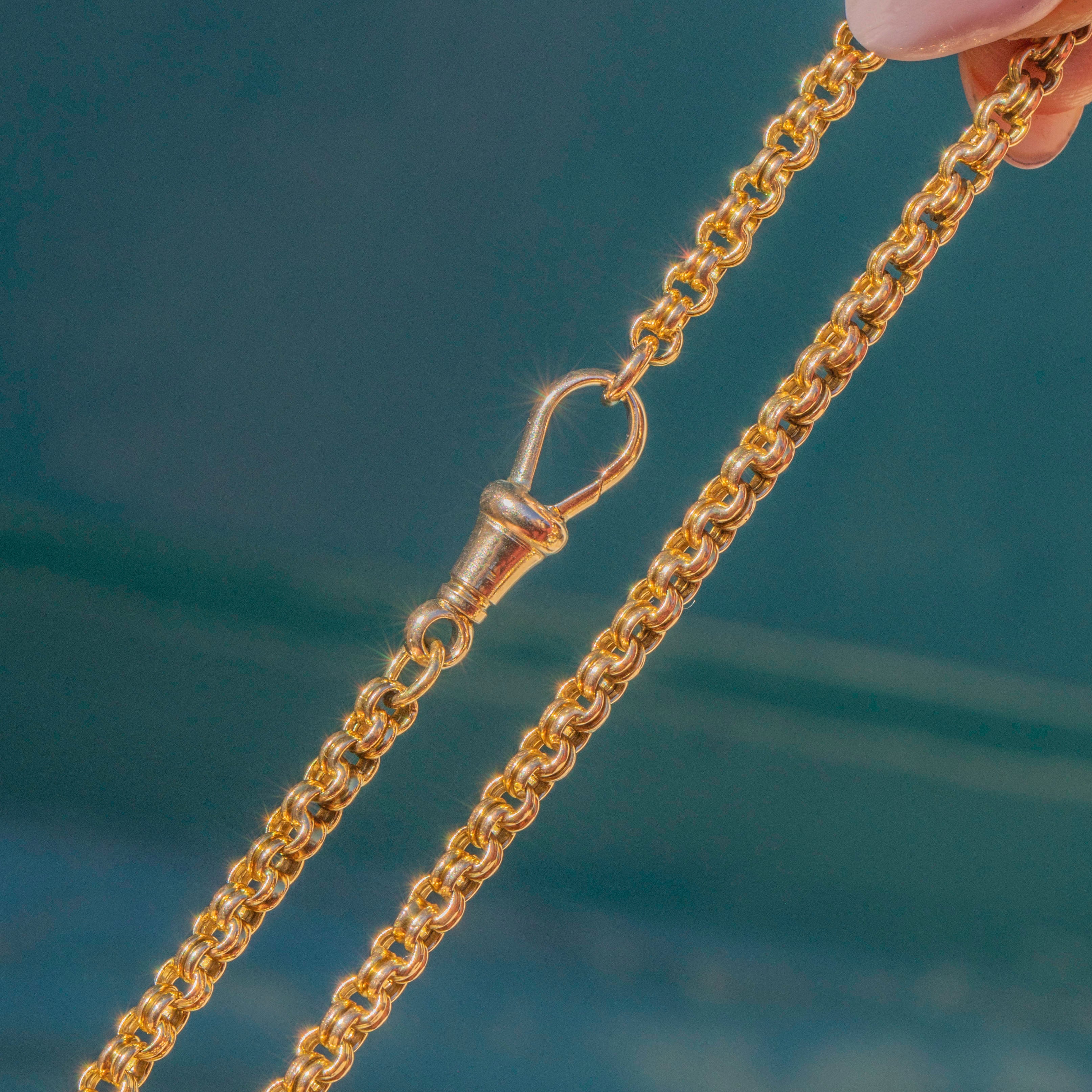 VERY GOOD-EXCELLENT. This antique 9ct Gold double belcher chain is in superb condition. The Gold has a glowing buttery hue with only minimal signs of wear commensurate with age. The double belcher links are robust and securely connected and the dog clip has great spring back allowing you to wear this phenomenal Victorian Gold chain with confidence!