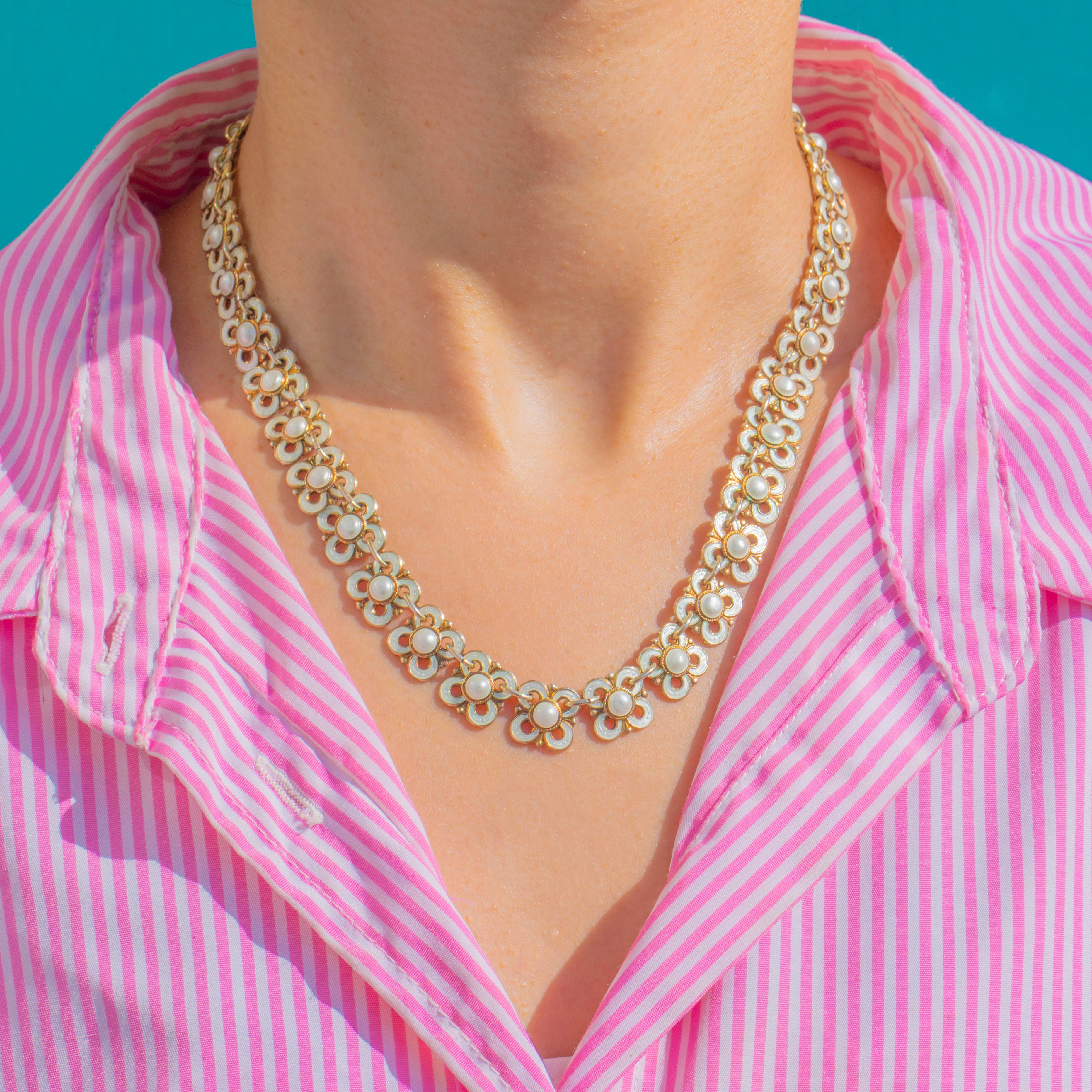 Chic and timeless, this Vintage 1940s David Anderson white Enamel flower necklace drapes a garland of luminous blossoms across the neckline. Each articulated link is rendered in Sterling Silver gilded with 18ct Gold, the creamy white Enamel petals offering a clean, elegant contrast that feels distinctly Scandinavian and effortlessly refined. At 16 inches, it sits beautifully at the collar and closes with a neat box clasp for a seamless finish.