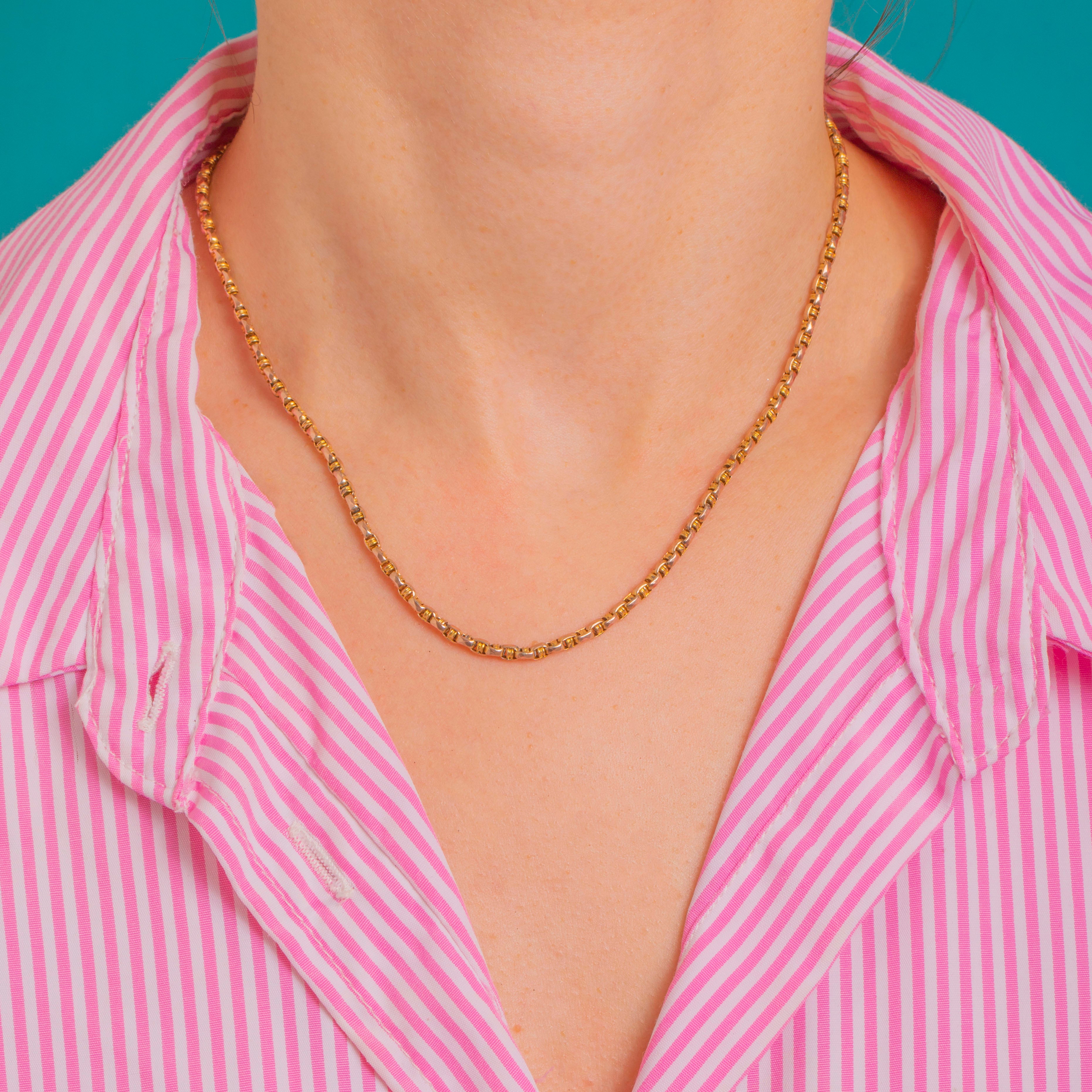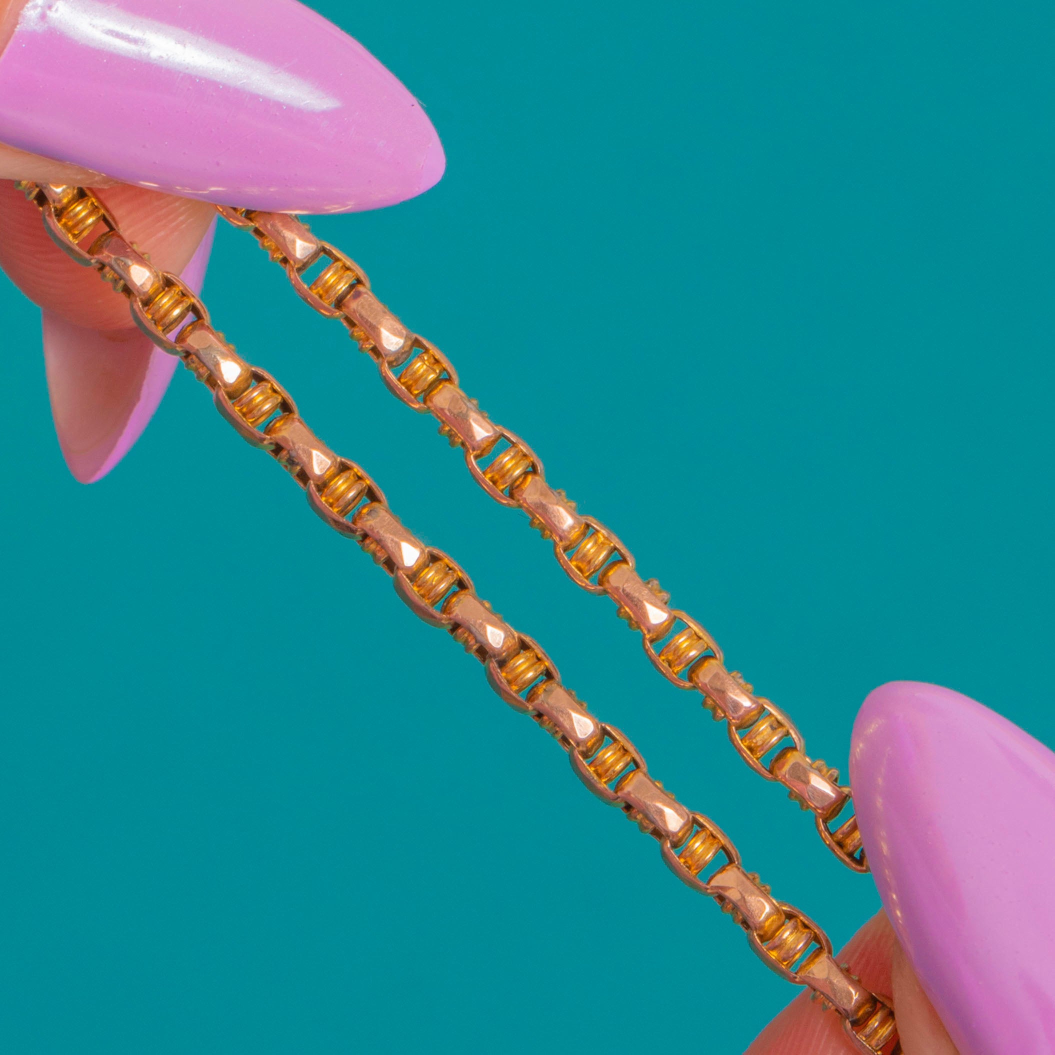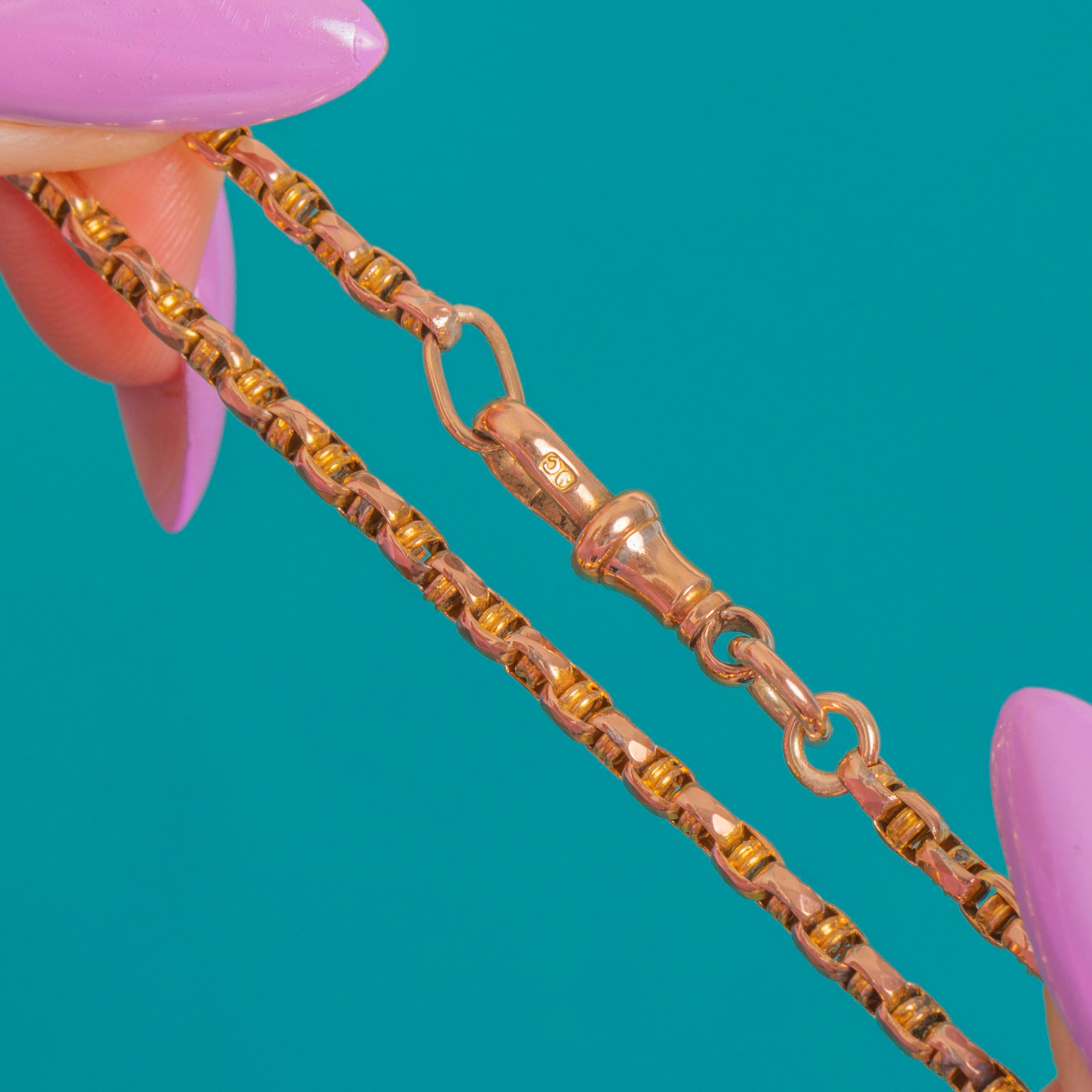 A beautifully made Victorian 9ct Gold fancy chain, crafted with articulated, geometric links that catch the light with every move. Each faceted rectangular link is punctuated by subtle ribbed details, giving the chain a refined, architectural rhythm and a gentle play of light and shadow across its polished surfaces.