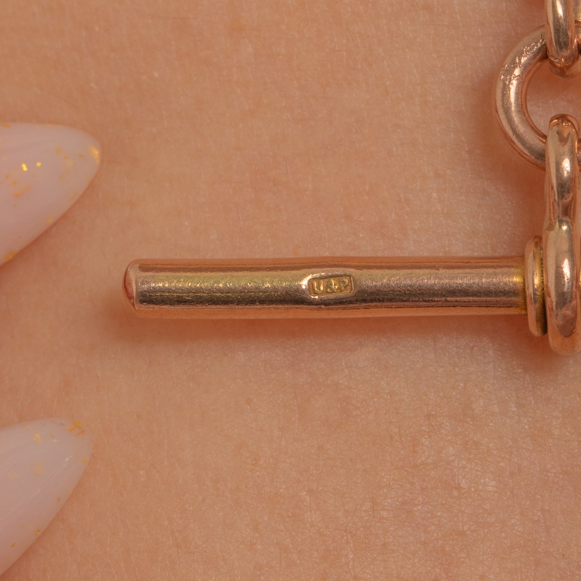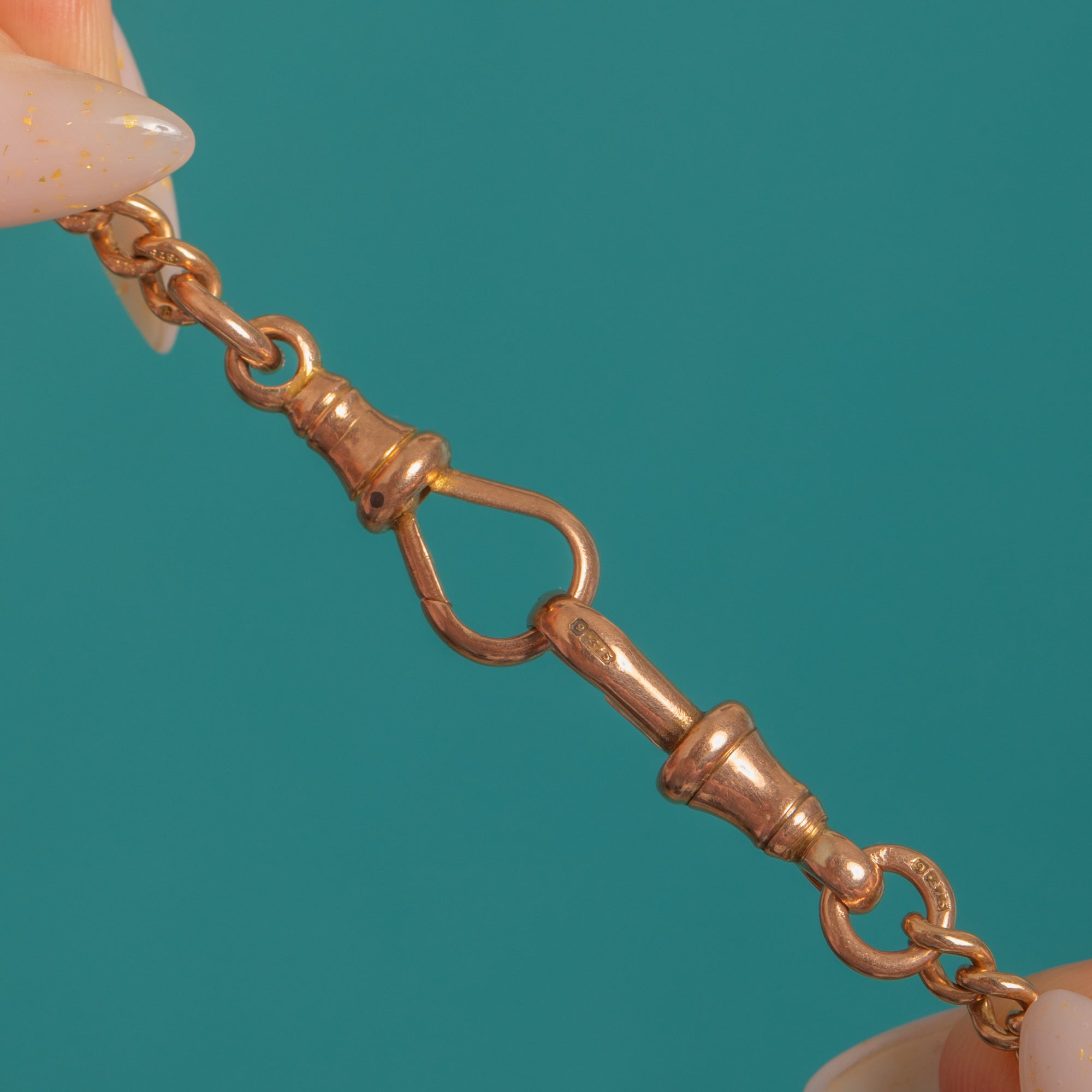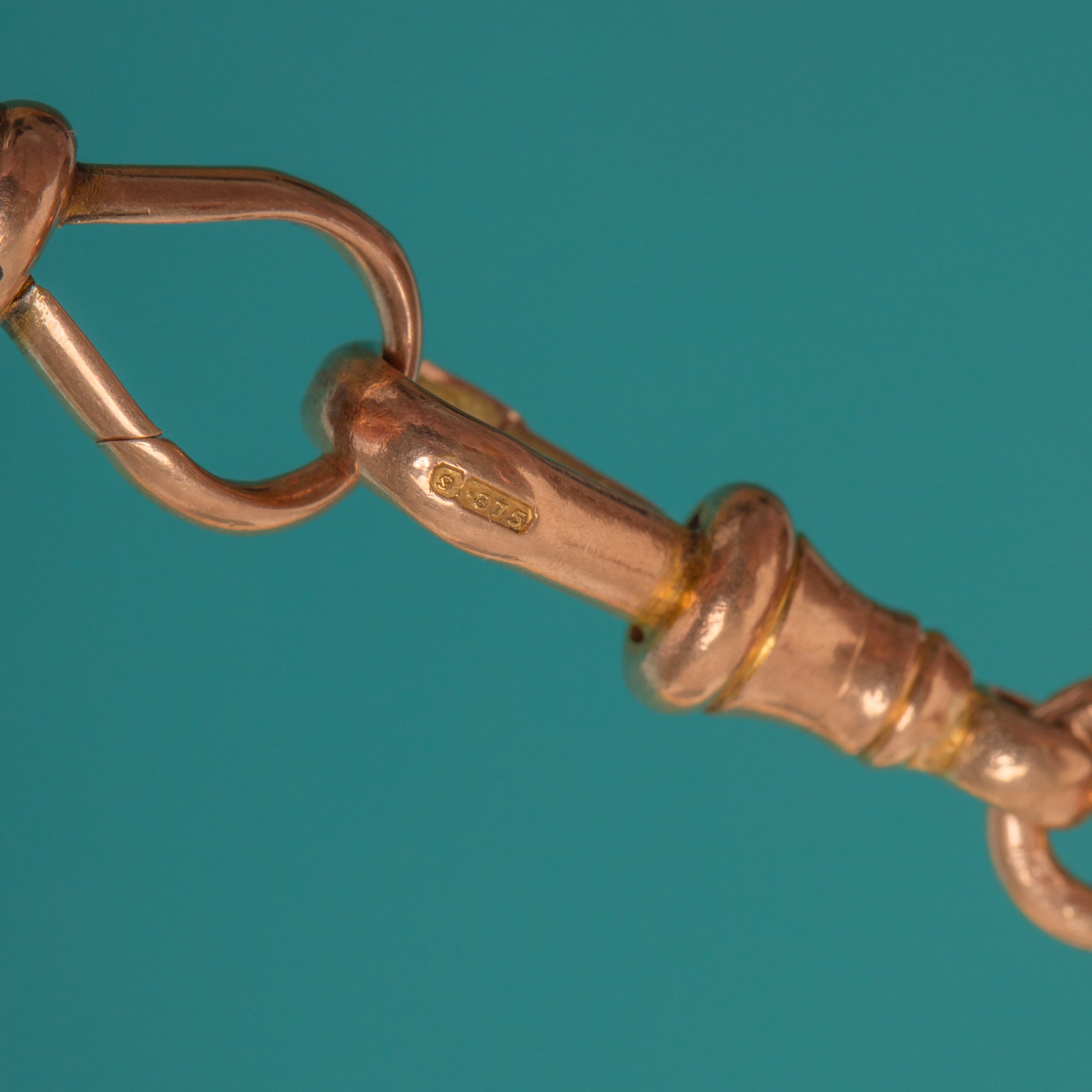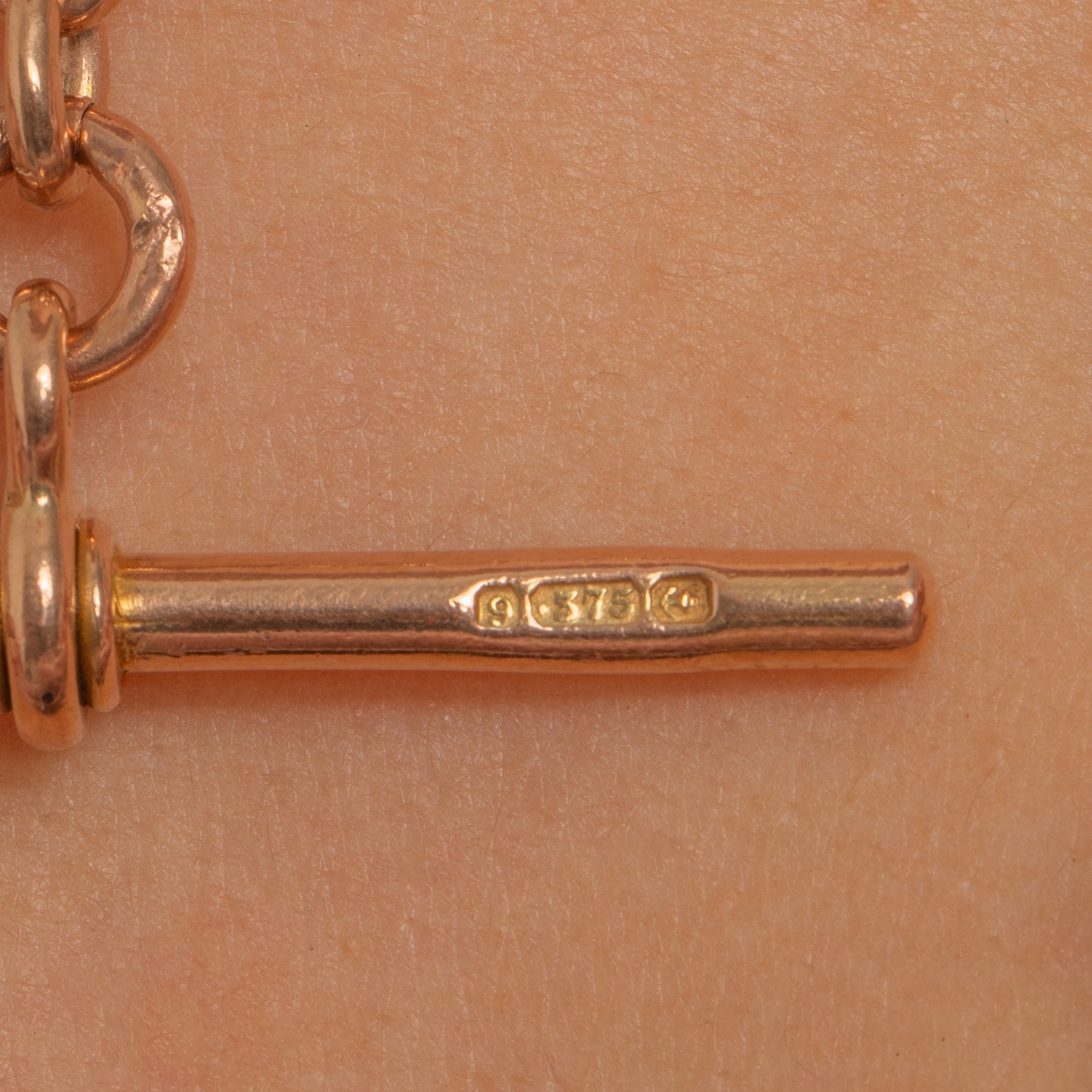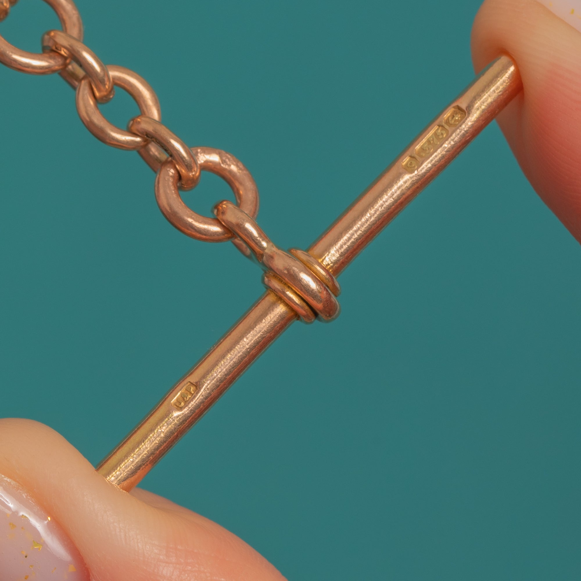 HALLMARKS: Each link stamped “9 .375”, both dog clips stamped “9 .375”, T-bar stamped “9”, “375”, Birmingham anchor, and maker’s mark “U&P”.