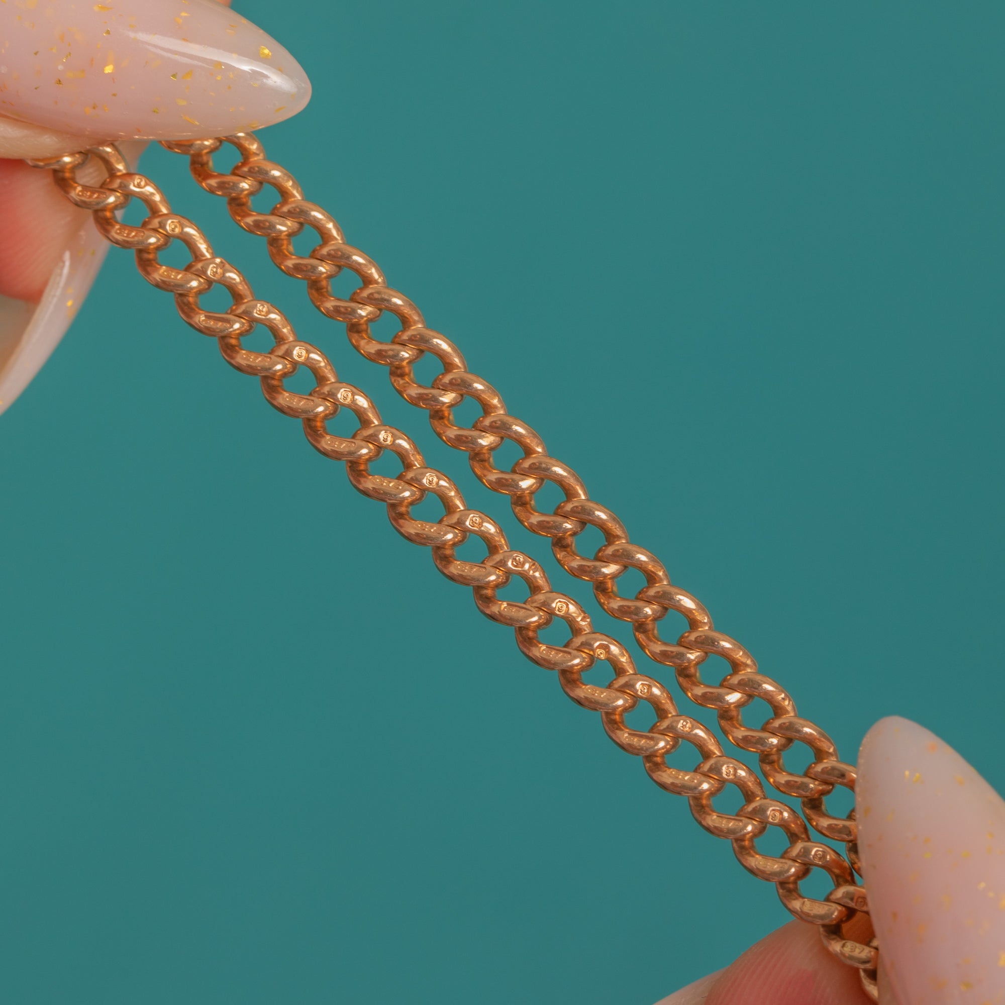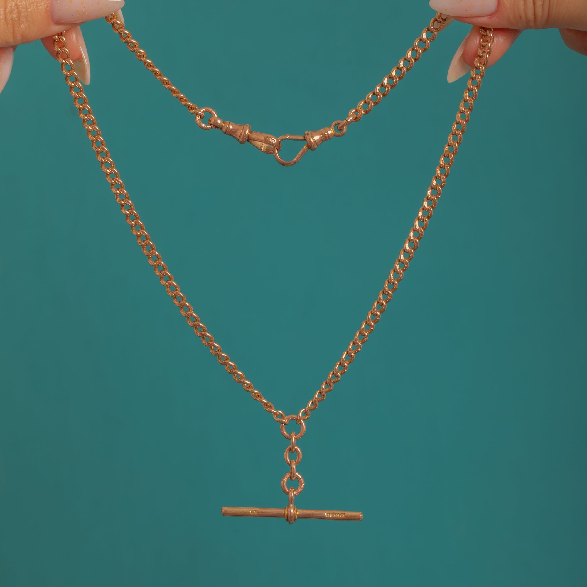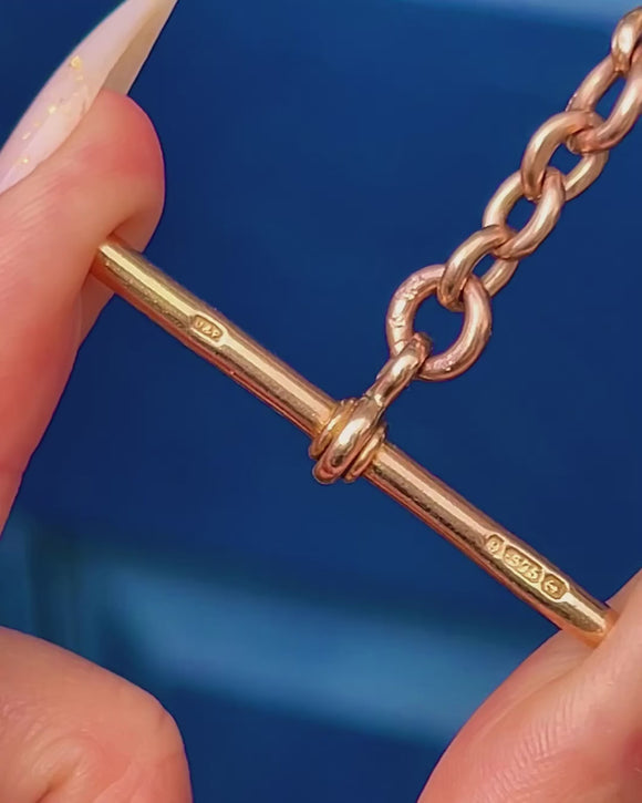 Immensely satisfying in both look and feel, this Victorian 9ct Gold Albert chain pairs polished curb links with a stationary T-bar drop and twin dog-clips for that timeless watch-chain allure. The Gold has a warm, rosy-yellow hue and the chain carries a reassuring heft, offering a luxurious drape and a robust, unisex presence.