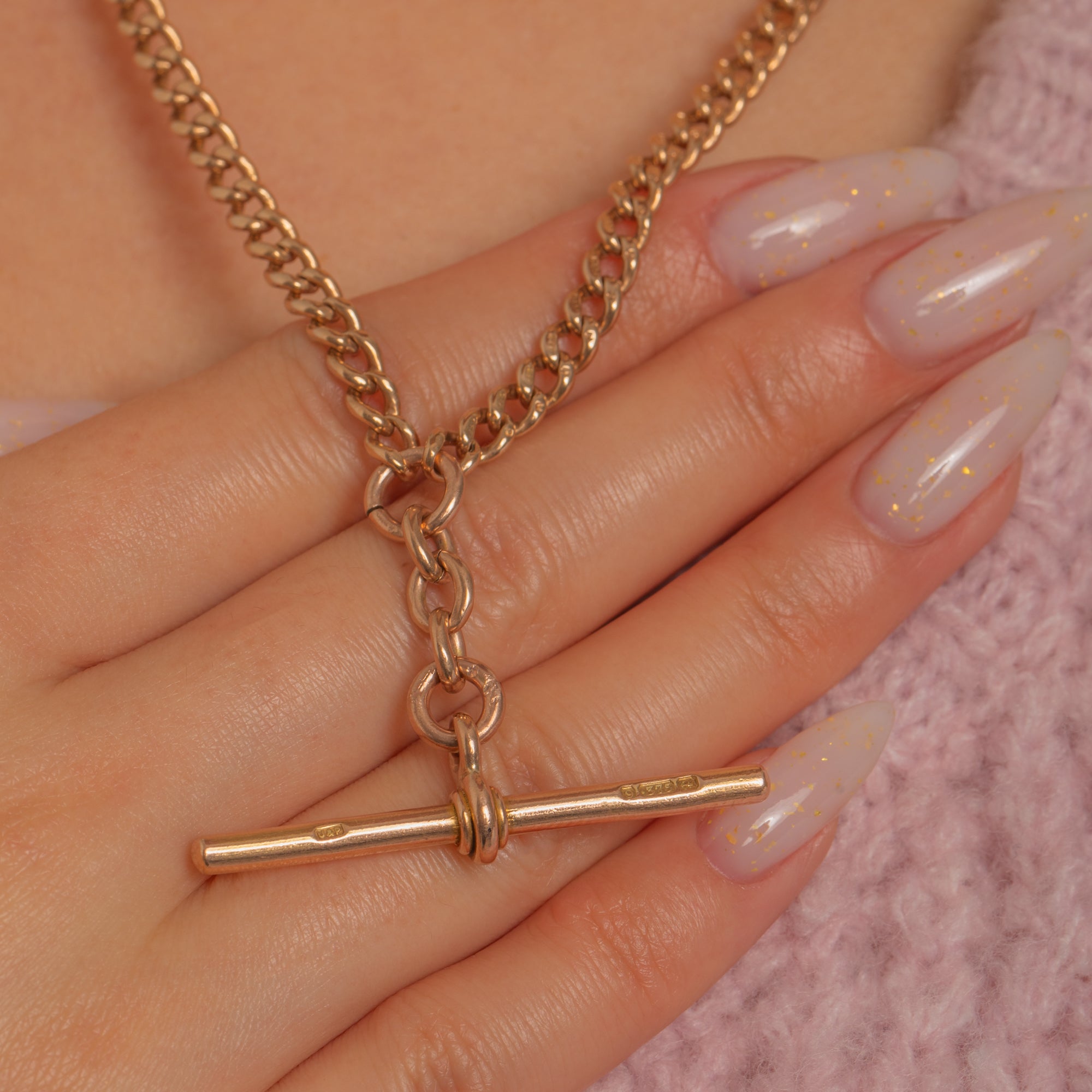 Beautifully made and complete with a matching double dog-clip connector in the same style, it’s a classic through and through. Crisp British hallmarks on the T-bar, and purity marks across the links and clips, underscore its quality and authenticity—an elegant staple to be worn everyday.