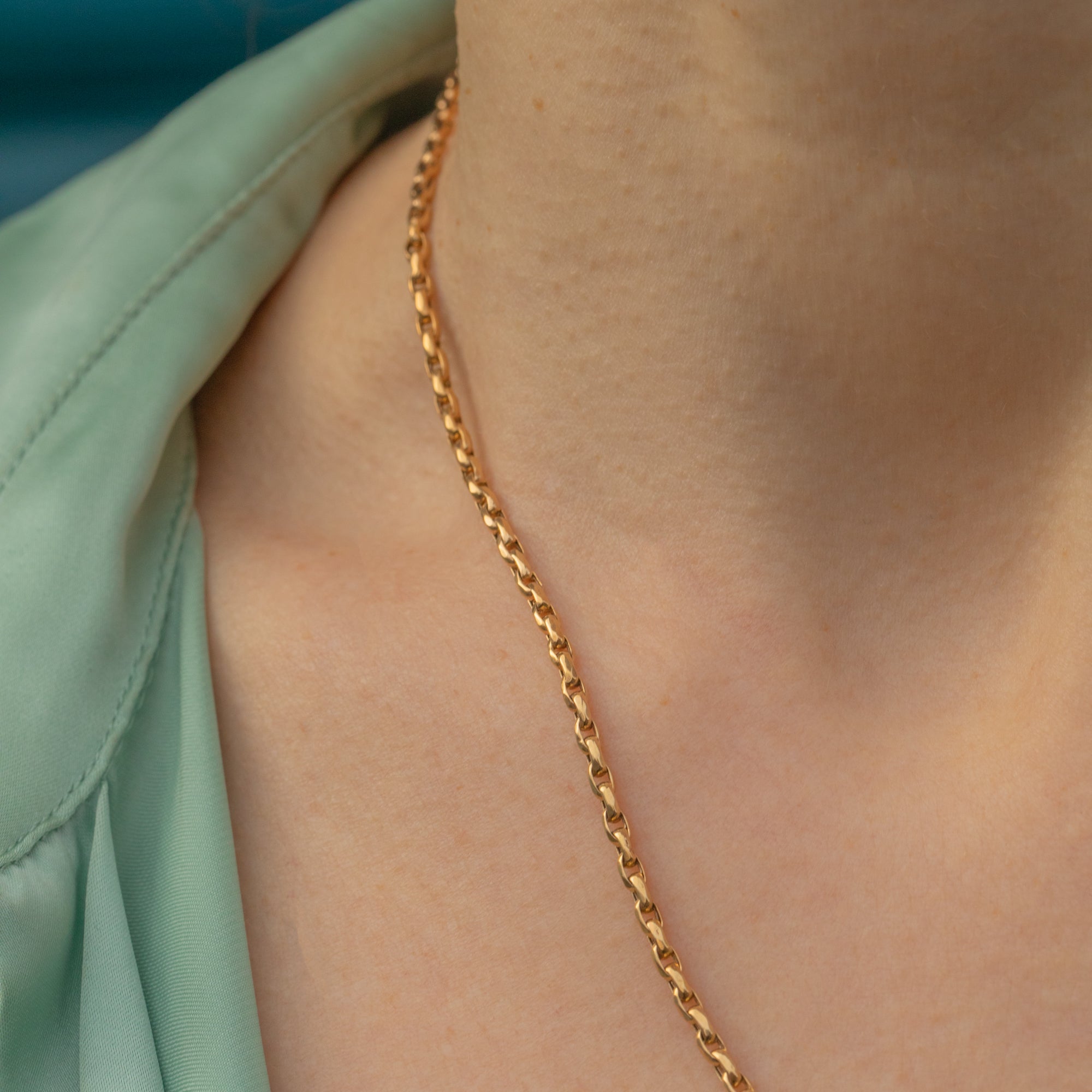 Crafted from buttery 9ct Gold throughout, this Victorian chain is versatile and elegant. Her belcher links are smooth and saturated, and at 18" long, she glides like liquid Gold across your décolletage.
