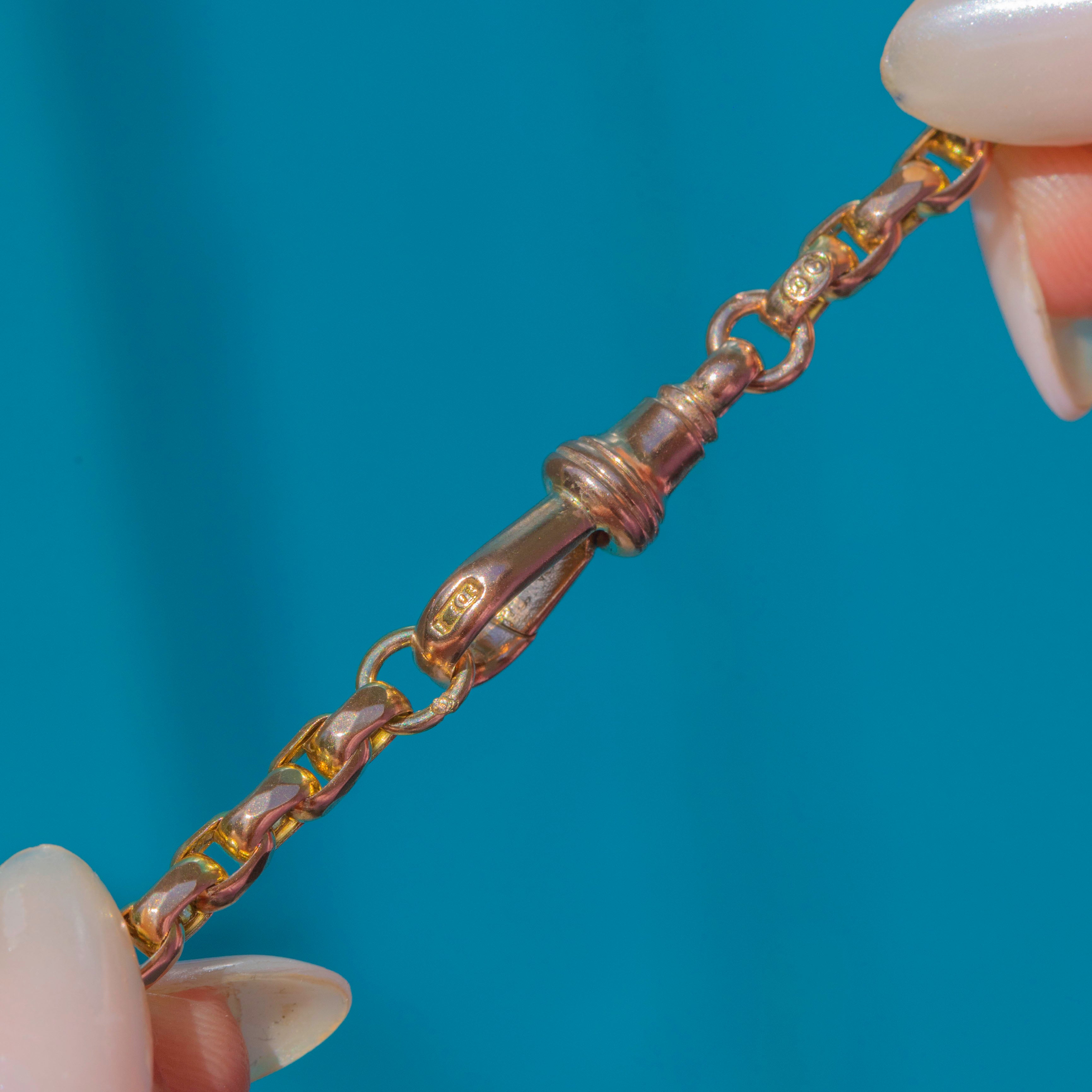 Crafted from solid 9ct Gold with a rare 9C tag, this Victorian belcher chain is a versatile 18" in length and comes complete with a highly sought-after dog-clip, ready to attend to all your charm holding needs!