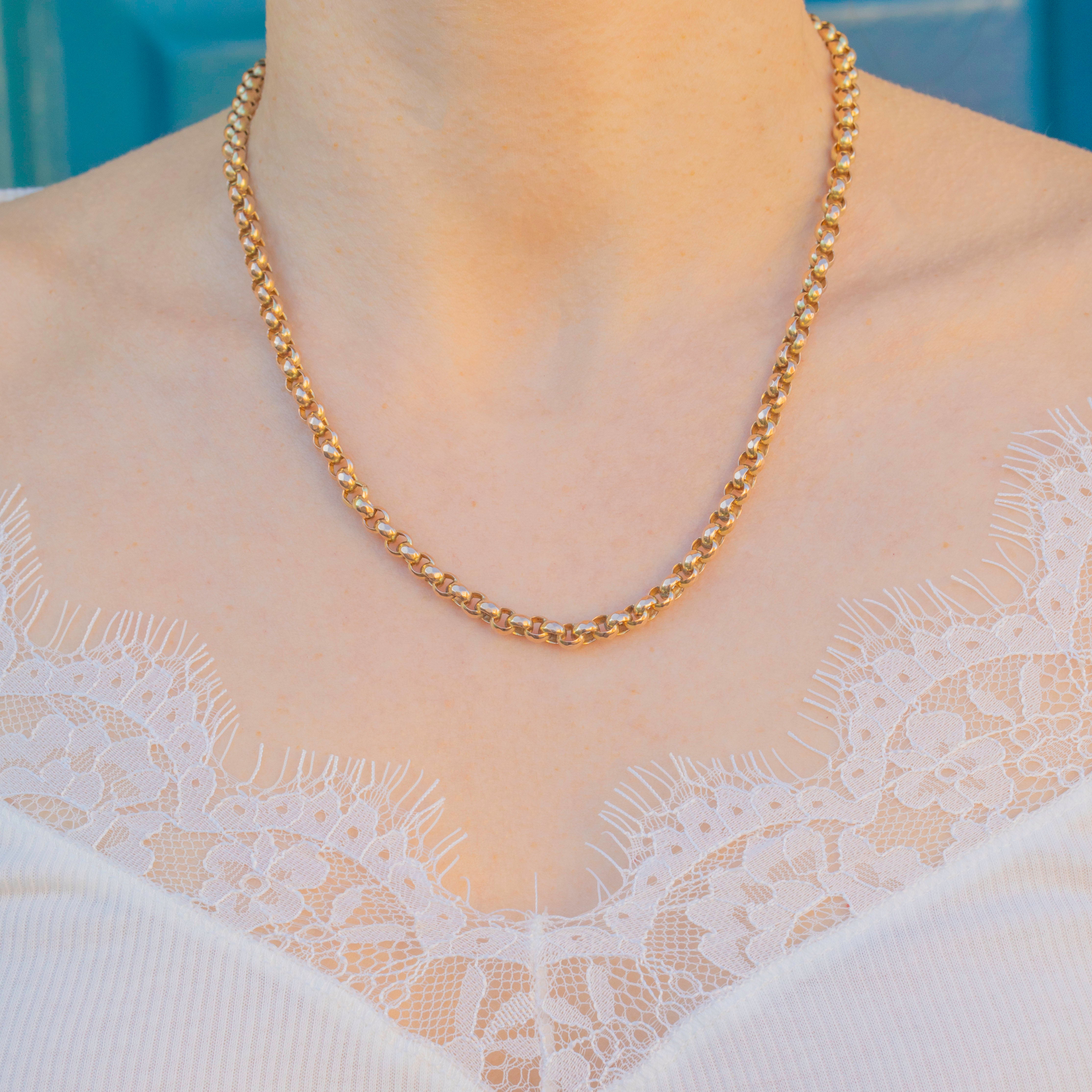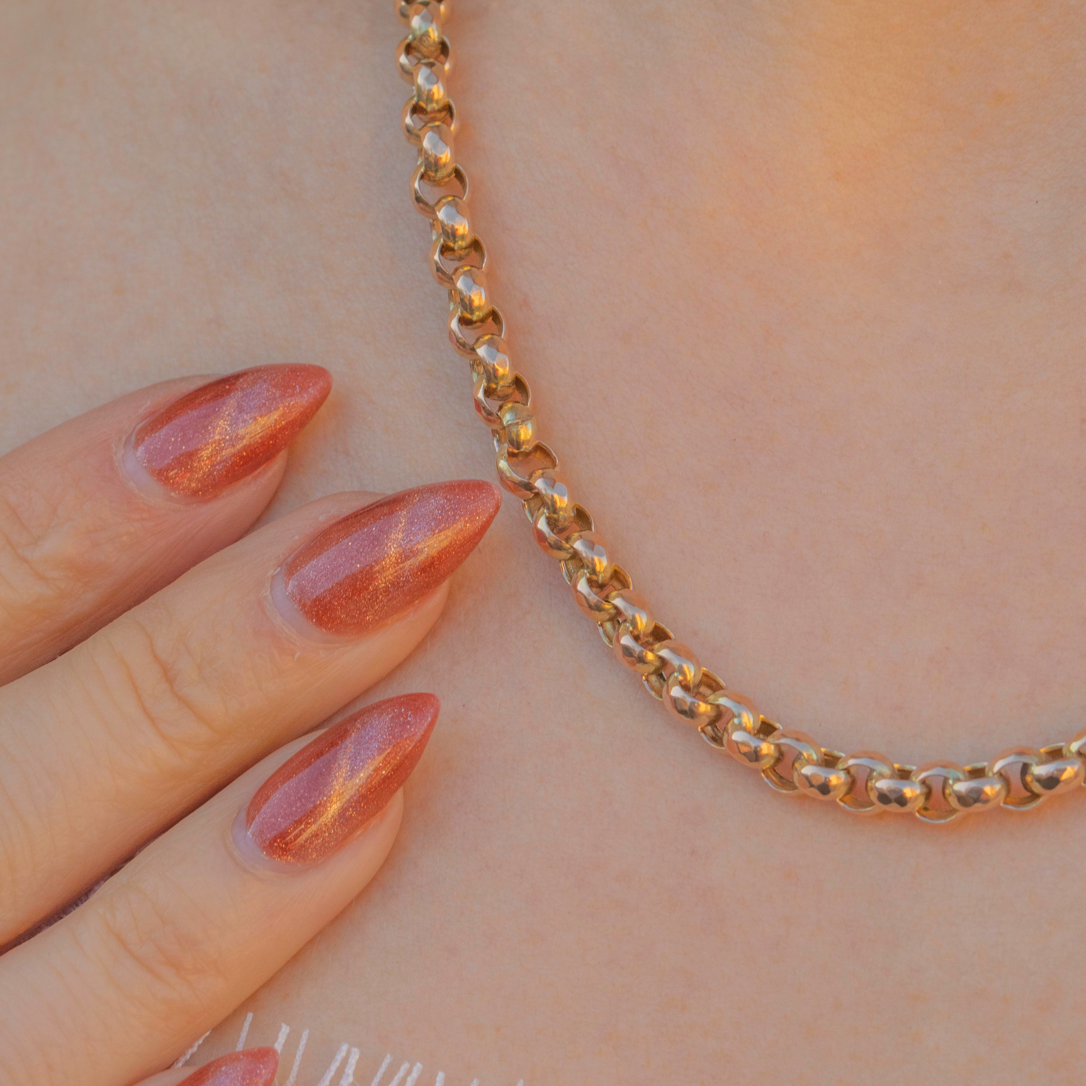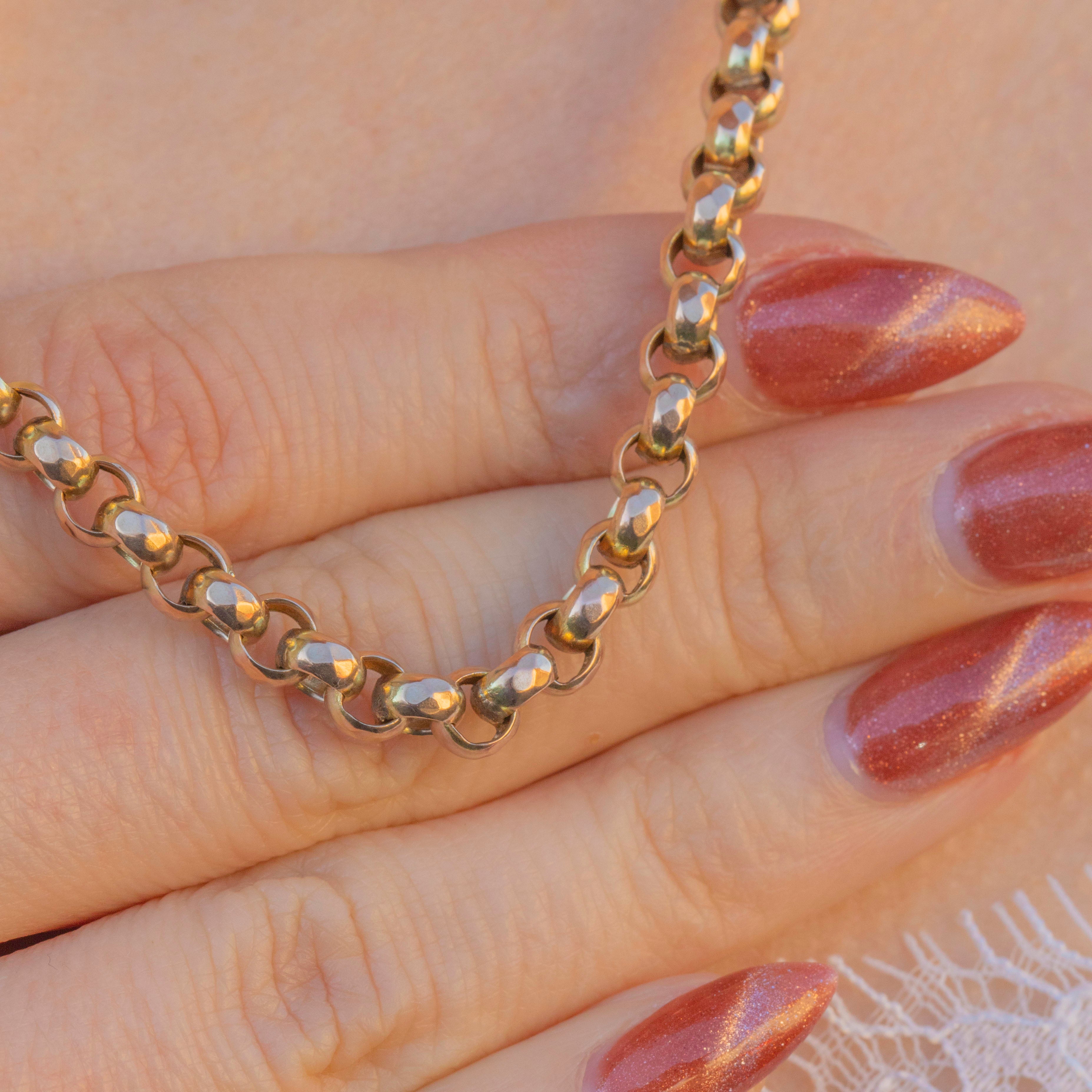 This chunky antique 9ct Gold faceted belcher chain will make a stand-out addition to your neck stack! Exuding decadence, the 18" length is made up of chunky round links, each displaying crisp facets that catch the light magnificently and will send golden shimmers cascading across your décolletage.