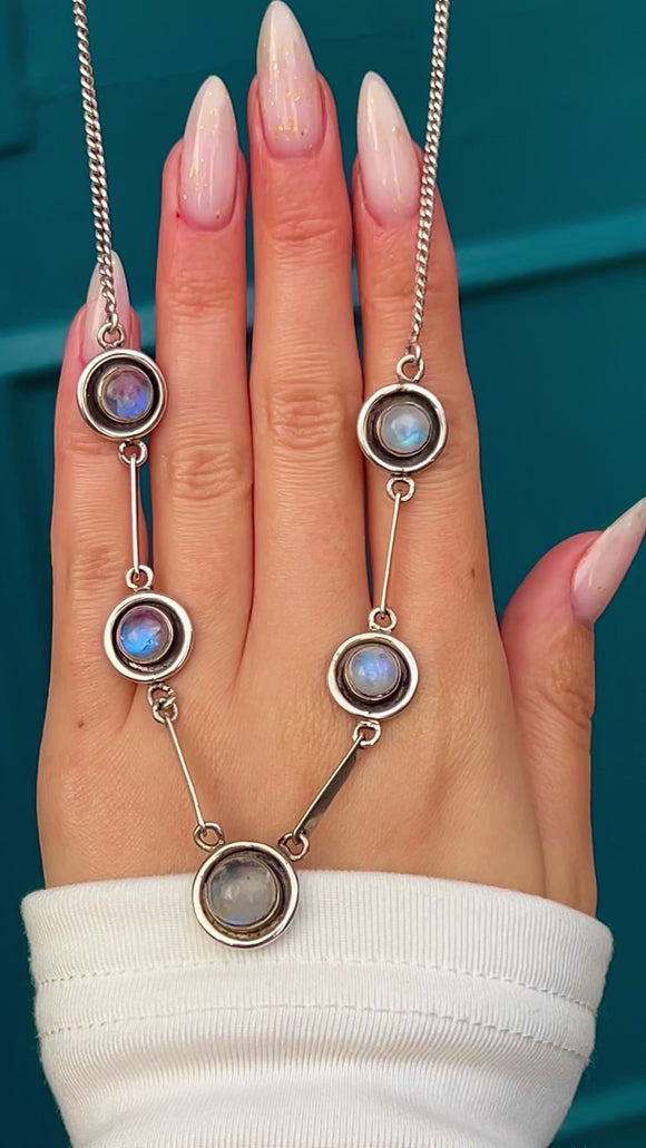 A sleek Art Deco station necklace alive with blue-flashed Moonstone cabochons, this piece balances minimalism with quiet drama. Five round Moonstones glow within concentric circular “target” mounts, their luminous sheen amplified by softly oxidised Silver that lends depth and definition.