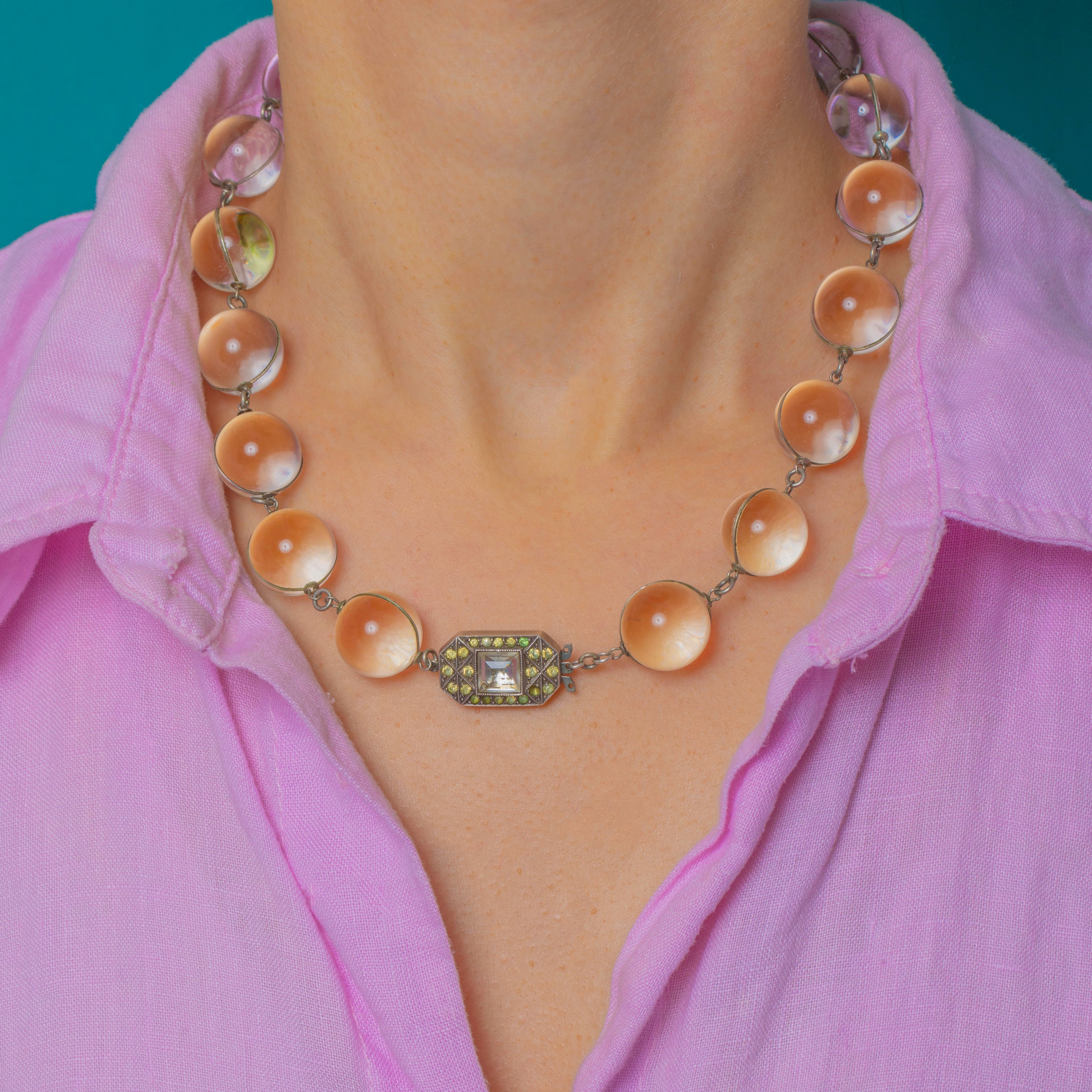 This Victorian Pools of Light necklace is a breathtaking piece, featuring large 15.5mm Rock Crystal orbs that glow with ethereal inner light. These perfectly clear spheres magnify whatever they touch, giving a magical, illuminated appearance unique to genuine Pools of Light jewellery.