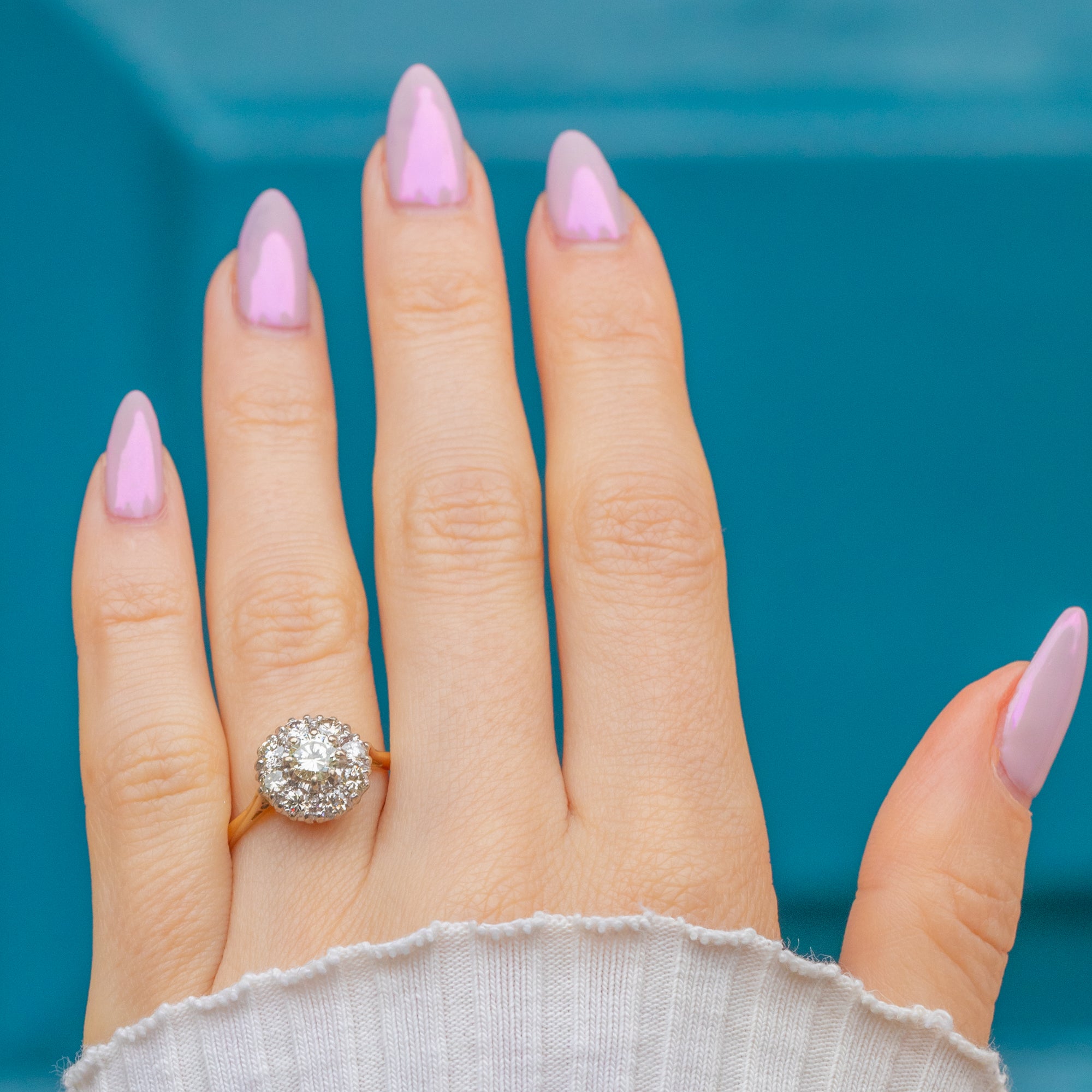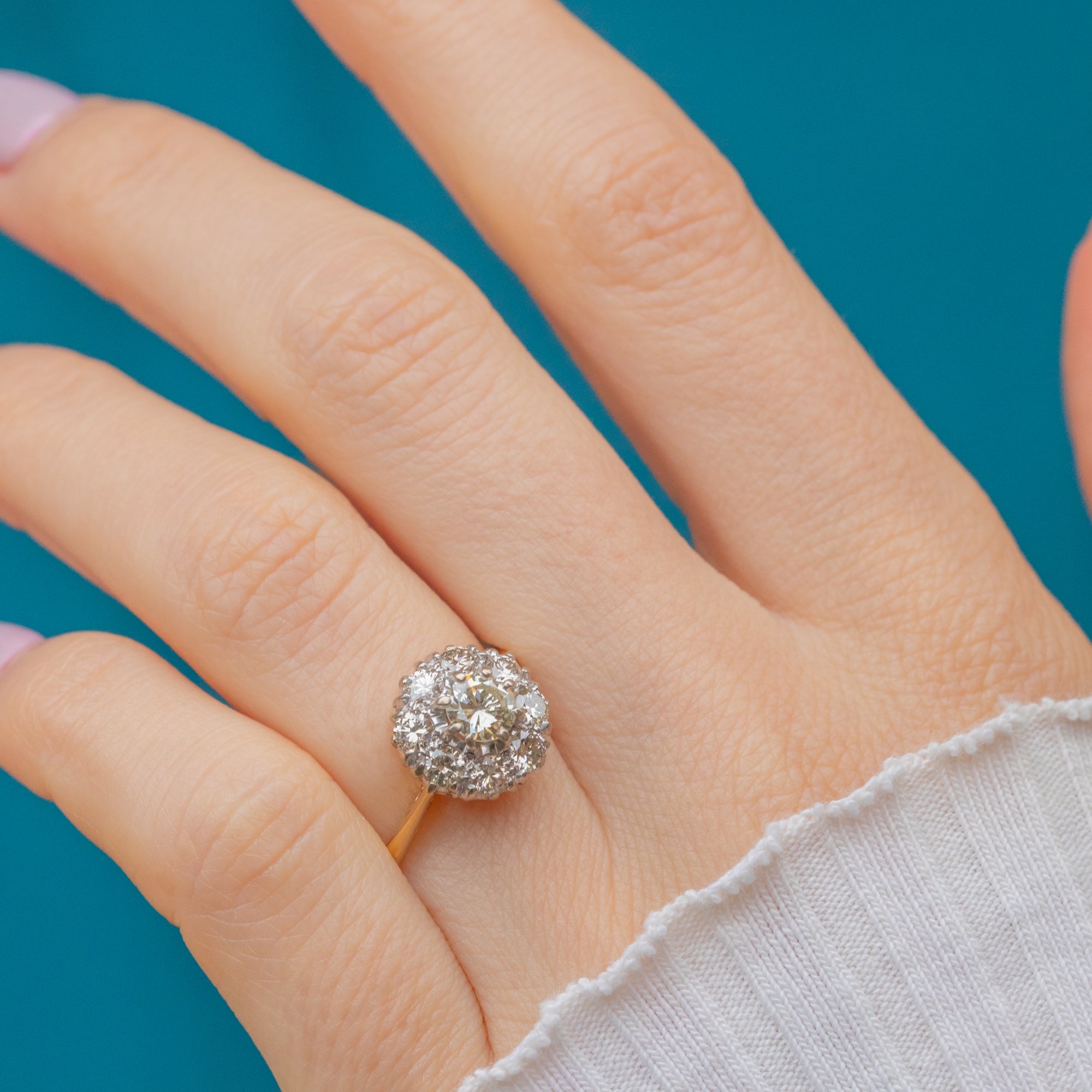 This breathtaking Mid-Century ring is set with a dazzling array of natural Diamonds totalling approximately 1.00ct. The central Diamond measures around 5mm, surrounded by a halo of 2.5mm stones in a radiant cluster formation that amplifies the sparkle and light from every angle.