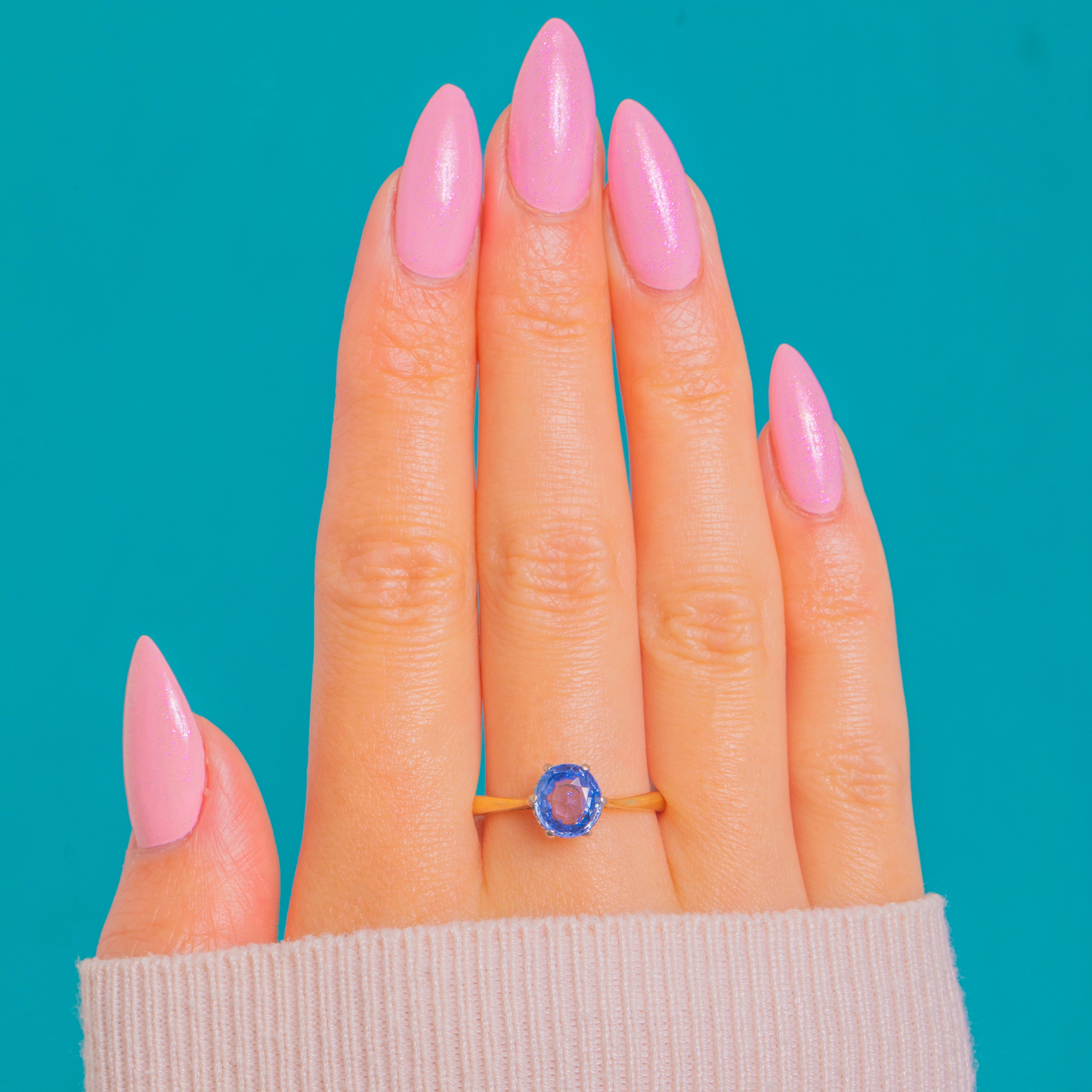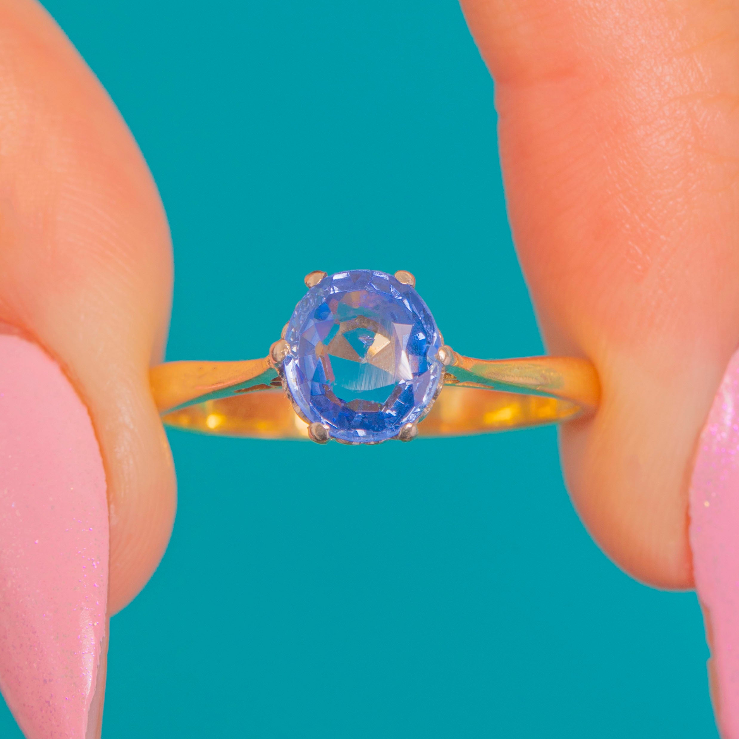 A luminous 1.75ct no-heat Cornflower Blue Sapphire takes centre stage in this refined Vintage solitaire. The vivid blue is elevated in a crisp Platinum six-claw coronet with a delicately scalloped, pierced gallery, poised above a slim, tapered 18ct Gold band for a beautifully airy, light-catching profile.