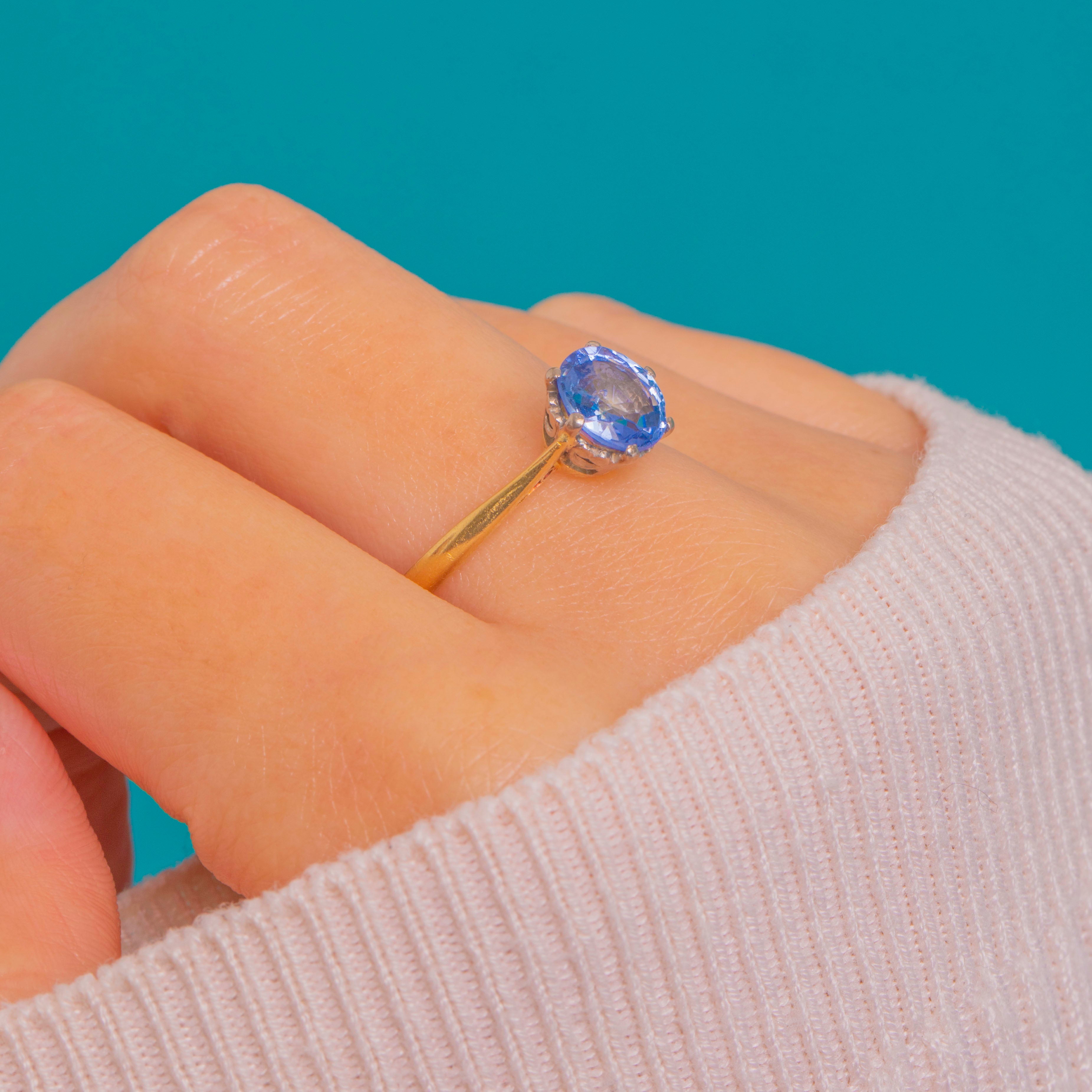 EXCELLENT: The Sapphire is bright with light facet wear and internal characteristics visible under magnification only. The six-claw setting is secure; the Platinum head and 18ct Gold shank show fine surface wear and light scratches consistent with age. Hallmarks are clear with no obvious signs of resizing or repair.