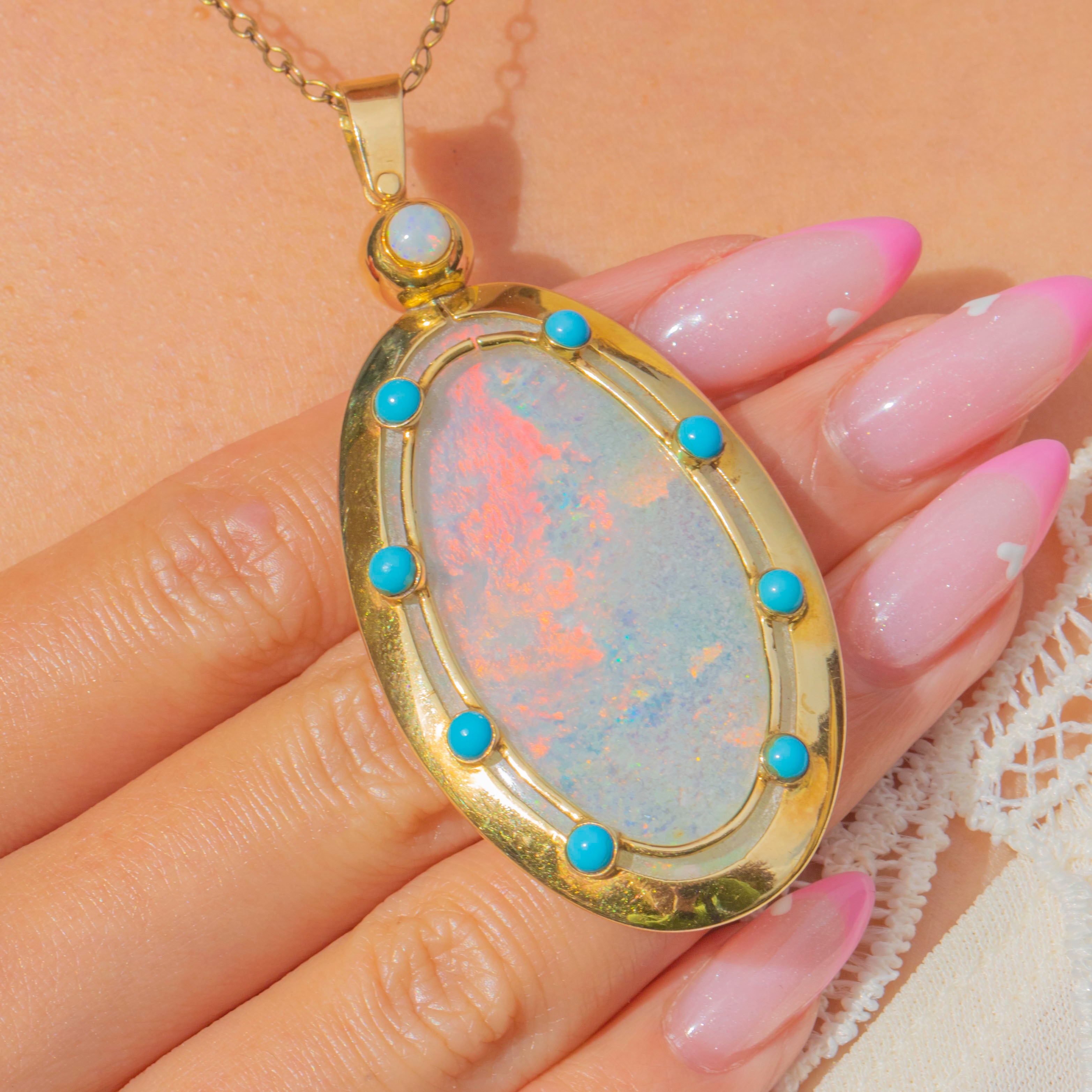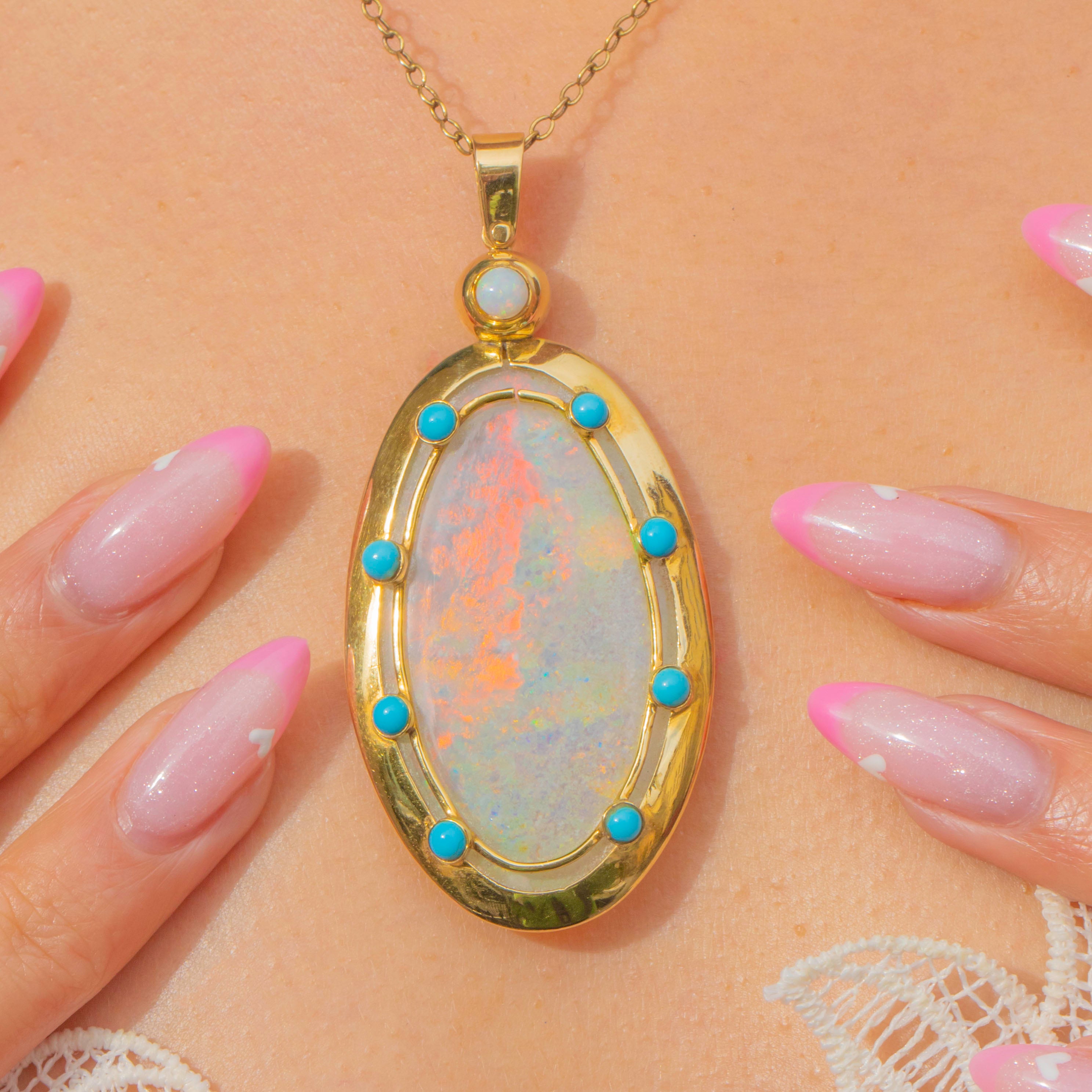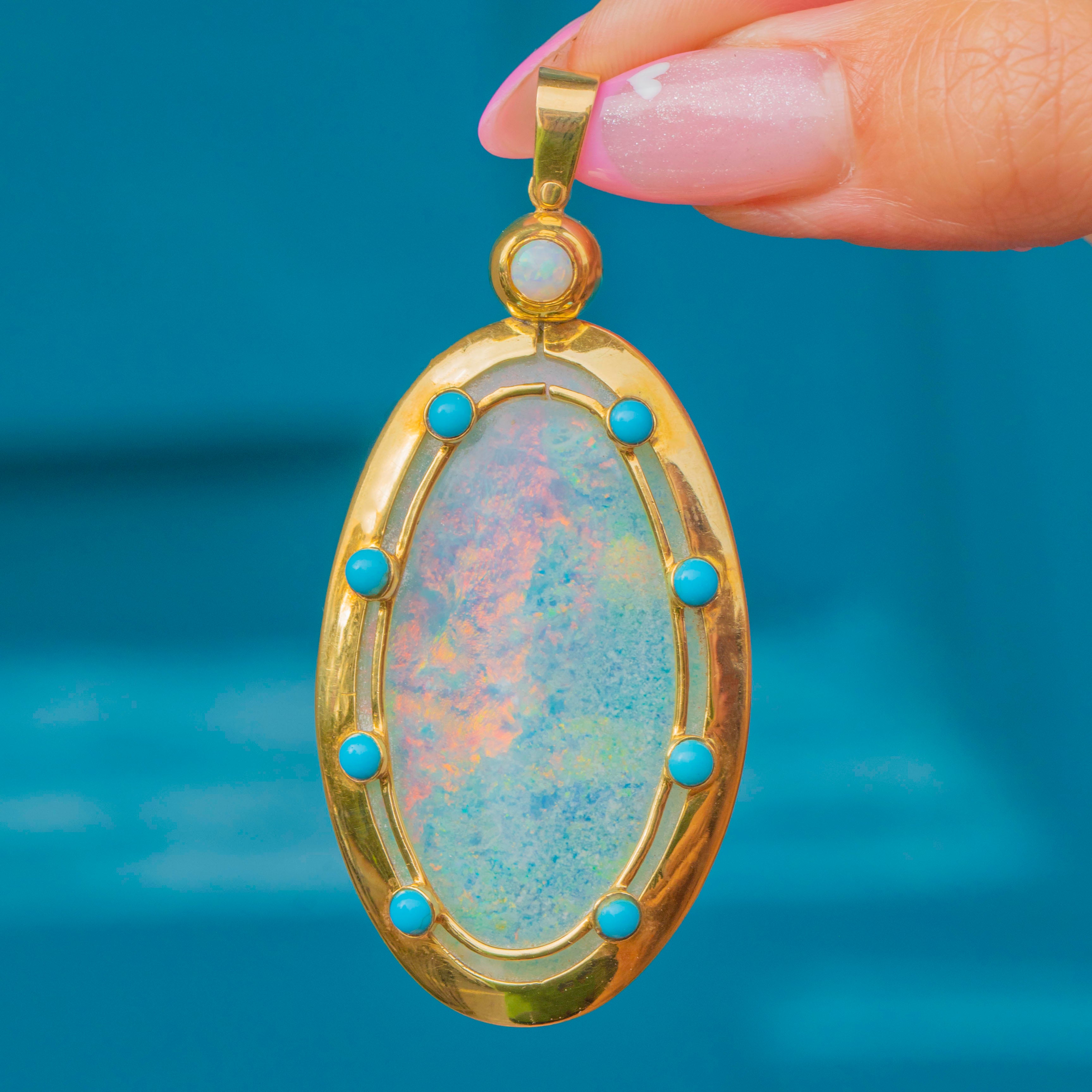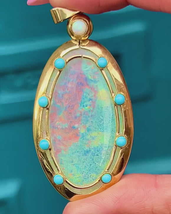 An extraordinary Mid-Century pendant showcasing a large 55.00ct Andamooka Opal set in luxurious 18ct Gold, framed by bright Turquoise cabochons. The natural Opal exhibits spectacular play-of-colour,  flashes of green, gold and blue that shift beautifully with movement. Treated to enhance its colourplay, this Australian gem is full of depth and life, a statement piece that captures the bold glamour of the 1950s–60s era.
