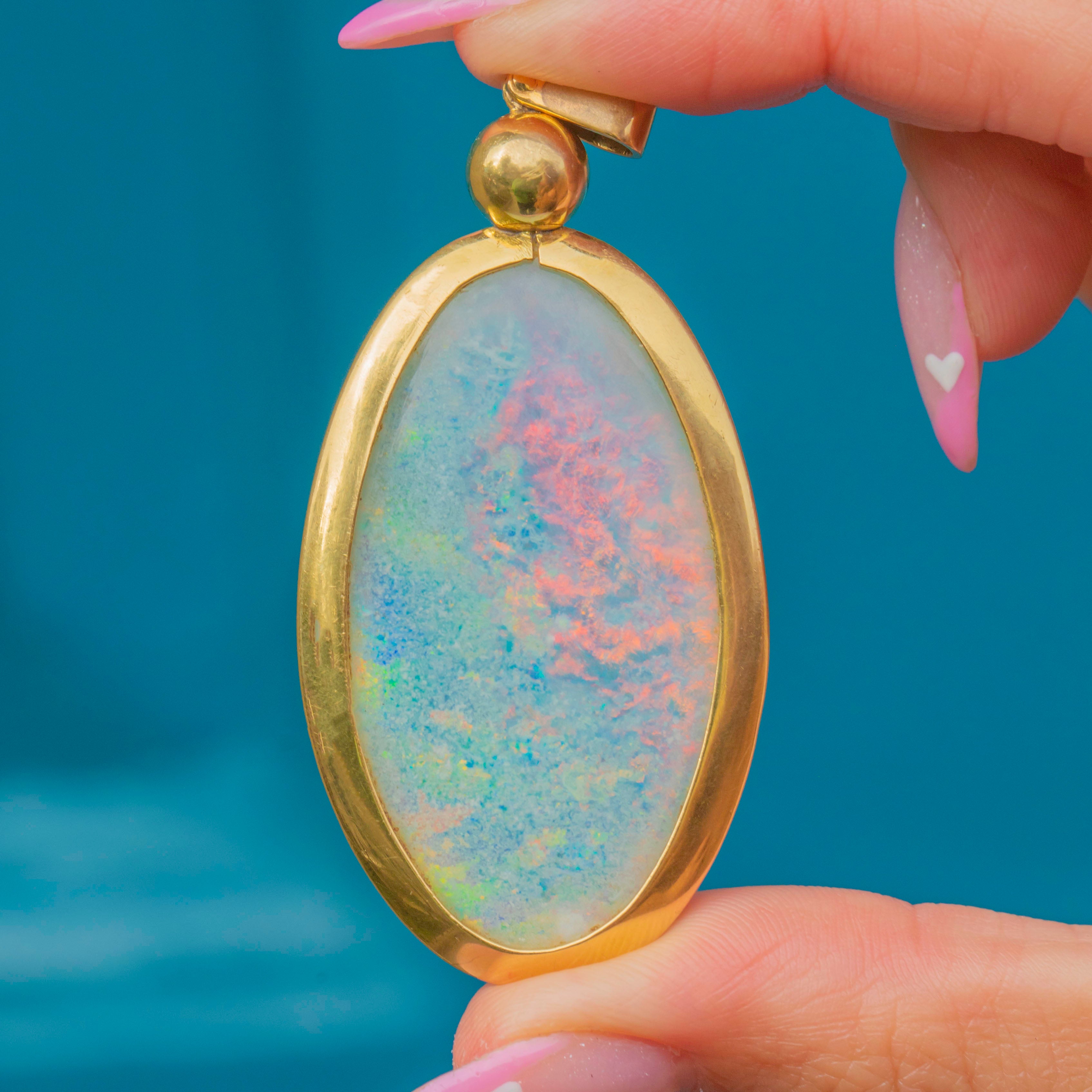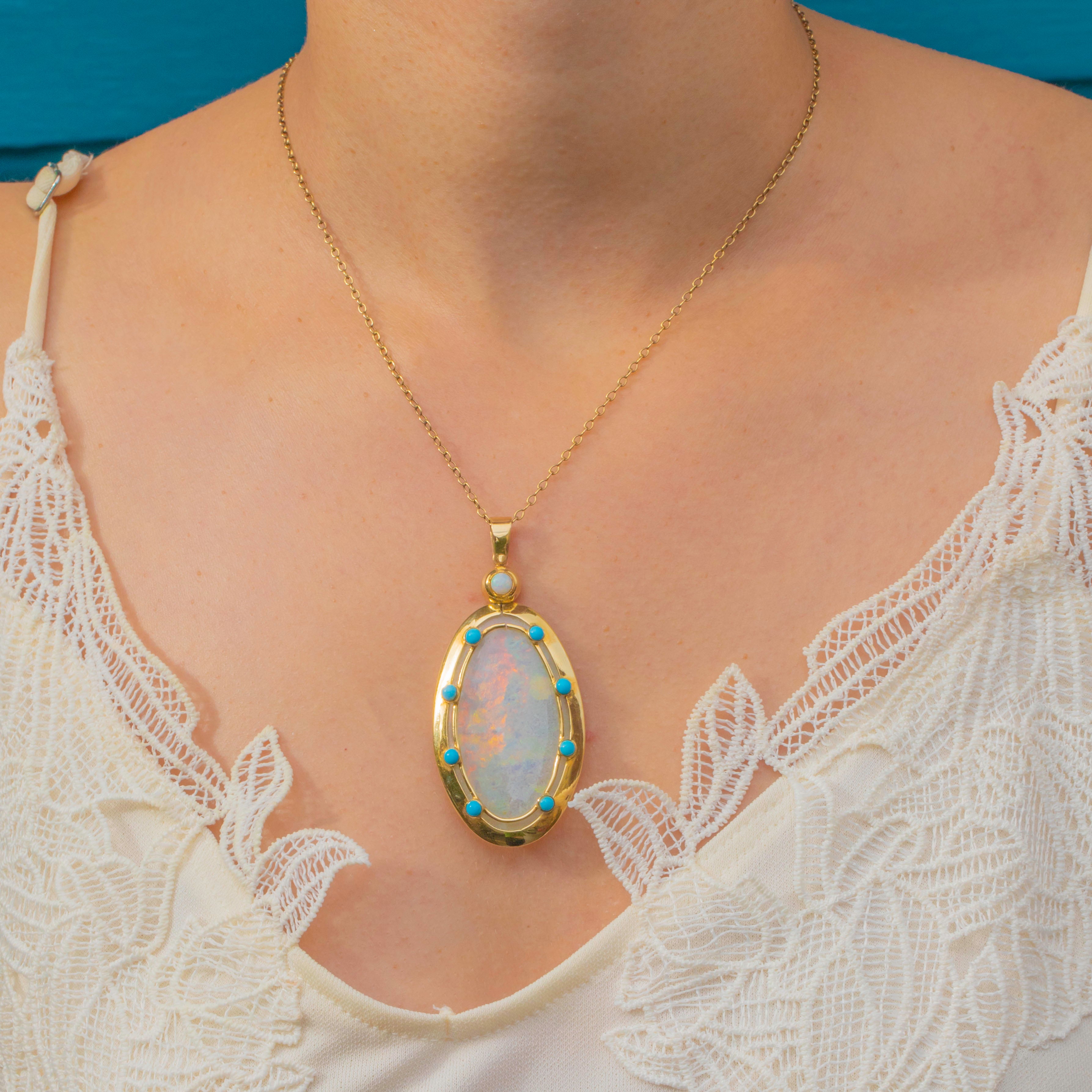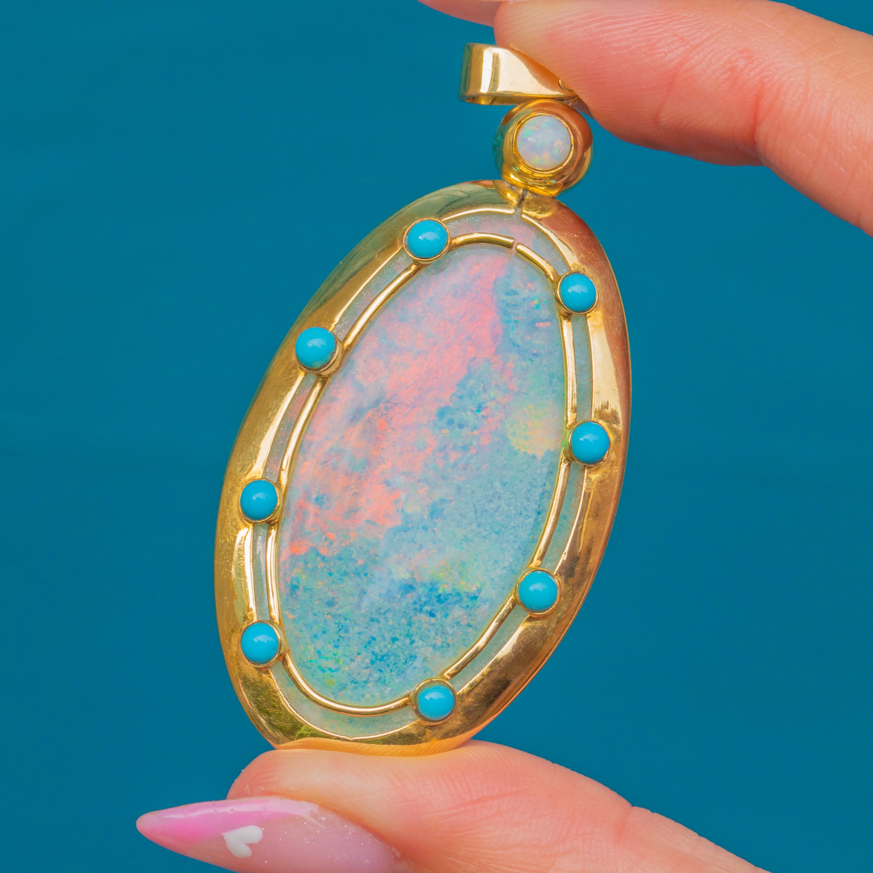 An extraordinary Mid-Century pendant showcasing a large 55.00ct Andamooka Opal set in luxurious 18ct Gold, framed by bright Turquoise cabochons. The natural Opal exhibits spectacular play-of-colour,  flashes of green, gold and blue that shift beautifully with movement. Treated to enhance its colourplay, this Australian gem is full of depth and life, a statement piece that captures the bold glamour of the 1950s–60s era.