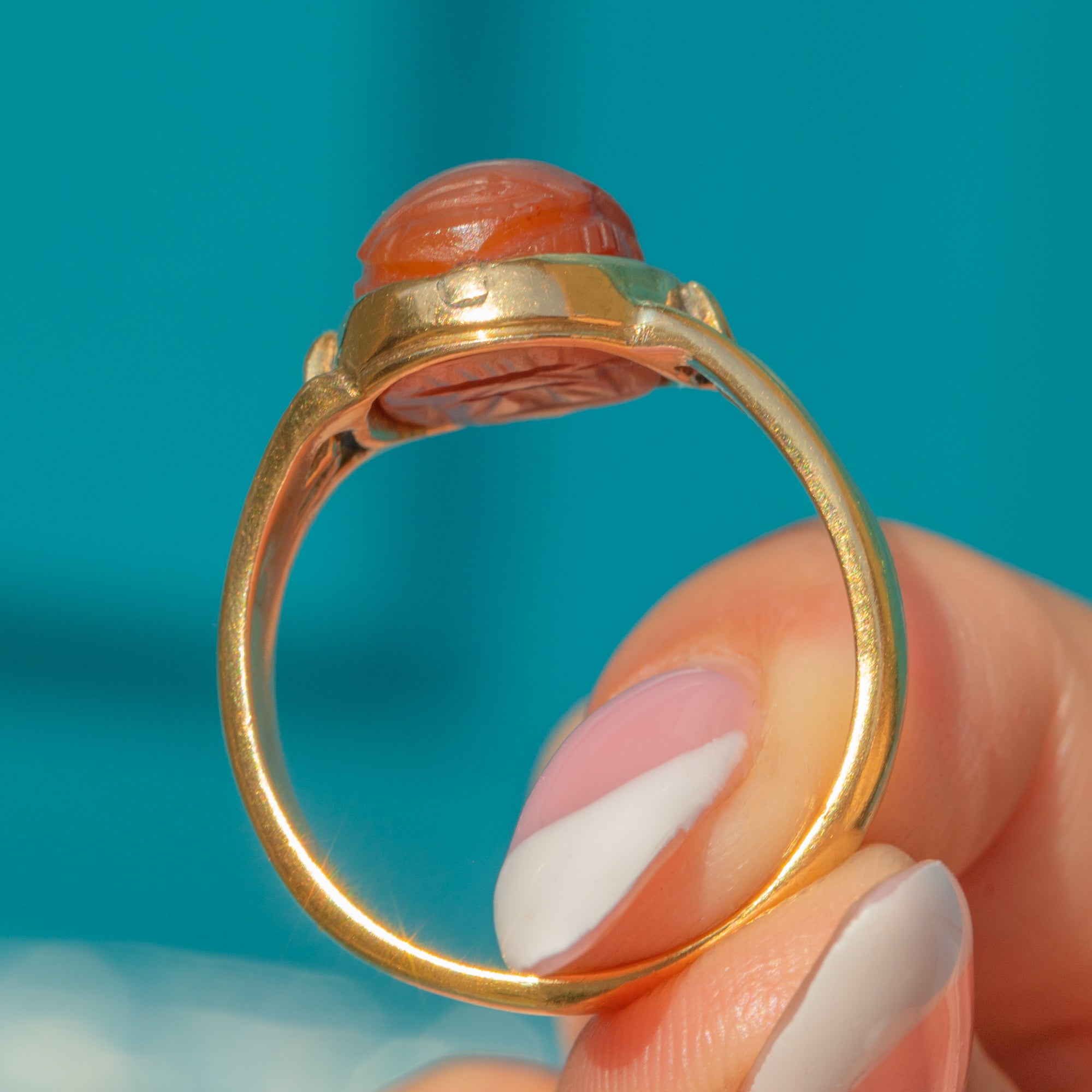 This vintage 18ct Gold Archaeological Revival ring features a finely carved Agate scarab, inspired by Ancient Egyptian symbolism of protection and rebirth.
