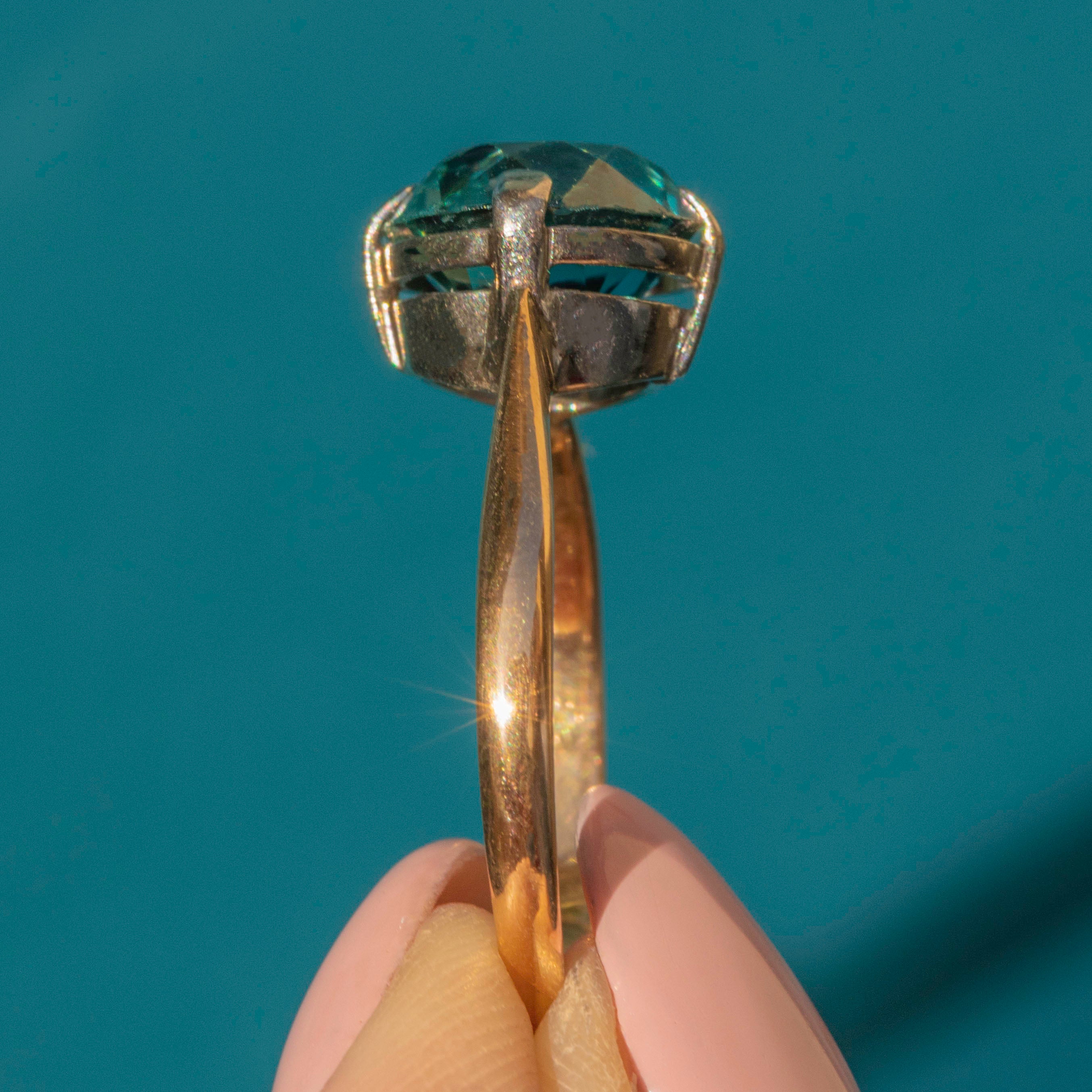 Her shank is crafted from 18ct yellow Gold, and the bright blue Zircon is held into place by robust 9ct white Gold claw settings. Blue Zircons are a wonderful stone for providing inner peace, and with this Art Deco solitaire ring you are sure to find it! Versatile and sophisticated, she will make the perfect addition to your collection.