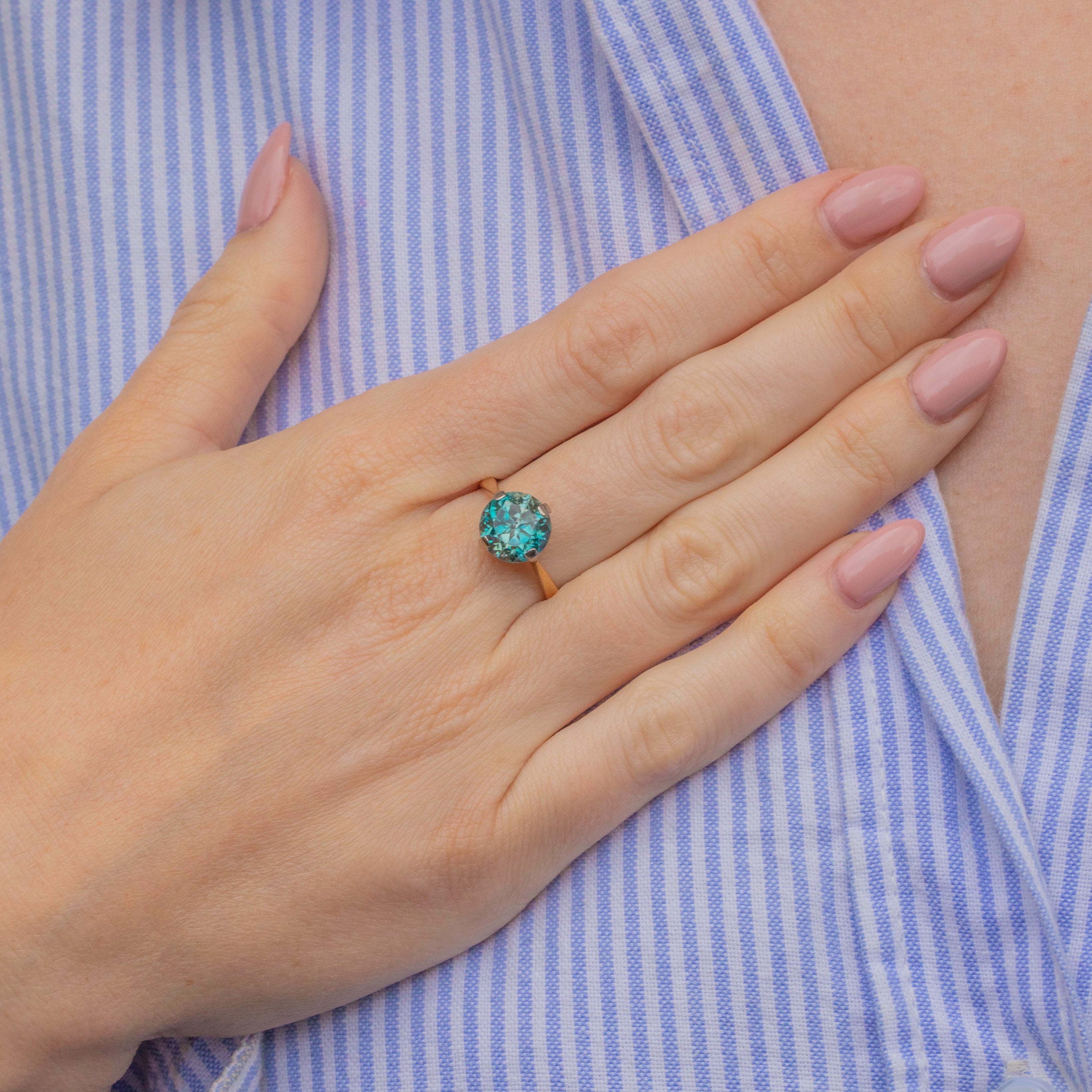 The Zircon is held securely in place by her 9ct White Gold claw settings, and rests gracefully on an 18ct yellow Gold band which is free from any visible signs of wear. Although unusual to see a combination of Gold finenesses in one ring, both parts appear original and it's likely the jeweller used 9ct settings, it would have been stronger and more durable than 18ct Gold at the time.