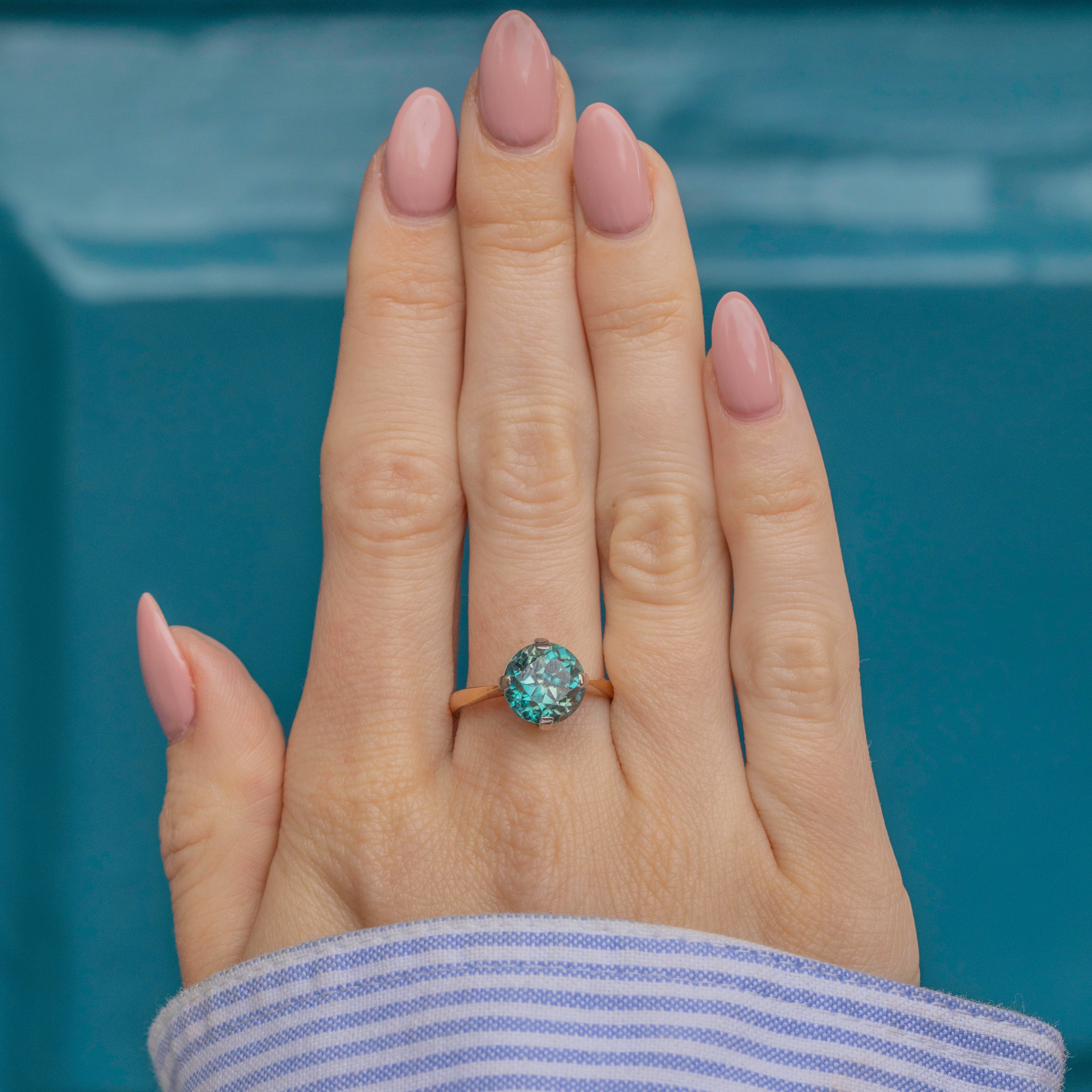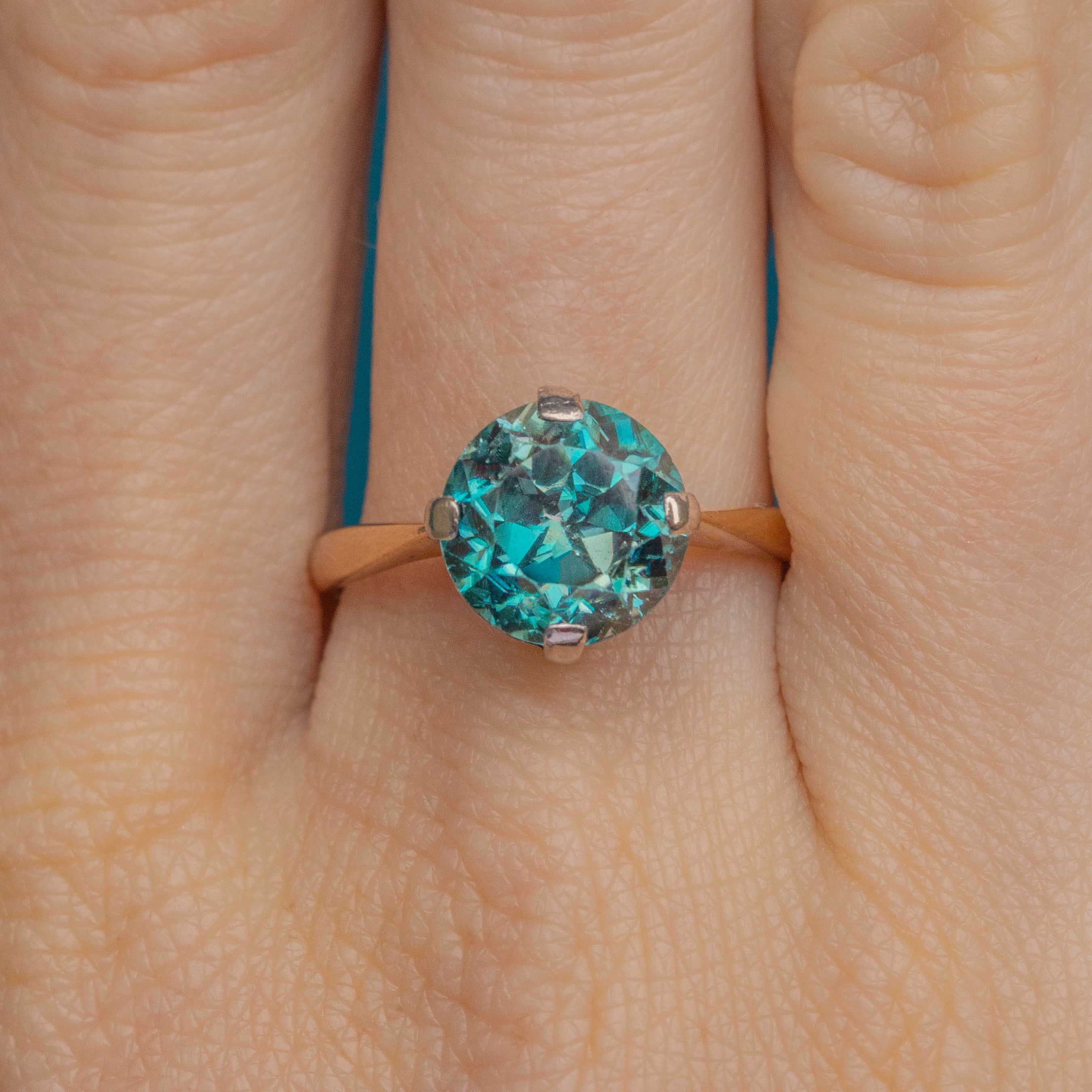 VERY GOOD-EXCELLENT. This Art Deco Blue Zircon solitaire ring is in wonderful condition. The blue Zircon captures the light wonderfully, radiating the most gorgeous teal and azure blue hues. She has some minor scuffs commensurate with age, however this does not detract from her beauty.