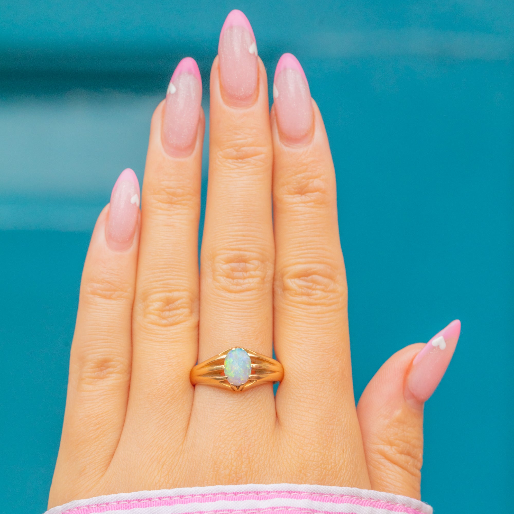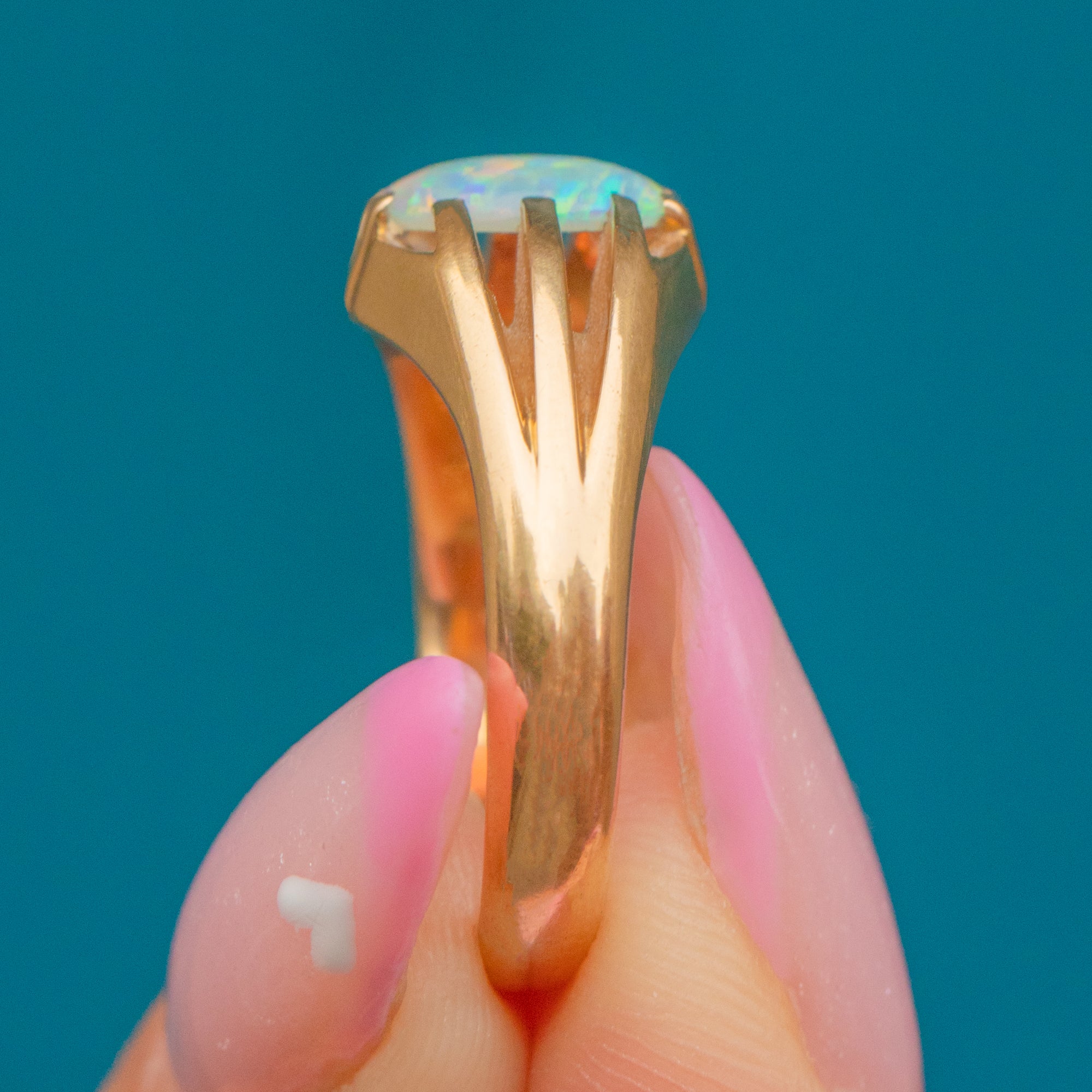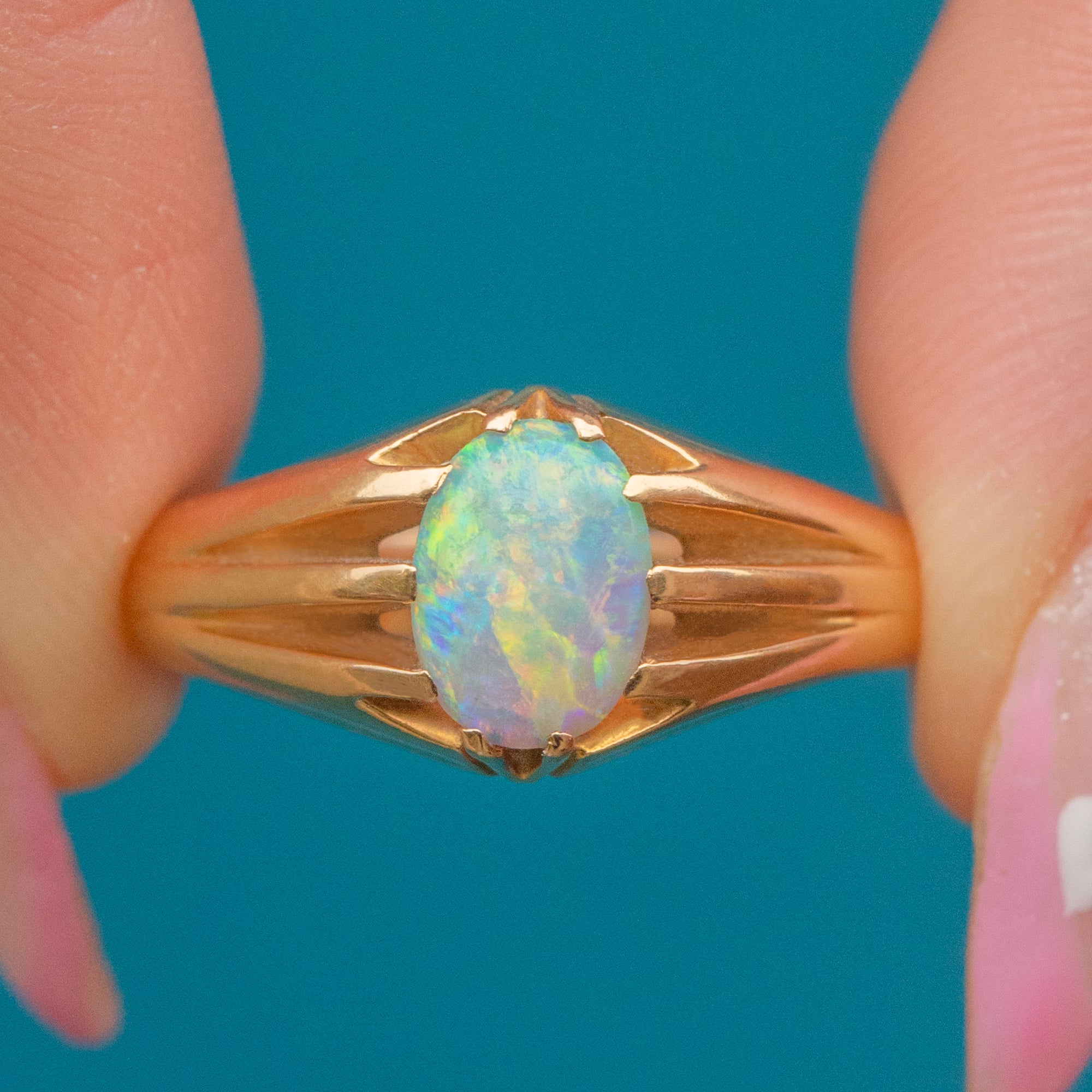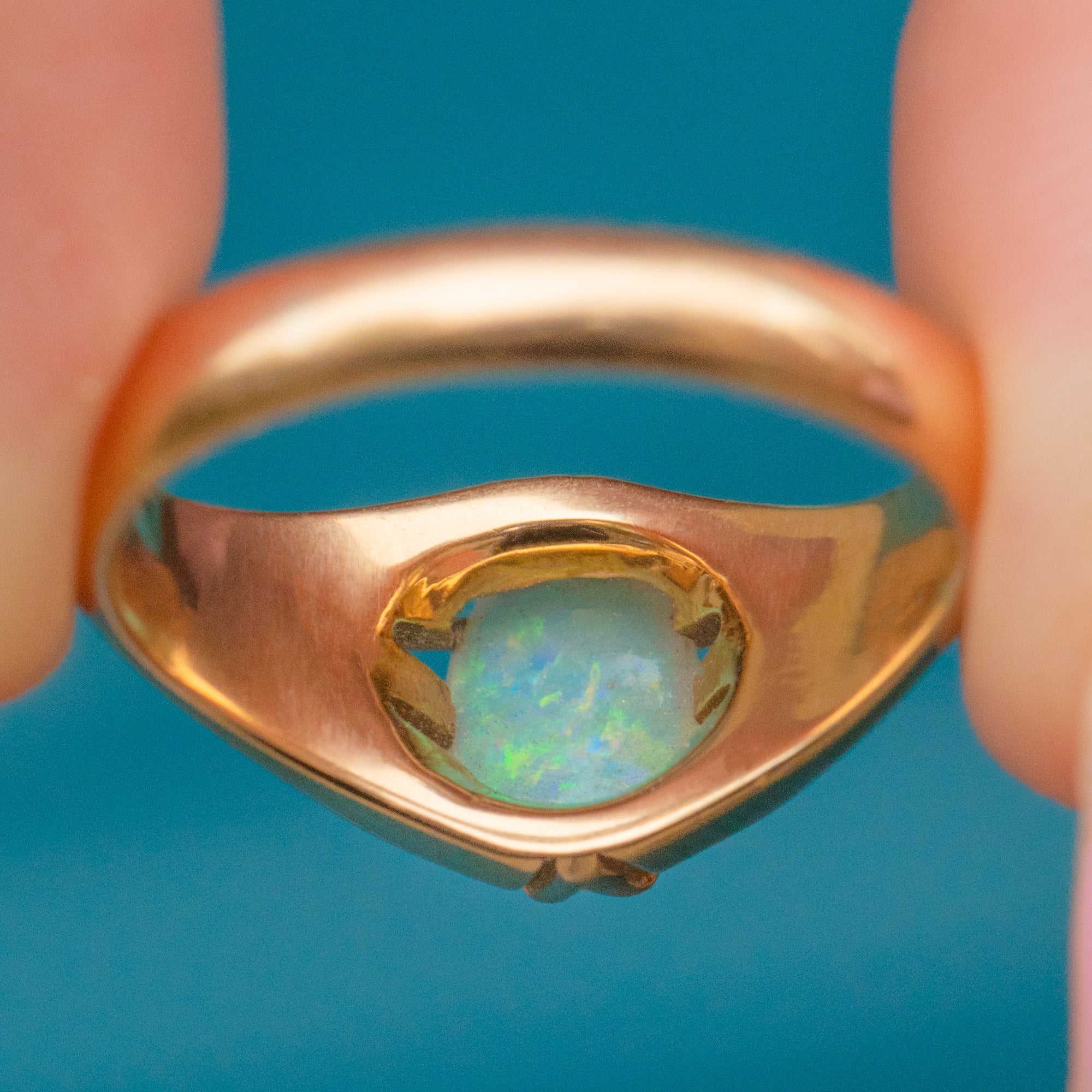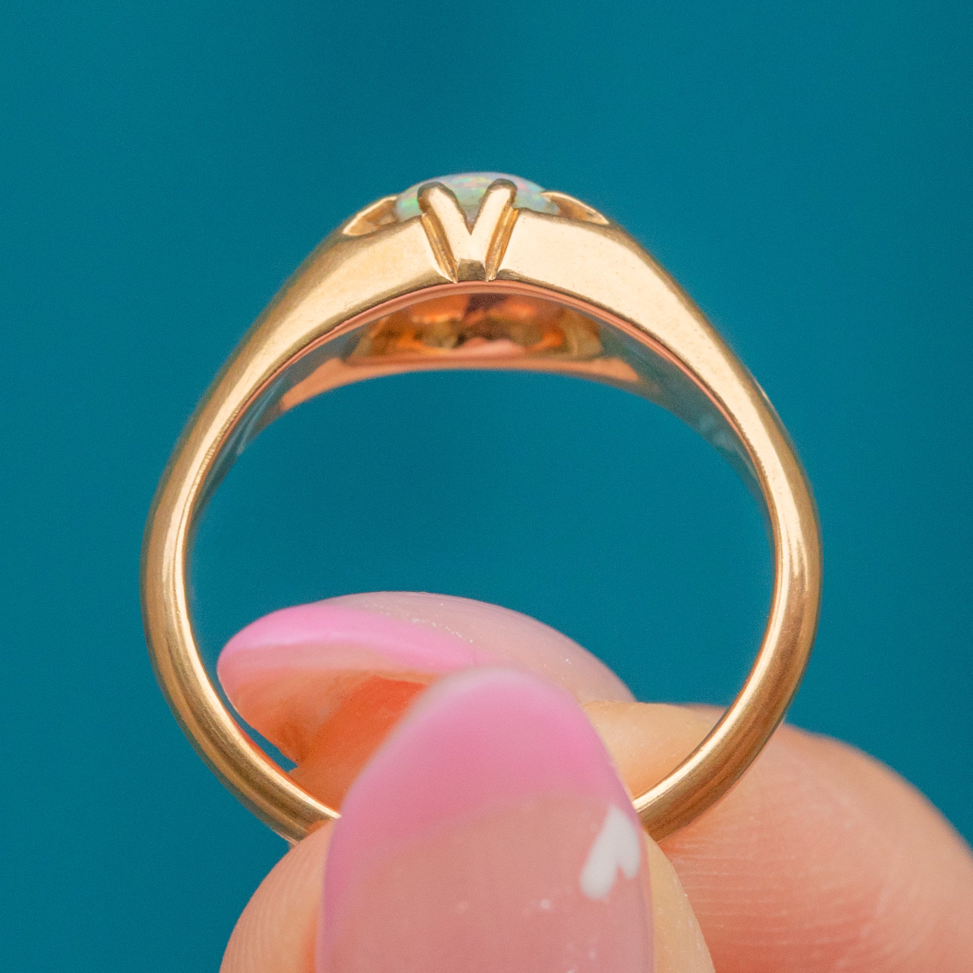 EXCELLENT: Beautiful antique condition with a vivid, well-preserved Opal showing strong play of colour. Hallmarks are slightly worn but still legible, and the Gold remains bright and smooth throughout. There is a visible resize mark at the back.