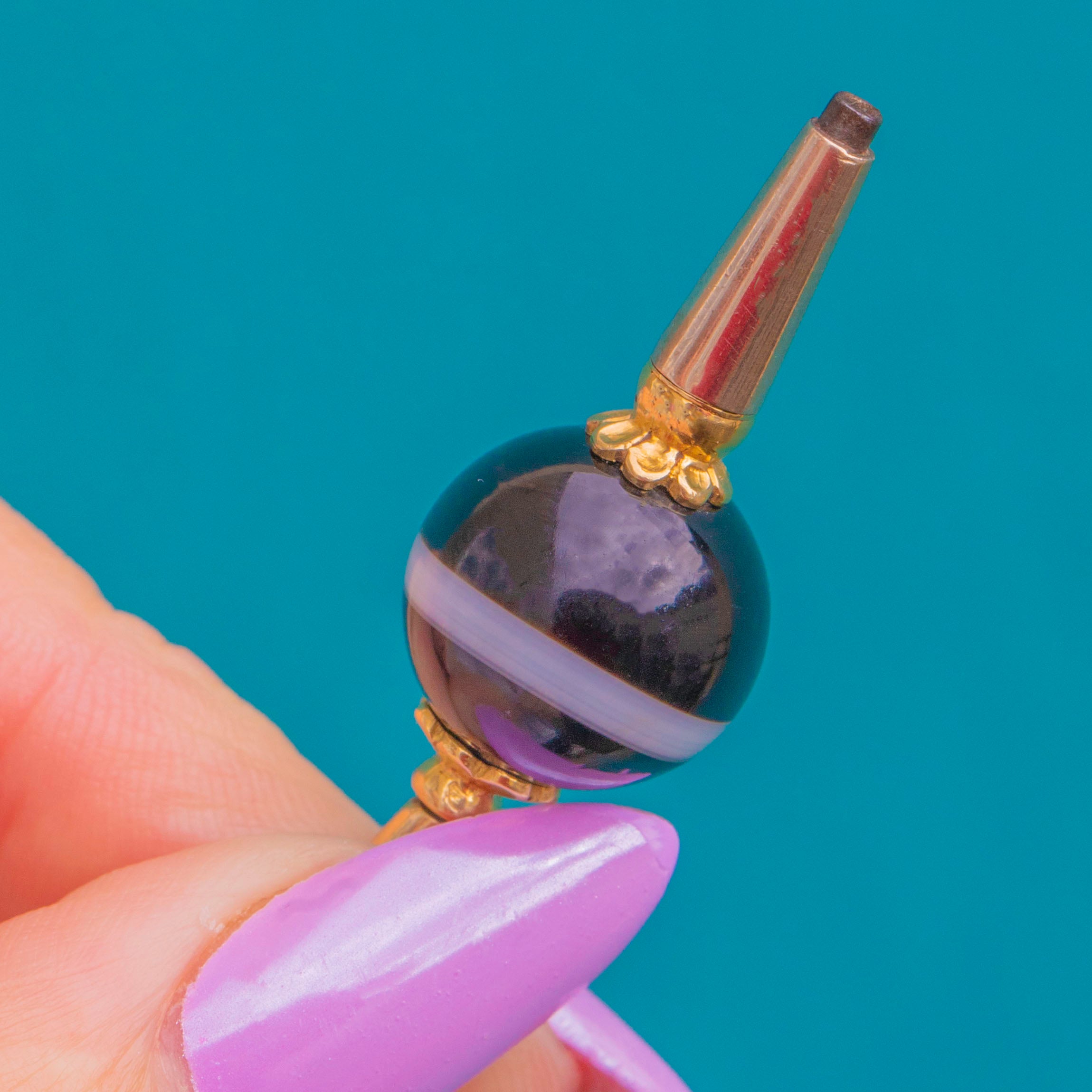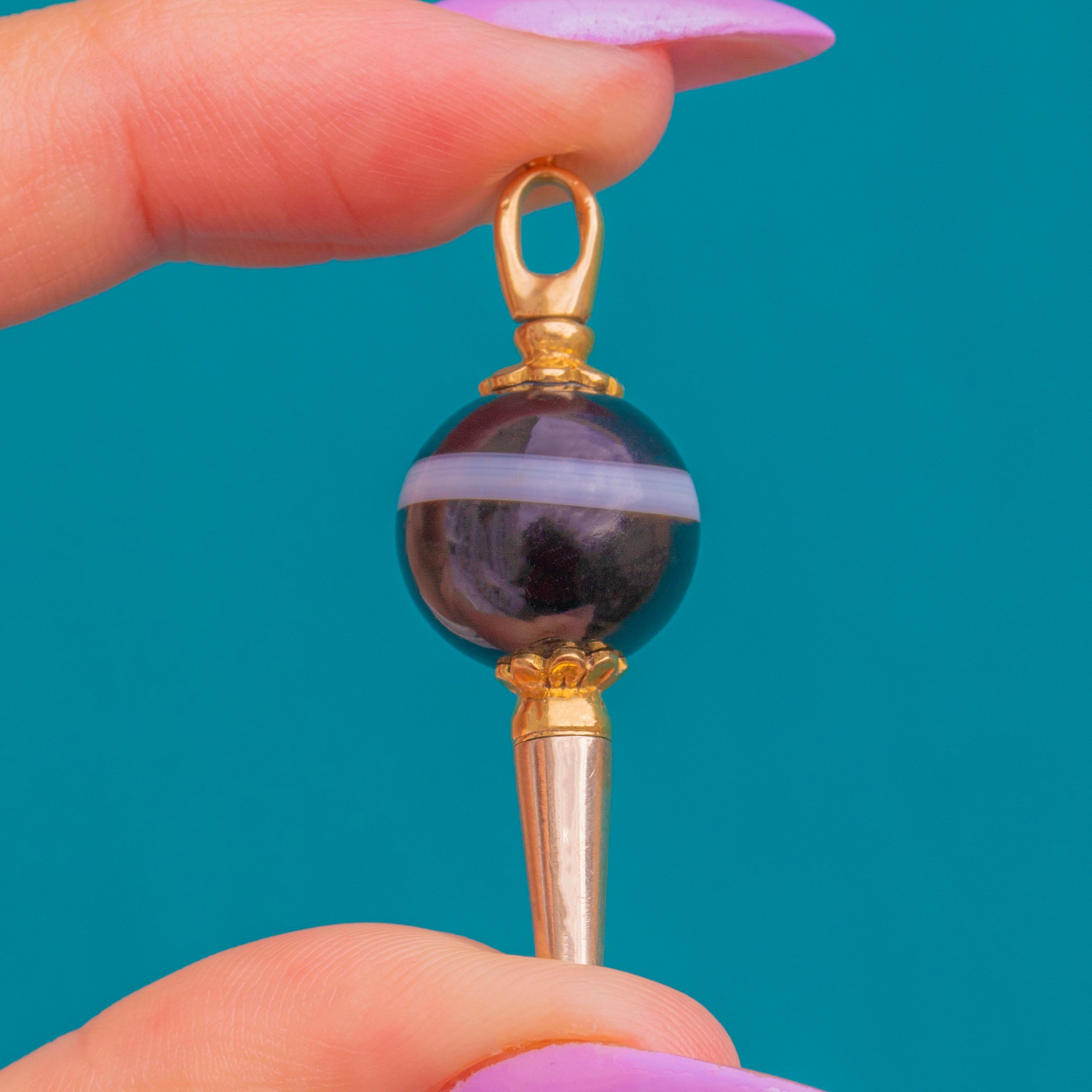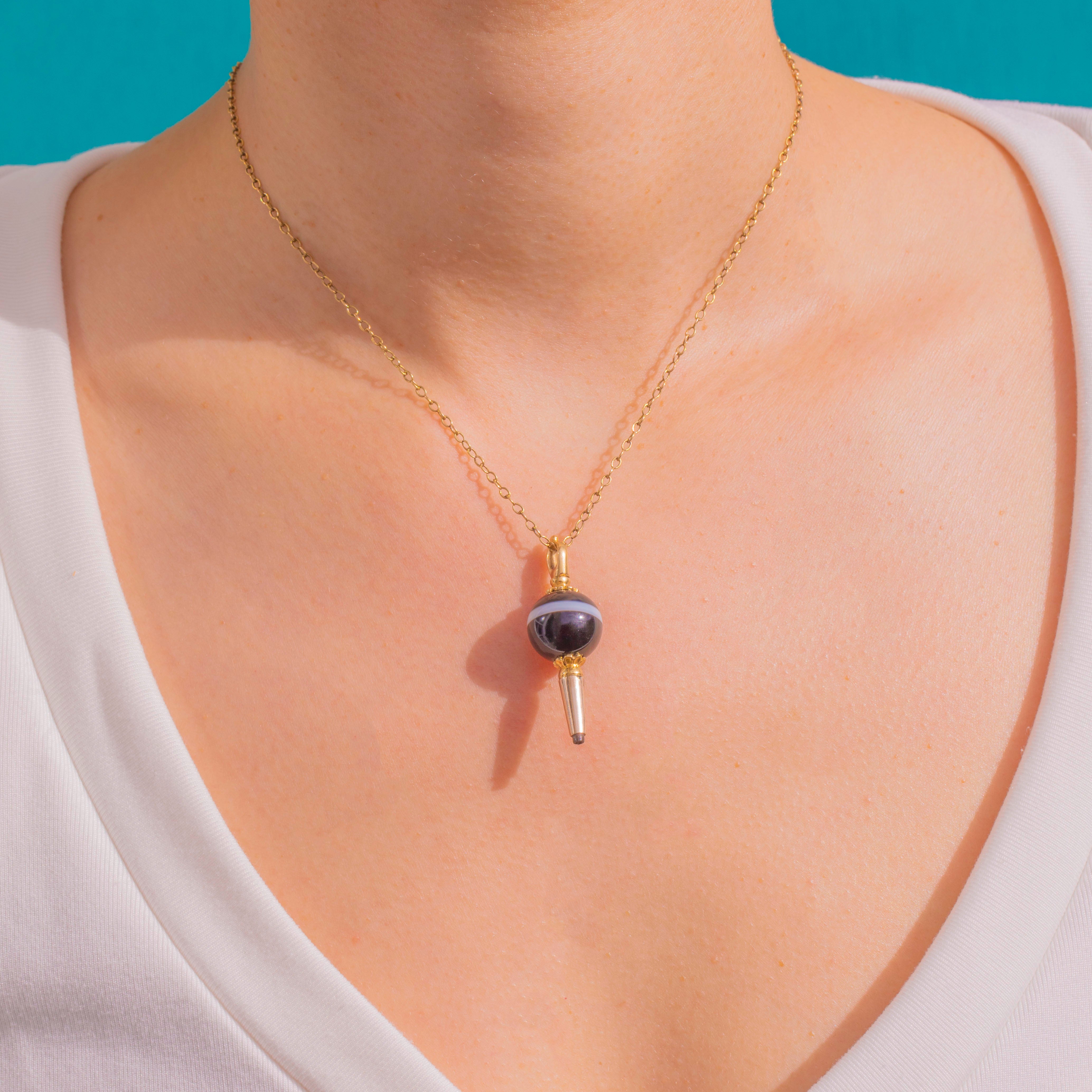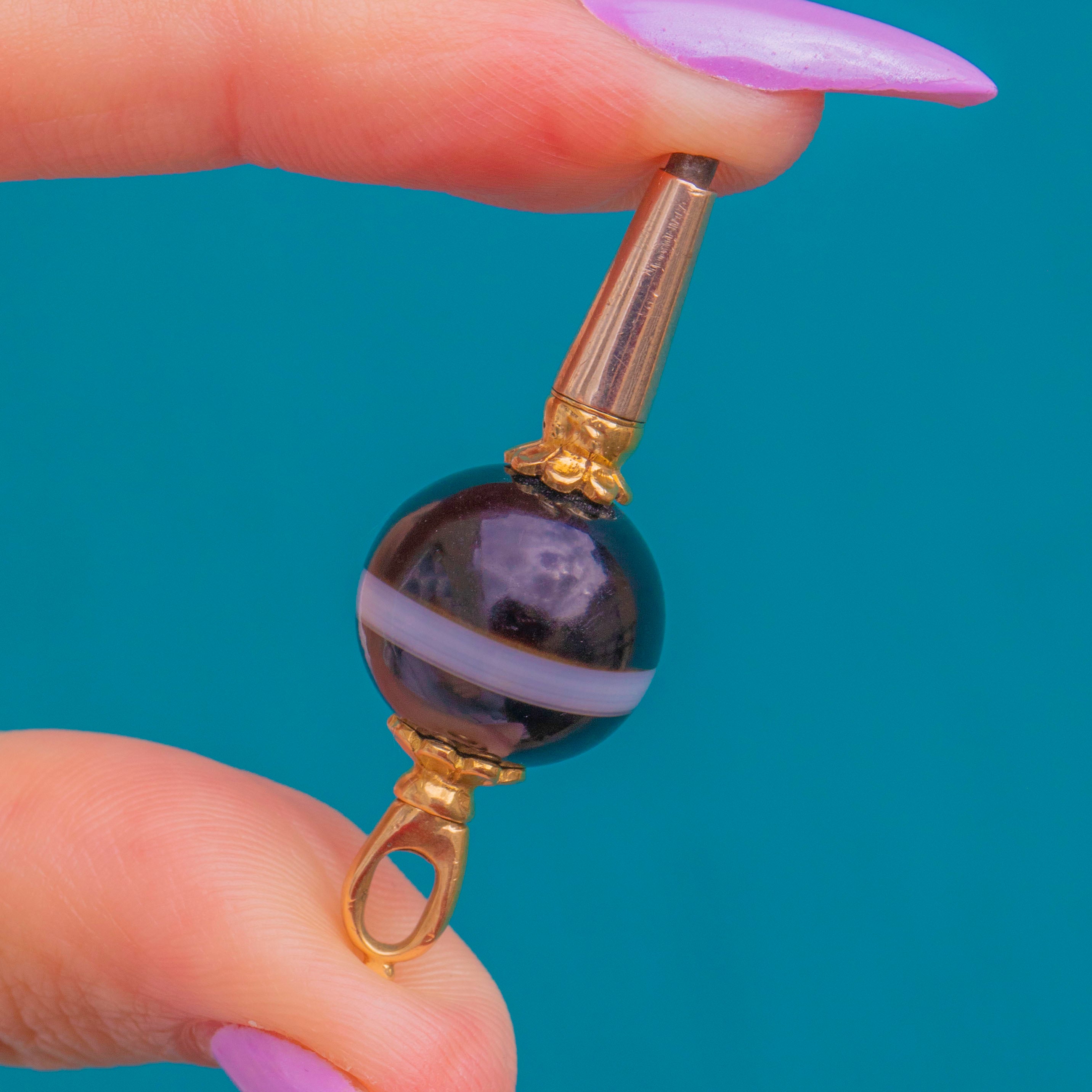Sleek, sculptural and unmistakably Victorian, this 18ct Gold pendant pairs a glossy Banded Agate orb with elegant Goldwork. The Agate shows a dramatic single pale band encircling a deep, inky body, creating a timeless, graphic focal point.
